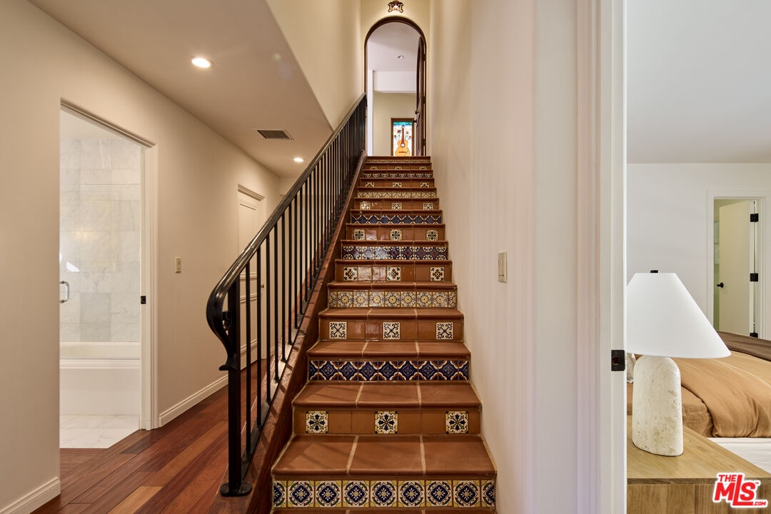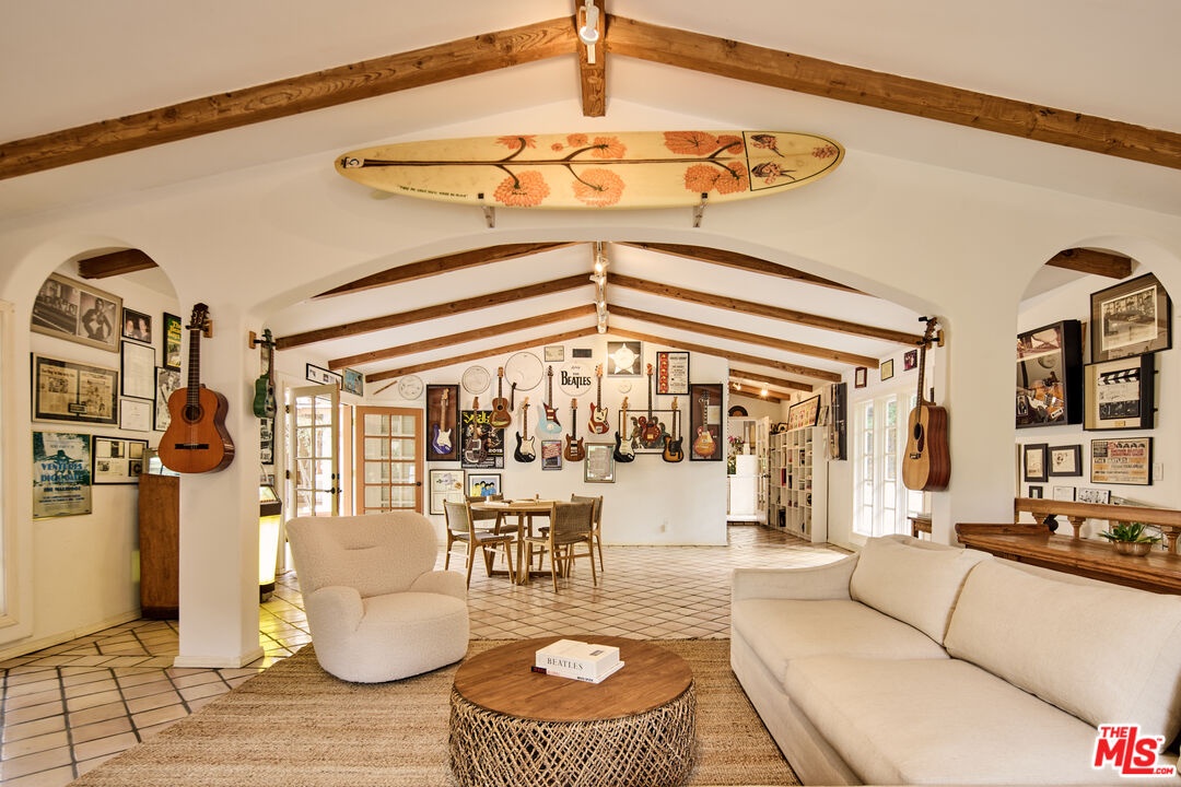 Enjoy privacy and exclusivity in Serra Retreat, the most beautiful guard gated community in Malibu. This remarkable 1.79-acre Spanish-style estate offers a rare combination of seclusion, luxury, and natural beauty. Set against a backdrop of lush landscapes, the 5-bedroom, 4.5-bathroom home offers sweeping mountain views, towering palms, mature oaks and a variety of fruit trees. The interior is defined by exposed beams, original Malibu tiles, and a dual-sided fireplace that warms both the living and dining areas. An additional family room provides a gathering space, perfect for relaxation. A chef's kitchen is equipped with top of the line appliances, while the luxurious primary suite offers a cozy fireplace, dual closets, a spa-like bath, private balcony, and secluded reading nook all looking out over the estate. The expansive grounds also feature a private vineyard, terraced amphitheater, resort-style pool and spa, and an outdoor kitchen complete with BBQ area and pizza oven, ideal for entertaining. Within walking distance is the Malibu Country Mart, with easy access to dining, shopping, and entertainment options, as well as some of Malibu's best surf spots, including the iconic Surfrider Beach.
