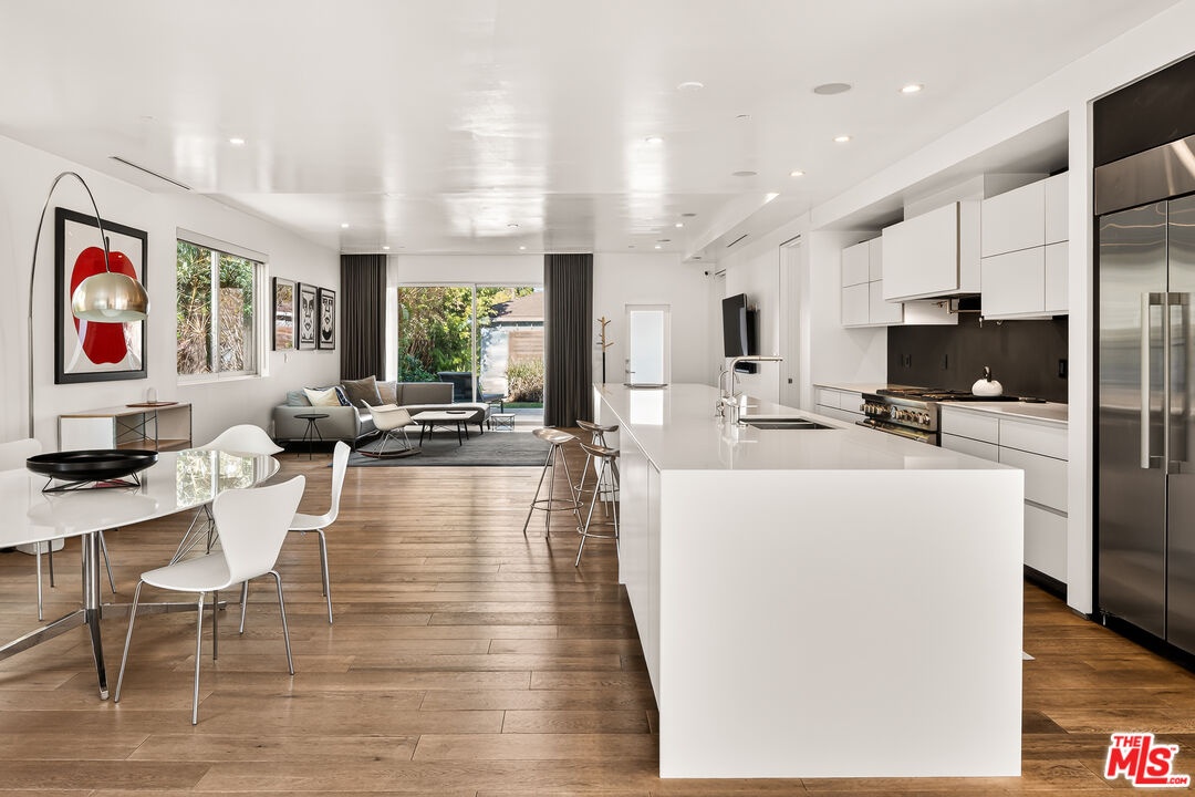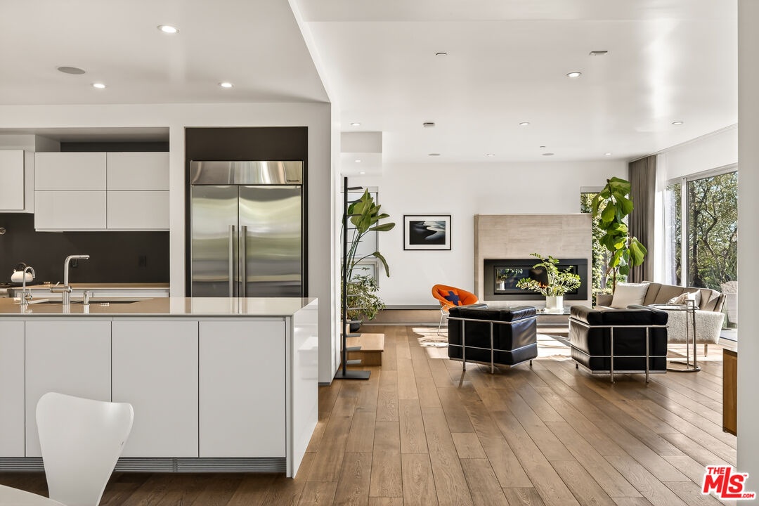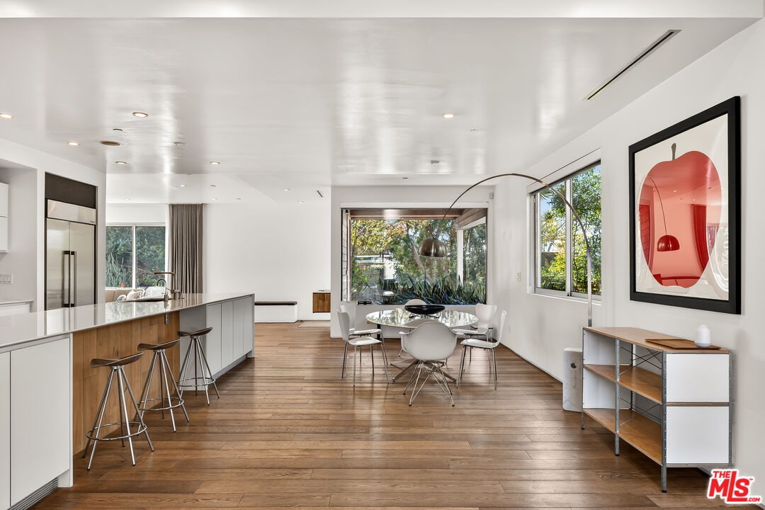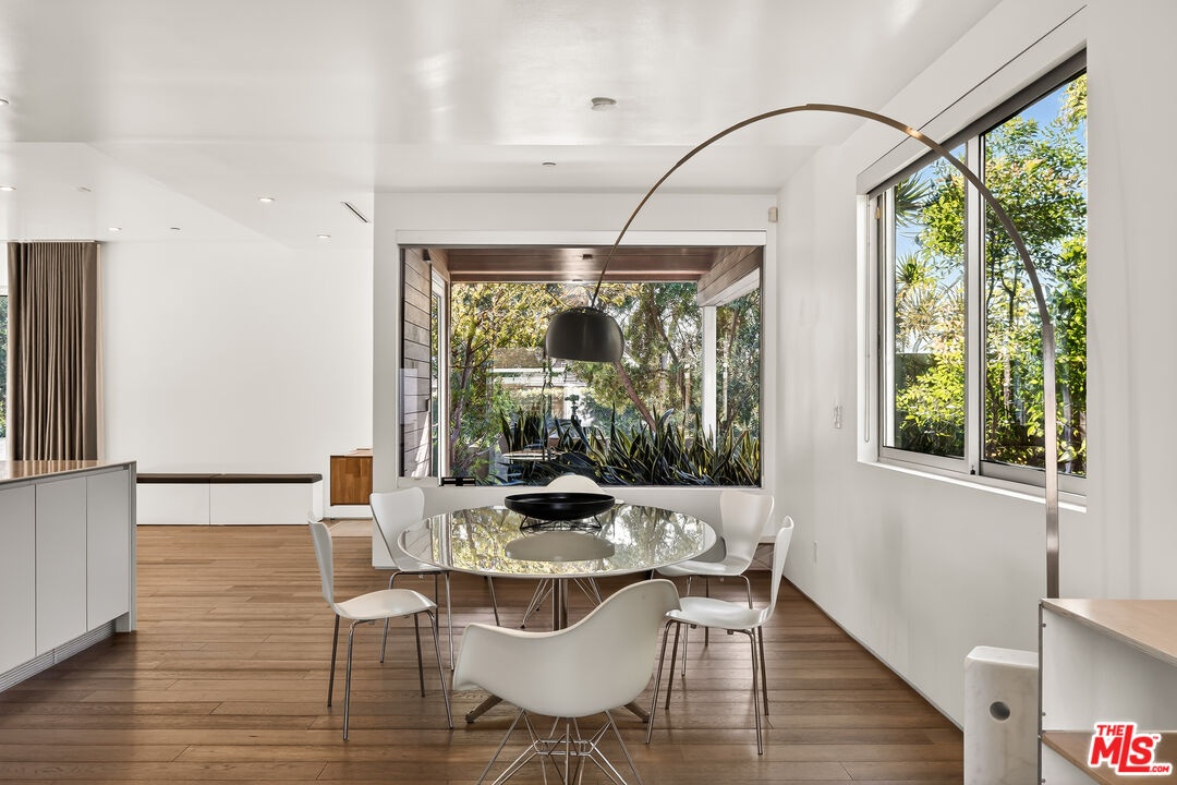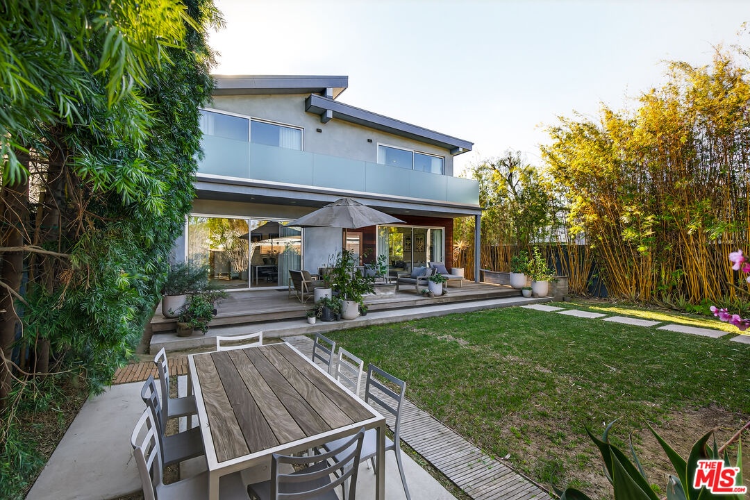 Perched on a gentle hill in the heart of Mar Vista, this 4-bedroom, 4-bathroom residence offers a rare sense of serenity just moments from the best of the Westside, providing a peaceful retreat with effortless access to Santa Monica, Venice, and Playa Vista while perfectly balancing privacy and convenience. Inside, sun-drenched open-concept living spaces are framed by beautiful white oak floors, with cork insulation upstairs for exceptional quiet. The chef's kitchen is both elegant and functional, featuring Thermador stainless steel appliances, a walk-in pantry, basalt backsplash, quartz countertops, a generous center island, and a U-Line wine fridge for your favorite vintages. Designed for both comfort and entertaining, the seamless indoor-outdoor flow opens to inviting gathering spaces and a sunset-view deck. All upstairs bedrooms feature en-suite baths, including a luxurious primary suite with a spa-inspired bathroom, soaking tub, separate shower, and dual vanity. A downstairs bedroom offers flexibility for guests or a refined home office, while an upstairs den provides the perfect reading nook or workspace. Modern conveniences include dual-zone HVAC with advanced air filtration, Wi-Fi-controlled fans, integrated ceiling speakers, tankless water heaters, a security system with cameras, and a garage with added storage. The vibrant neighborhood places beloved local favorites like Little Fatty, Rose and Abbot Kinney, and Alana's Coffee just moments away - offering an exceptional lifestyle in one of Mar Vista's most coveted enclaves.