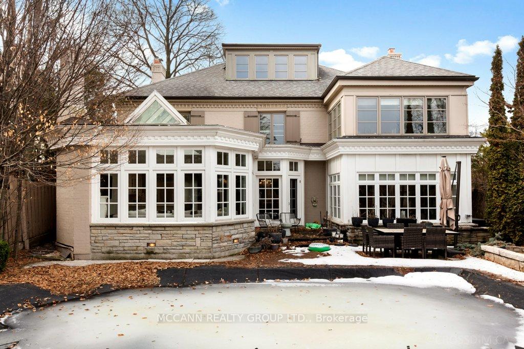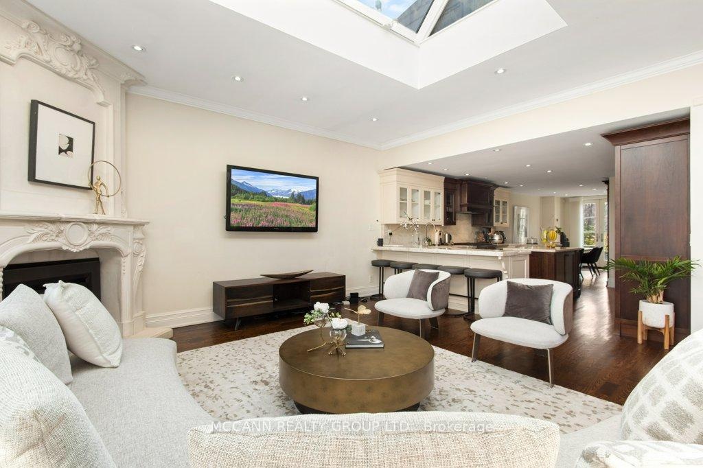 Nestled on one of Lawrence Park's most desirable streets, this beautifully appointed three-storey home offers exceptional space, comfort, and timeless style for modern family living. Featuring 4+1 bedrooms, generous principal rooms, and elegant finishes throughout, the thoughtfully designed layout provides both functionality and sophistication. The main level showcases a bright, open-concept family room anchored by a stunning chef's kitchen complete with striking onyx countertops and premium appliances, including a Wolf six-burner gas range. Abundant cabinetry, ample counter space, and both breakfast bar and eat-in dining options make this kitchen ideal for everyday living and entertaining alike. Separate living and dining rooms provide refined spaces for hosting, highlighted by a charming wood-burning fireplace in the living room. Two additional gas fireplaces, located in the family room and the primary bedroom, add warmth and character. The upper levels offer spacious, well-proportioned bedrooms designed to accommodate a growing family. The finished lower level features a large recreation room and a versatile nanny or guest suite, currently configured as a media room with built-in speakers. Step outside to a private backyard retreat featuring a pool perfect for summer entertaining, outdoor dining, and relaxation. Additional highlights include a private drive and built-in garage. Ideally located just minutes from top-rated schools, including Blythwood Junior Public School, beautiful green spaces such as Sherwood Park, and the shops and restaurants along Yonge Street, this home offers an exceptional opportunity to live in one of Toronto's most sought-after neighbourhoods.
