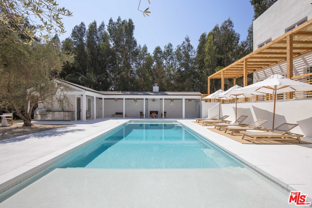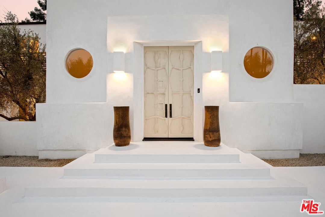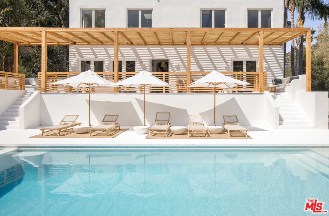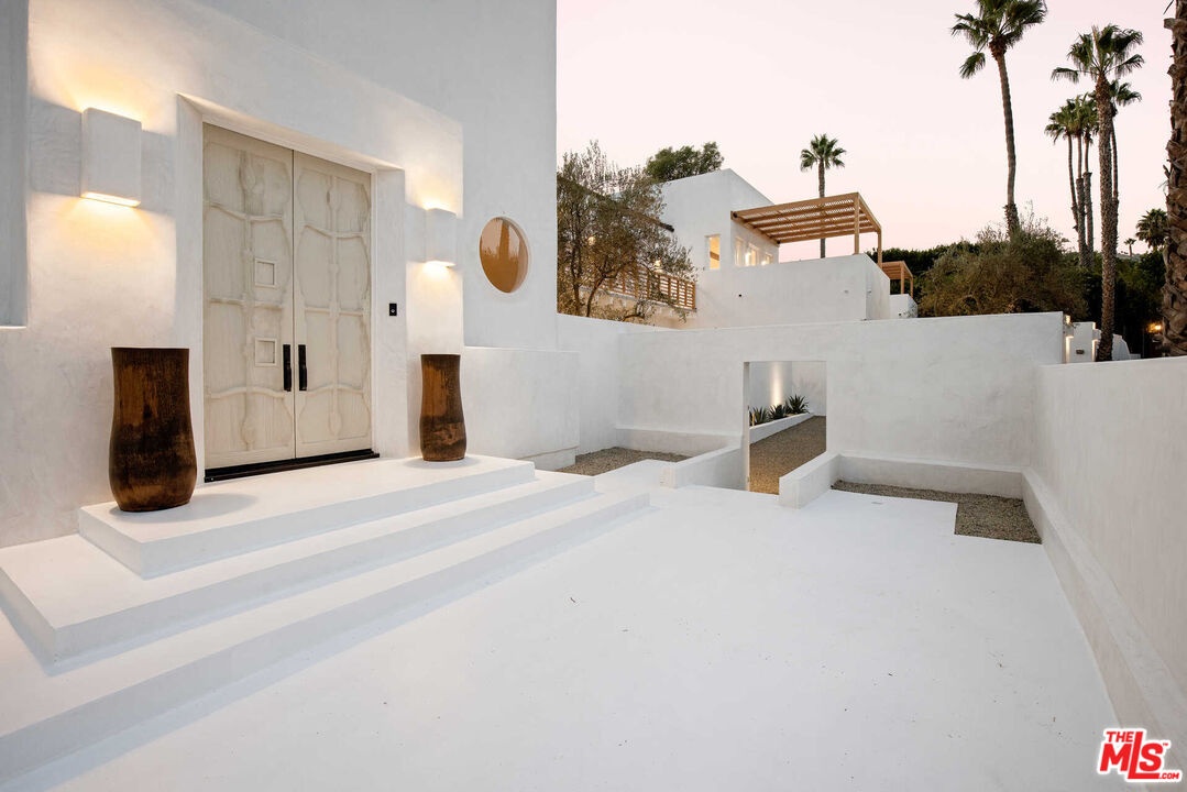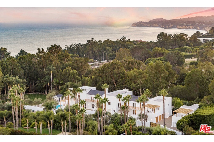 This Malibu estate is a modern, Santorini-inspired masterpiece, blending California's casual elegance with Greek resort luxury. Behind two private gates lies a palm-lined property with mature olive and fruit trees. In the main residence, impeccable craftsmanship greets you at every turn. Enjoy a bright living room with 30-foot ceilings, a gourmet kitchen with Caesarstone countertops, tadelakt bathrooms, an office, library, and gym. Designed for effortless entertaining, the home features an audio system, theater, bar, wine cellar, and game room. Dazzling ocean views and a lavish primary suite await on the second floor. Explore the grounds, with winding paths, a pool and spa, volleyball court, guest house, and three-car garage. Moments from Escondido Beach and Geoffrey's Restaurant, this tranquil and private estate feels a world away.