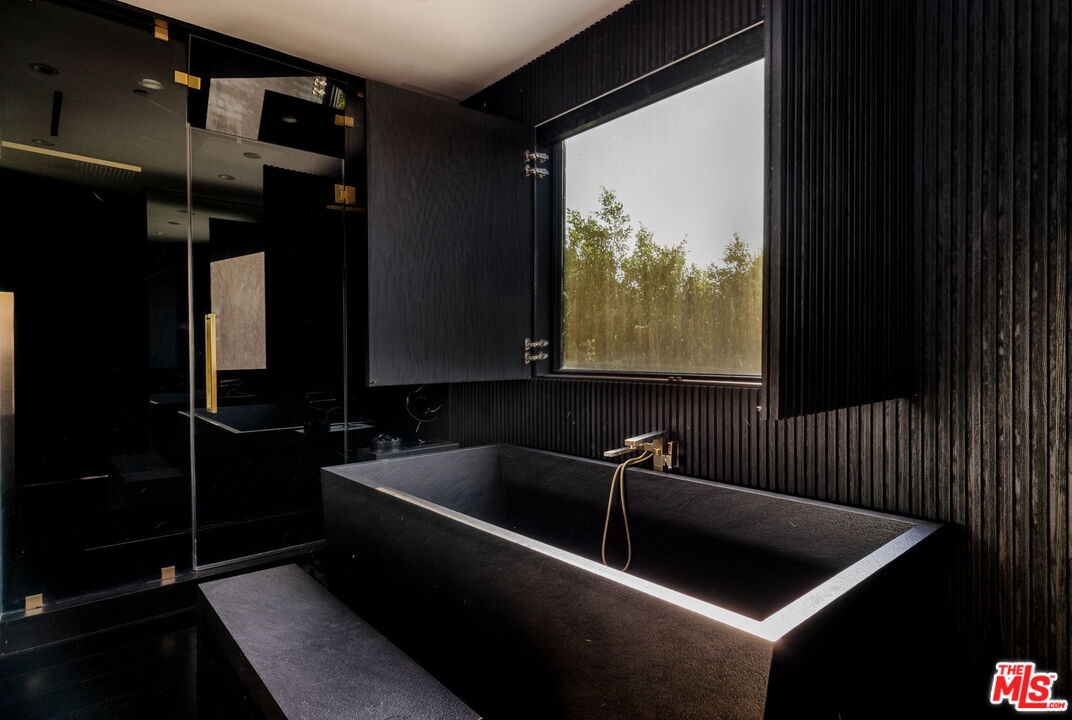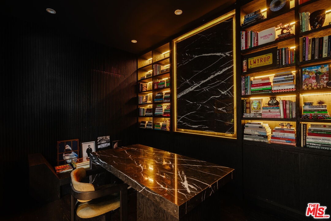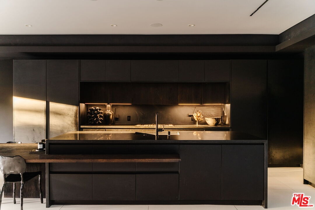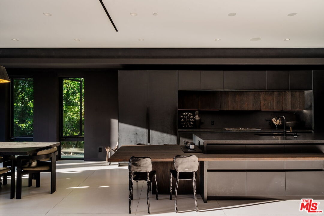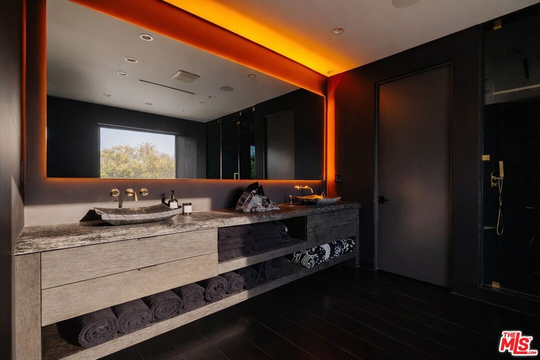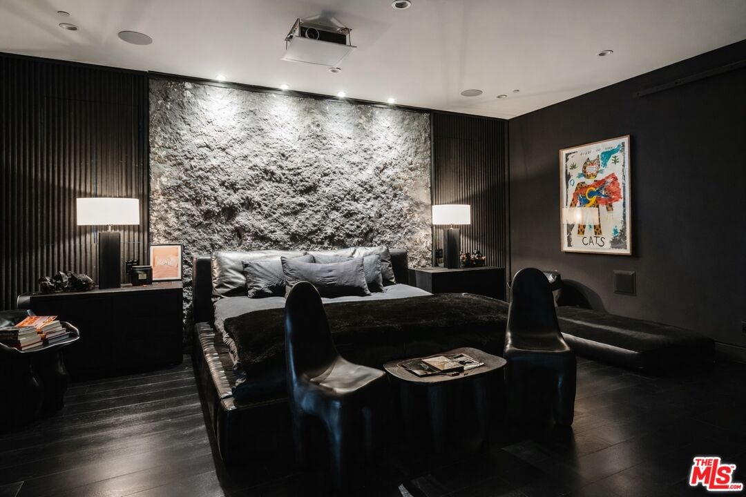 Welcome to 537 N Alta Vista Blvd, an exquisite modern masterpiece built in 2020, offering 4,312 sq ft of curated living space on a secure and gated 7,700 sq ft lot. Through the striking smoked-glass accent entry door, guests are welcomed into a generous open floor plan featuring soaring ceilings and designer finishes throughout. Just off the entry is a sophisticated office featuring custom built-in shelving crafted from Japanese flamed shou sugi ban wood, black Venato marble accents, custom lighting, and a recording studio. The sleek gourmet chef's kitchen is equipped with dual wall ovens, an espresso machine, a custom walk-in pantry, and an oversized center island with a prep sink and integrated breakfast table. The kitchen flows seamlessly into the dining area and spacious living room, complete with a stone fireplace, custom bookshelves, and floor-to-ceiling pocket doors that open to the ultimate entertainer's backyard. Upstairs, the luxurious primary suite features a dramatic custom wall of raw Pierre Blue stone imported from Belgium, bespoke Japanese flamed shou sugi ban woodwork, a projector screen, fireplace, private balcony, and two generous walk-in closetsone of which includes a custom pink rose onyx makeup room. The spa-like primary bath offers a custom dual vanity with Black Zimbabwe stone, heated floors, a Japanese soaking tub, an oversized glass rain shower, and a separate water closet with a Toto toilet. Two spacious en-suite guest bedrooms complete the upper level. Designed for year-round entertaining, the oversized backyard features a sparkling pool with elevated spa, outdoor BBQ center, grassy lawn, fire pit, and an enclosed cabana with outdoor bathroom. Additional amenities include a Control4 smart home automation system, koi pond, security cameras, a water filtration system, and surround sound throughout. This home exemplifies the very best of California living, located near some of the world's finest restaurants, shopping, and entertainment. Showings by appointment only with 24 hours notice.