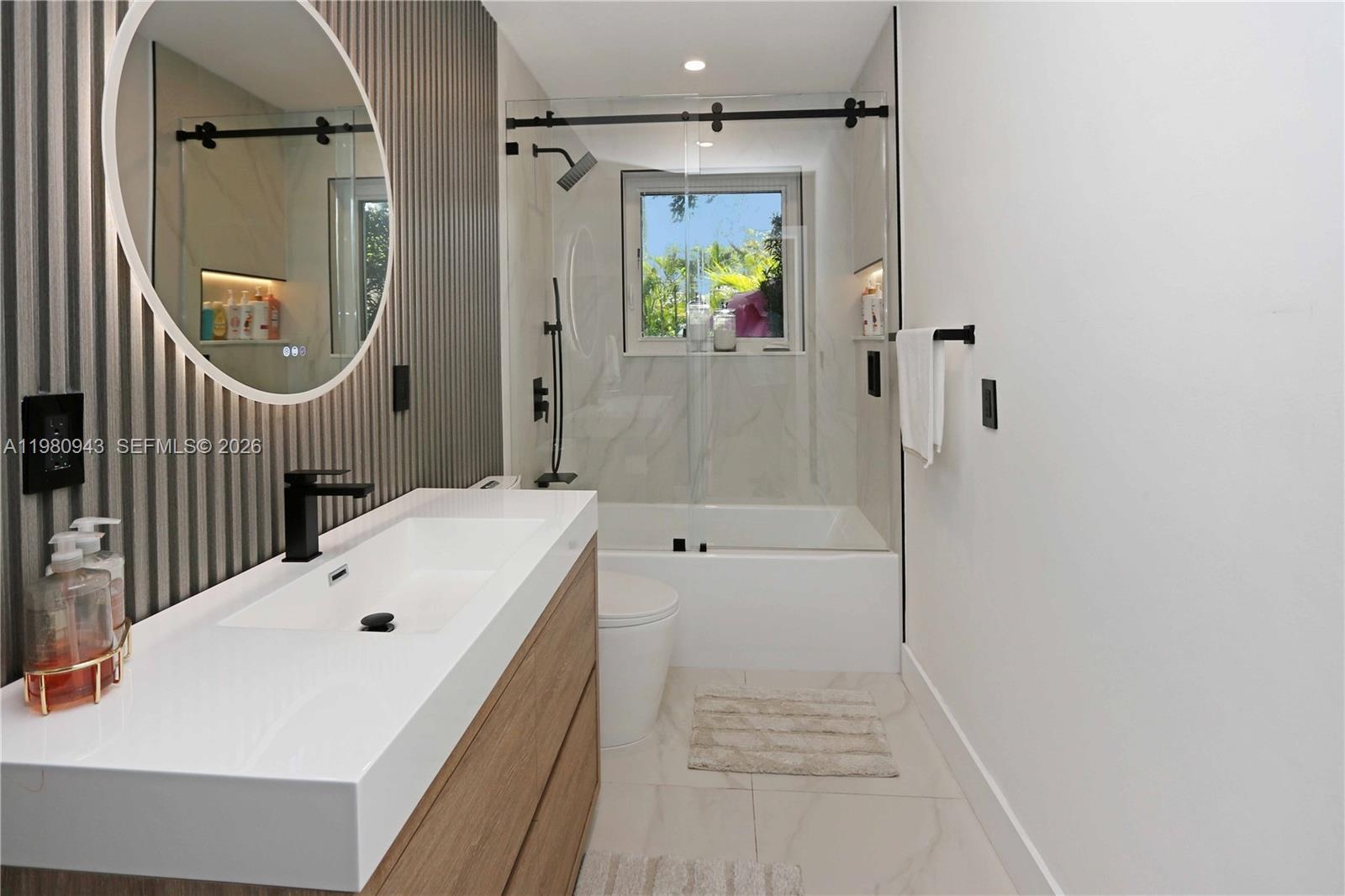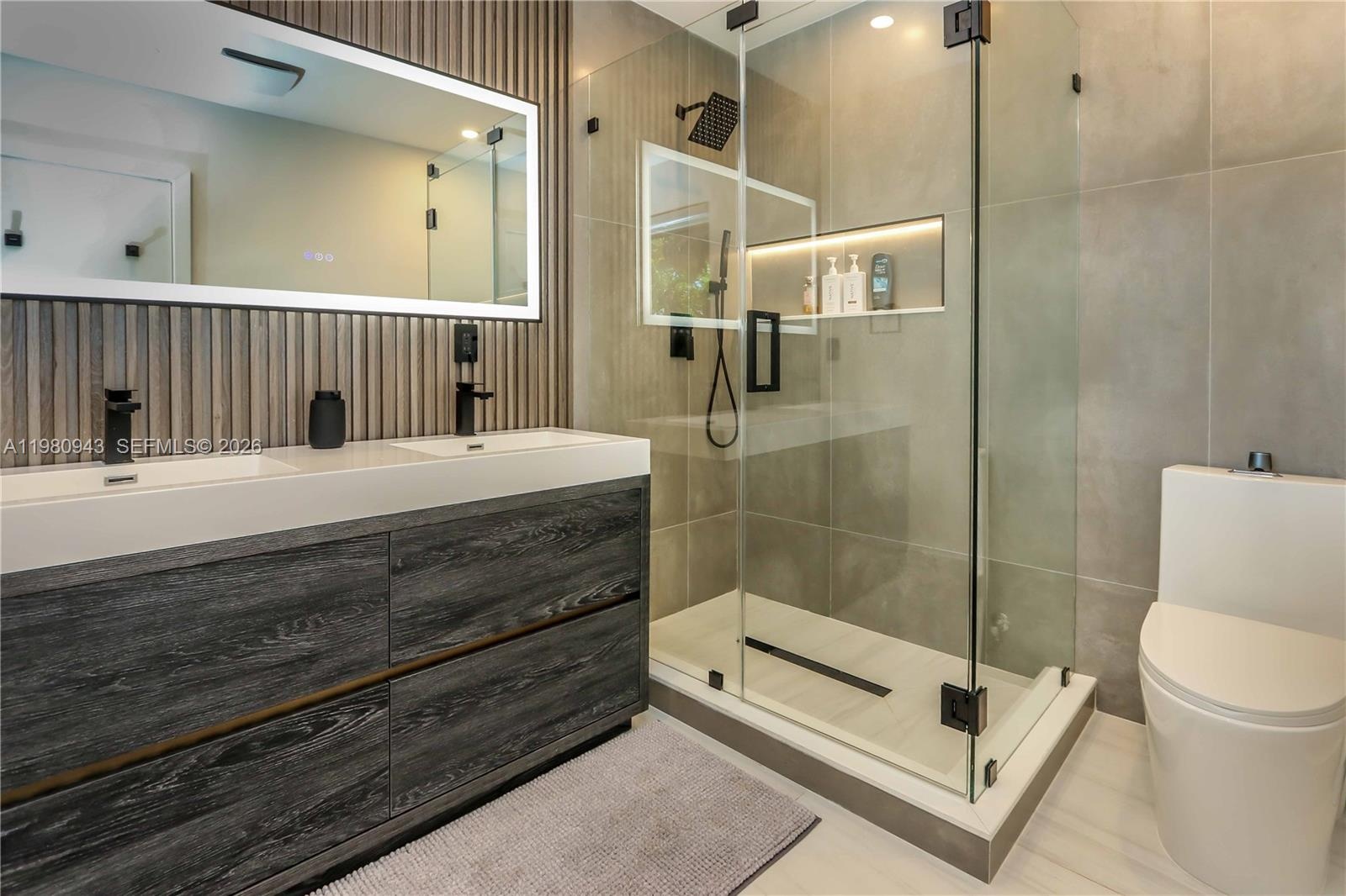 The home offers generously sized bedrooms, with large closets in three of the bedrooms and a versatile fourth bedroom currently used as an office. An oversized family room provides even more living space for gatherings, movie nights, or relaxing with loved ones. Updated bathrooms feature modern finishes with tub and shower combinations, while the primary bathroom includes double sinks and a sleek glass-enclosed shower.