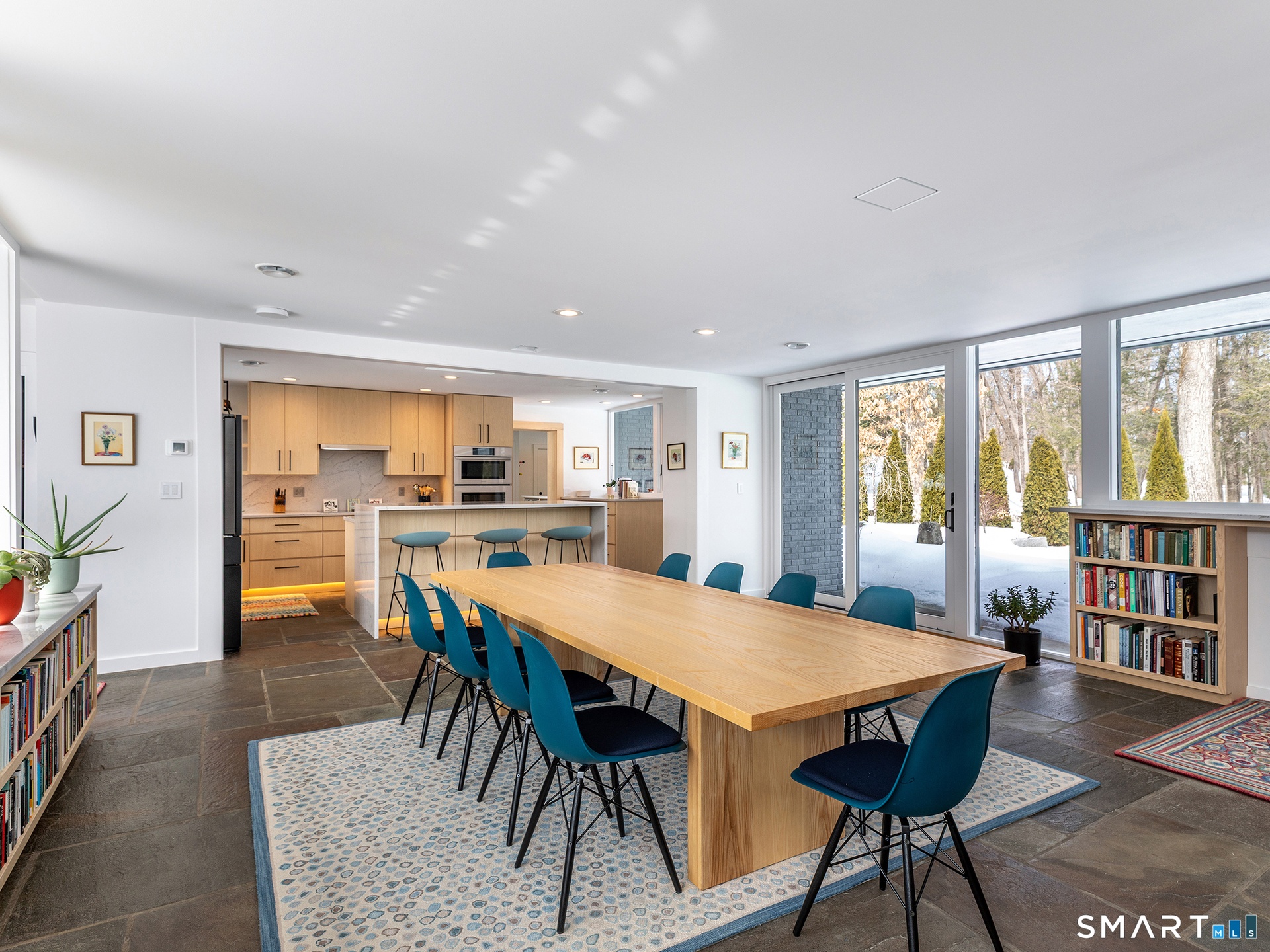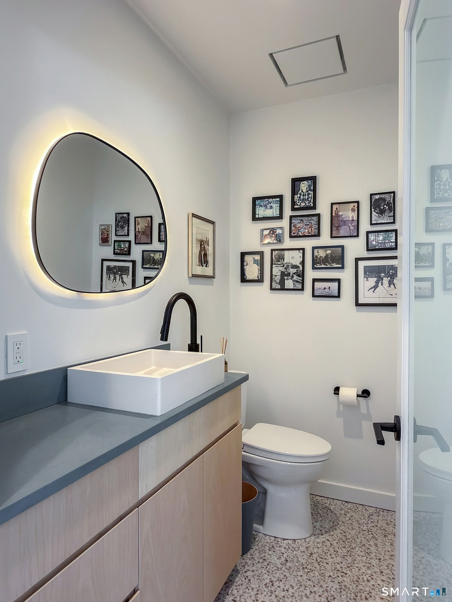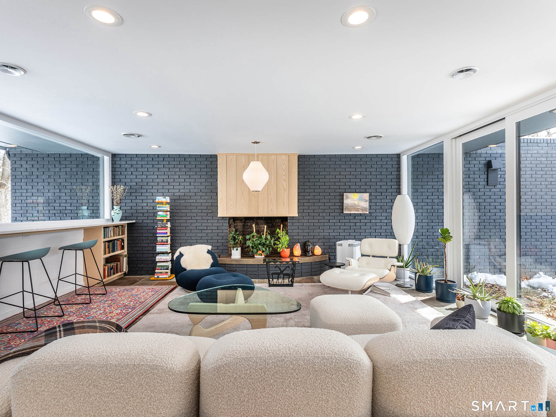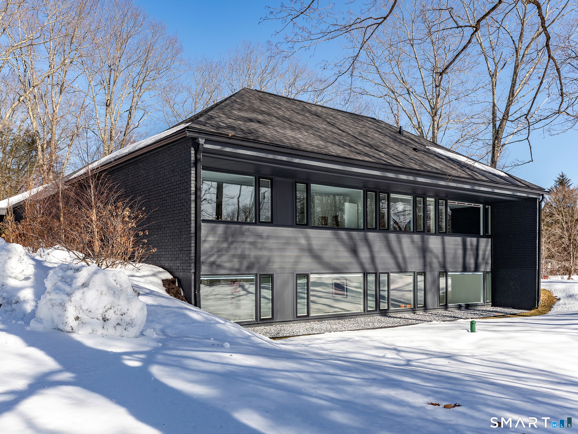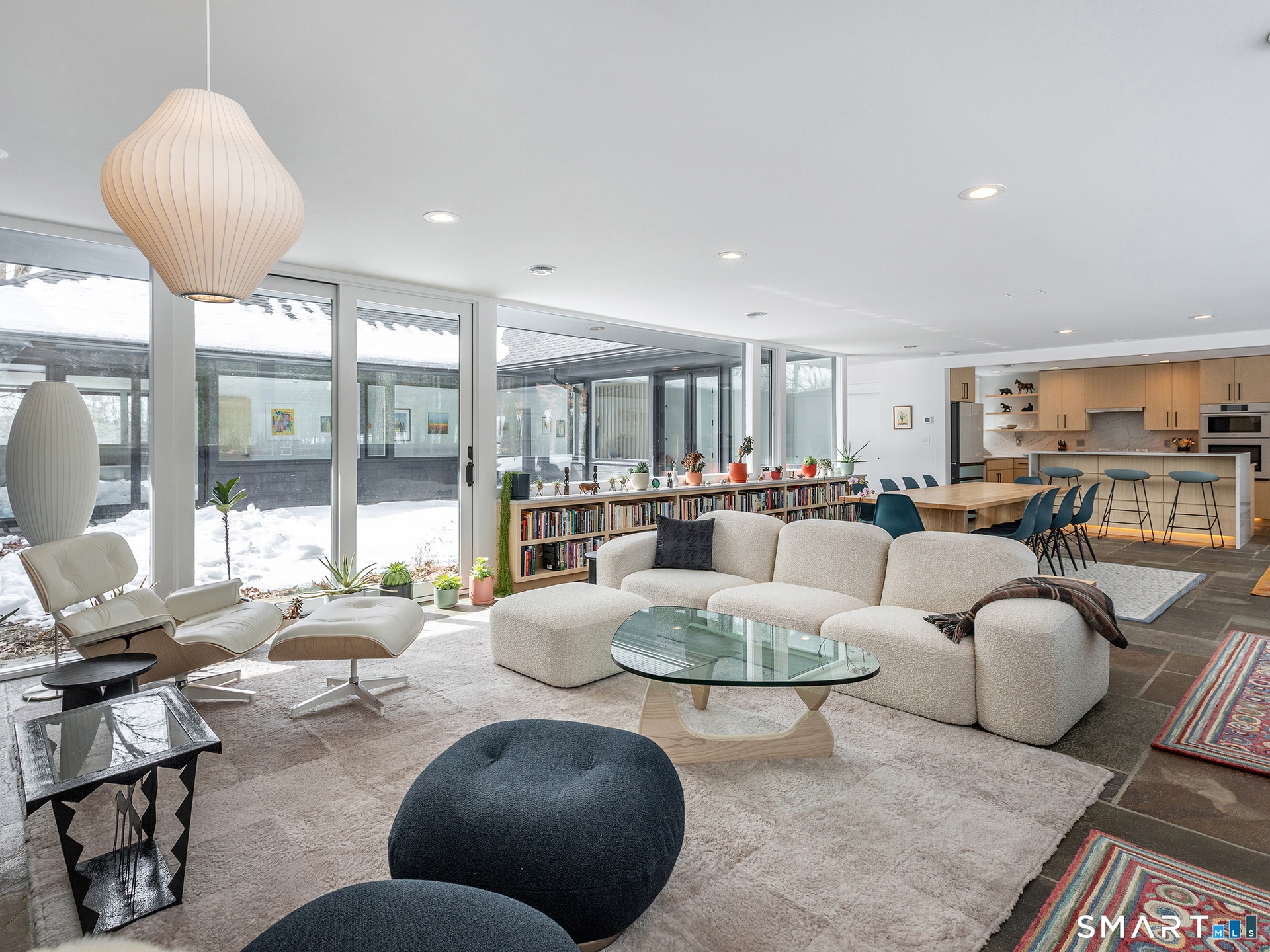 This beautifully reimagined Mid Century home sits on a picturesque stretch of the Bantam River.