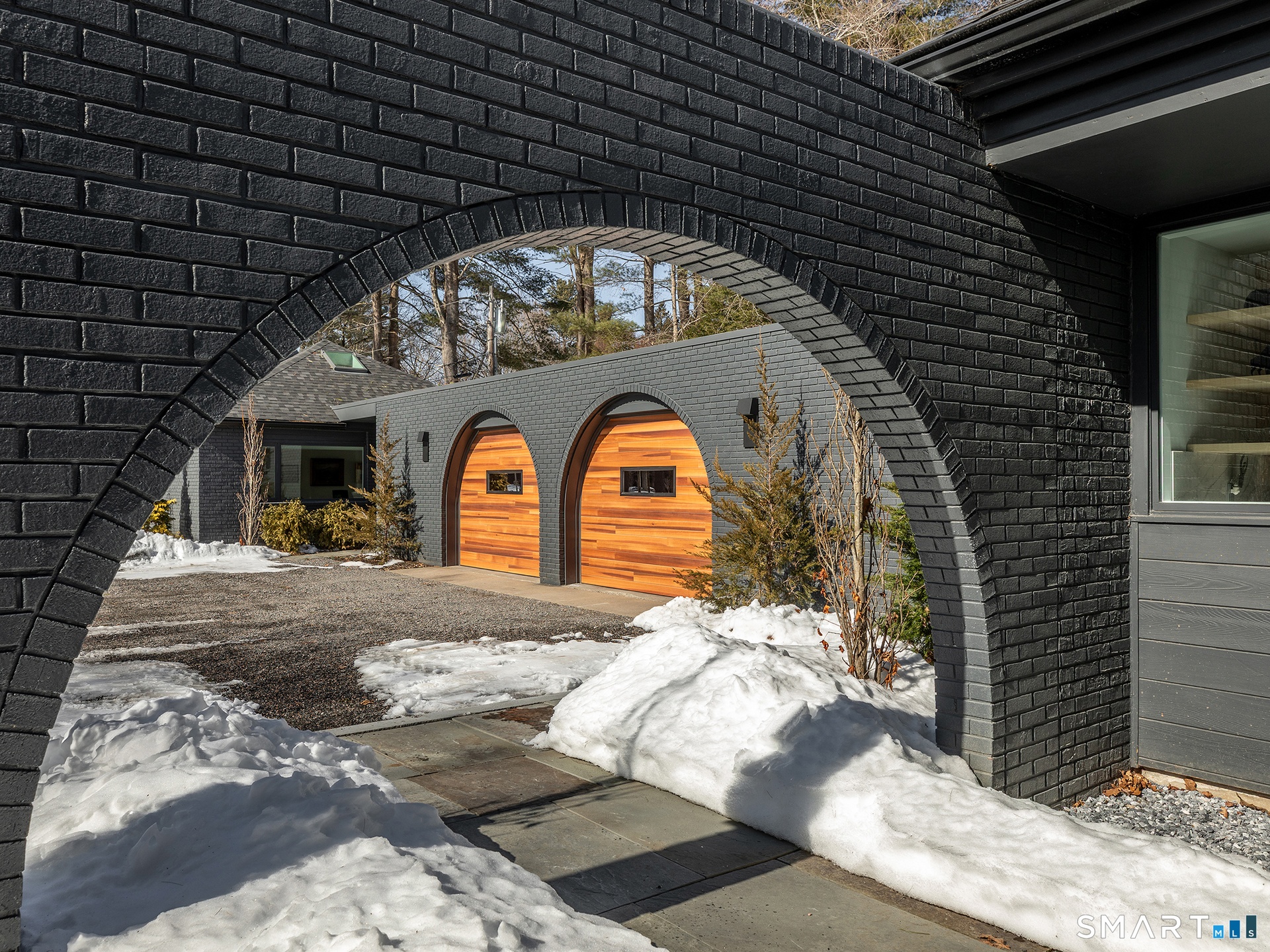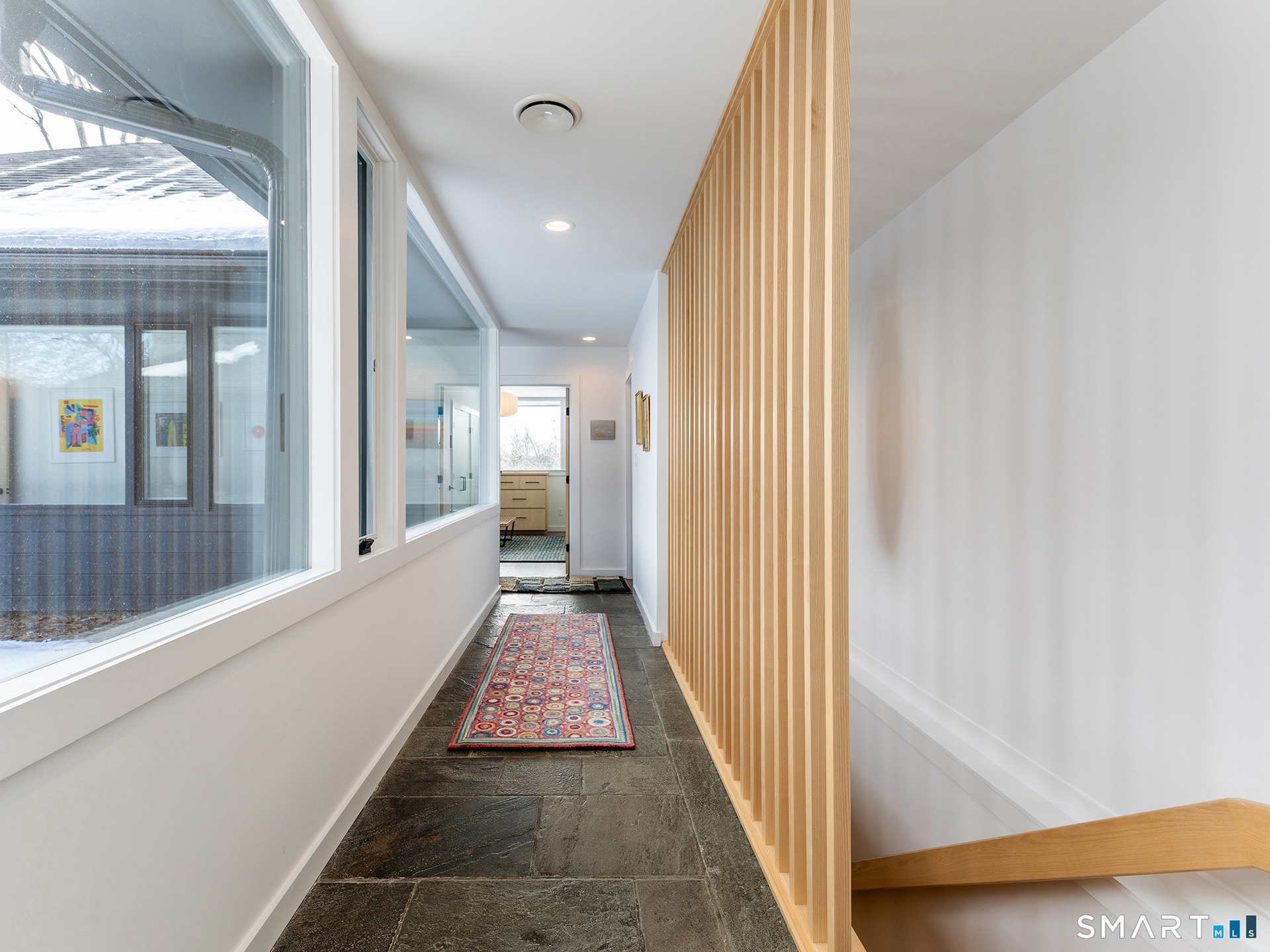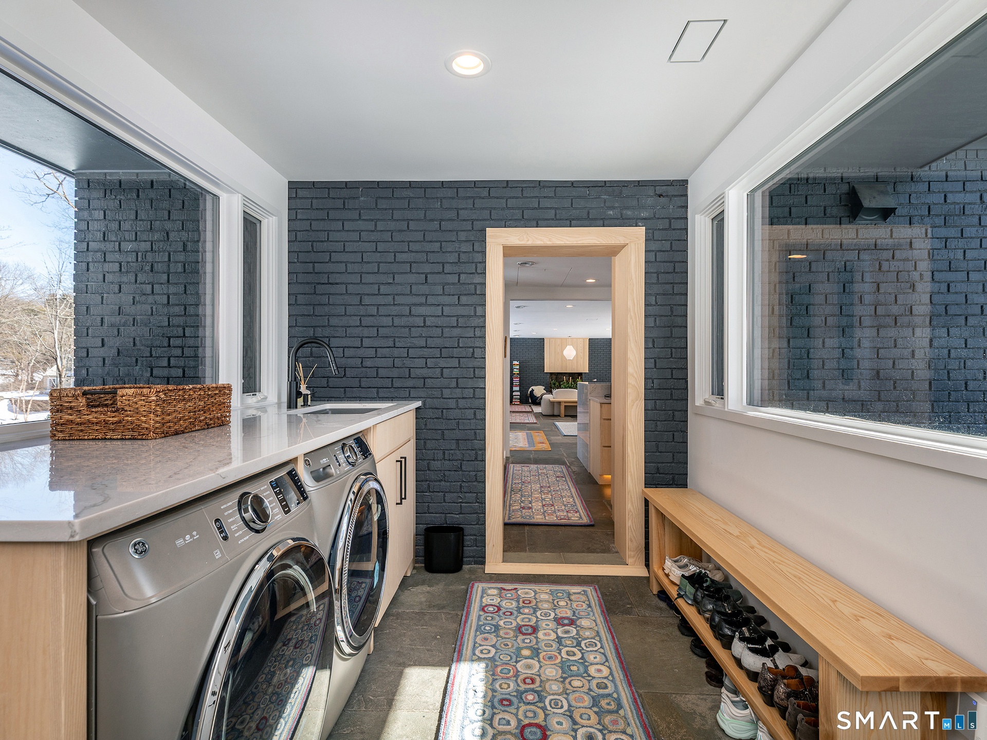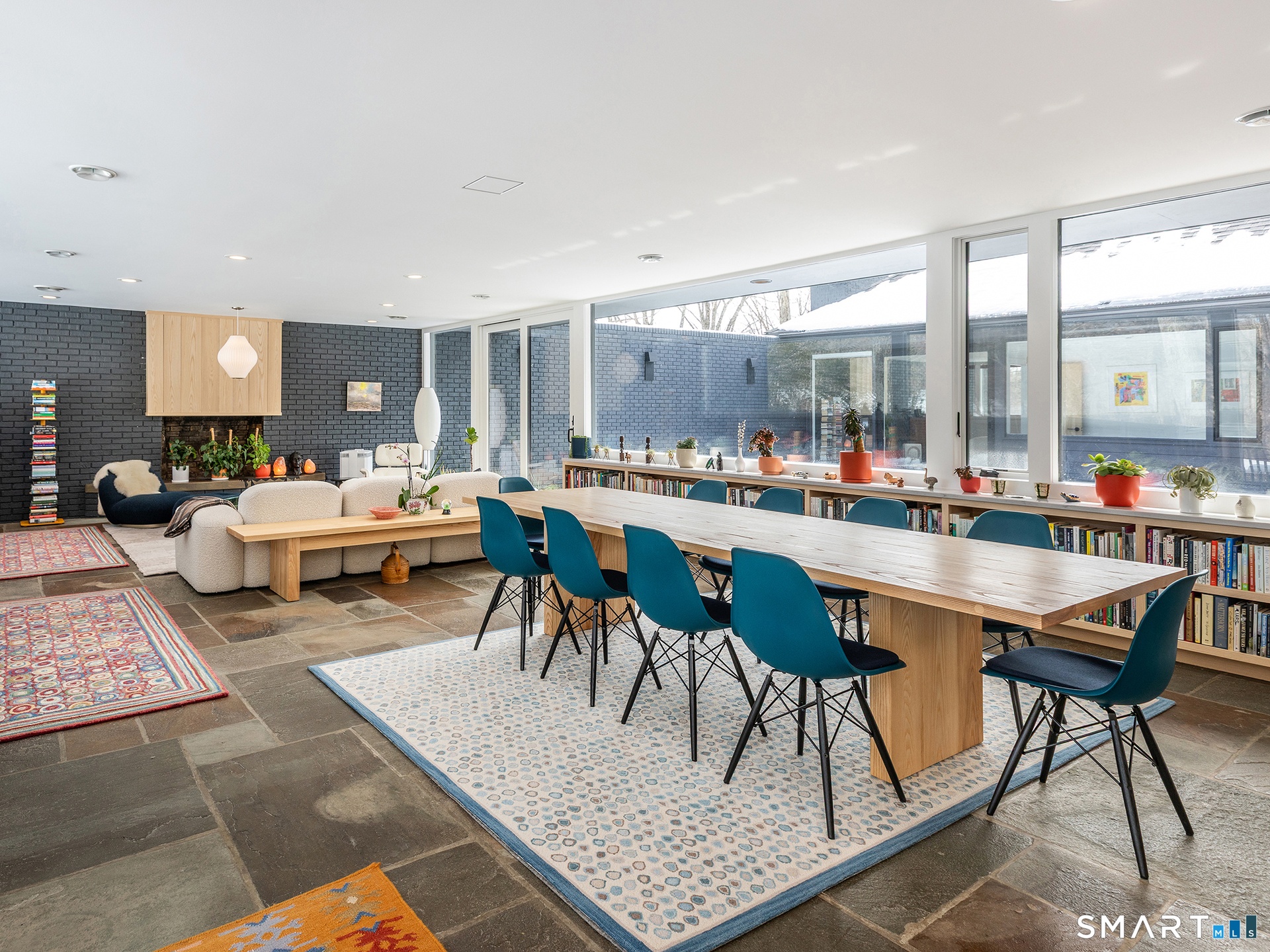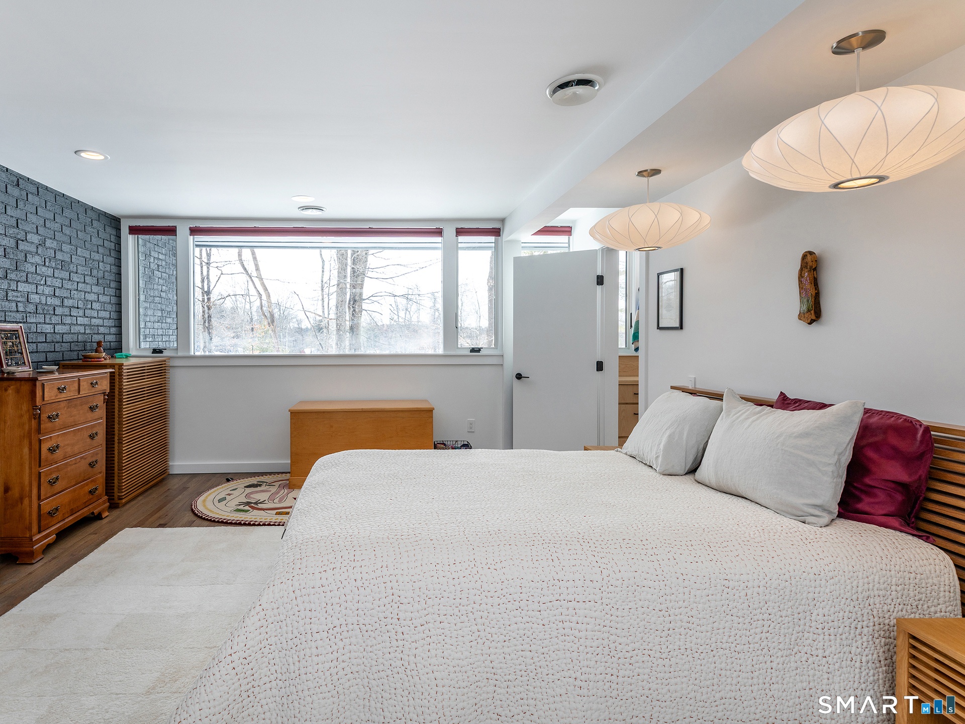 This beautifully reimagined Mid Century home sits on a picturesque stretch of the Bantam River.