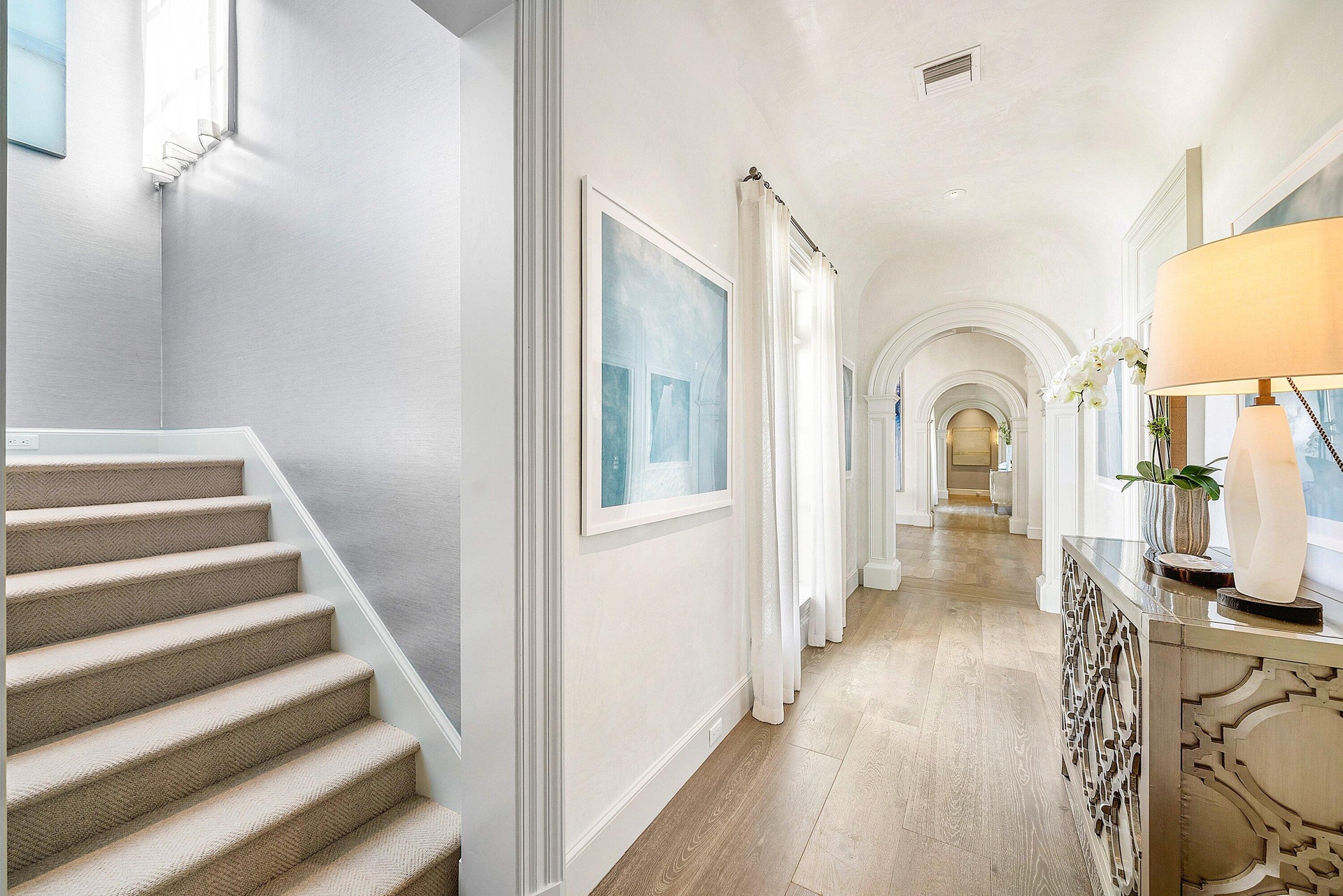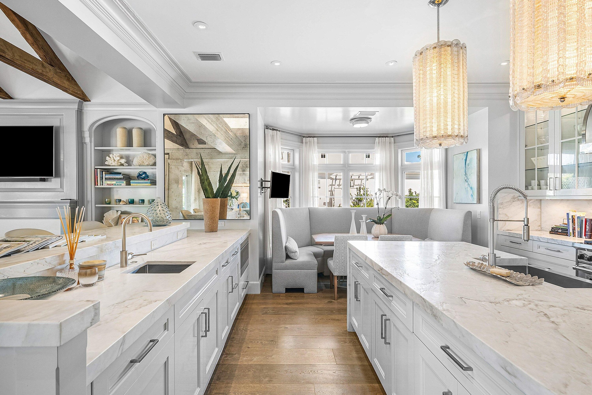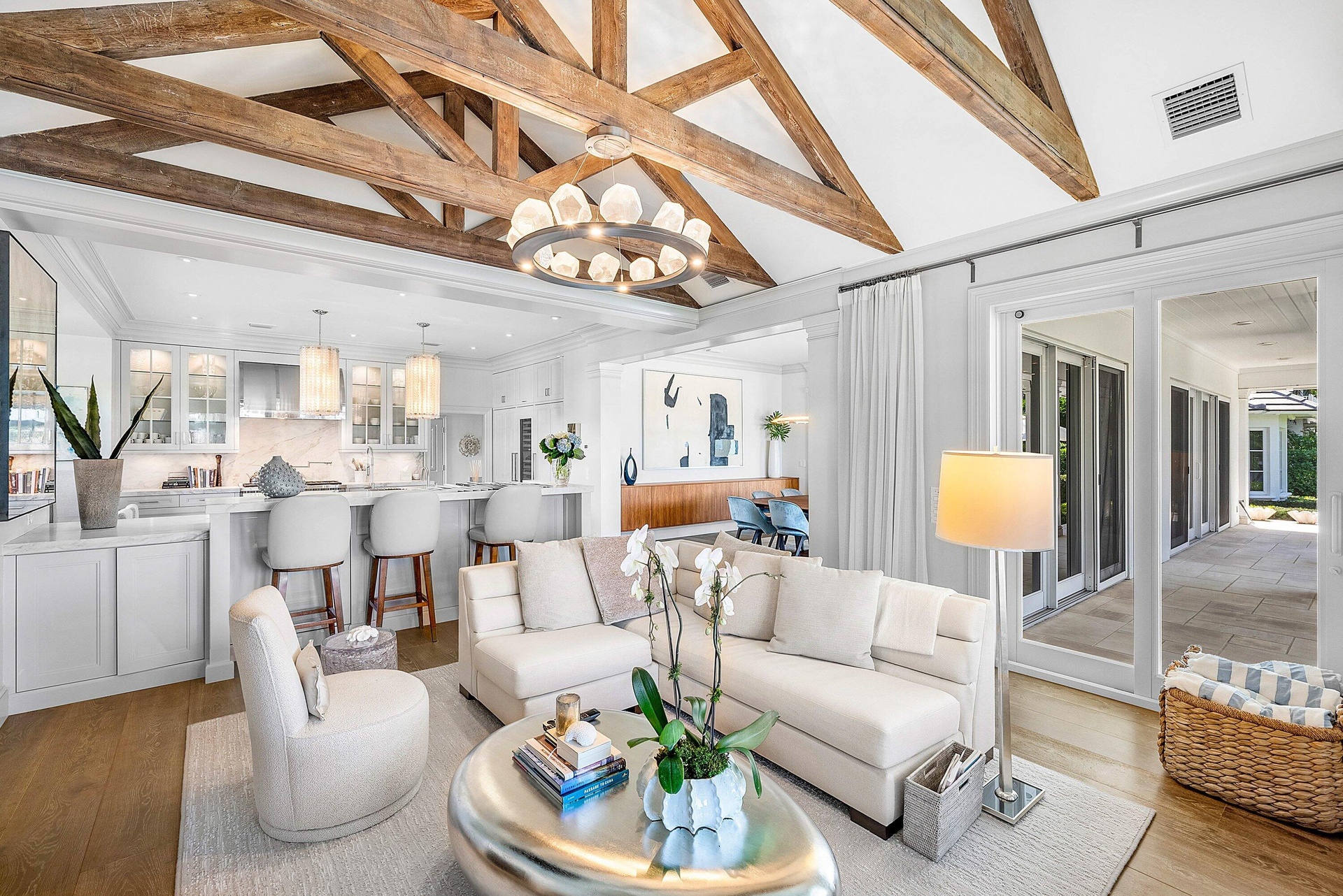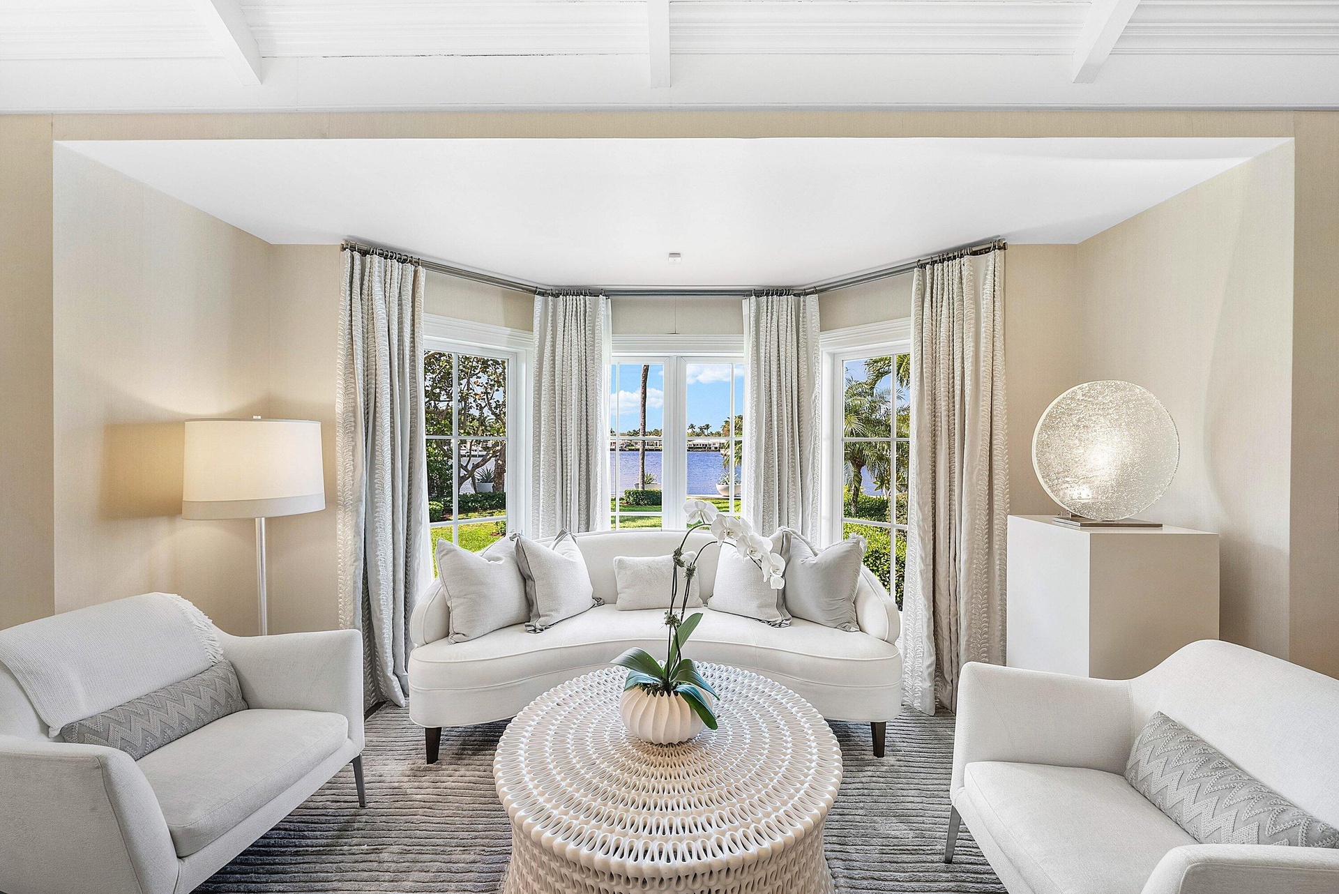 Rarely available Polo Cove exceptional waterfront estate in the heart of Gulf Stream offering 150' of frontage on a protected cove just off the Intracoastal Waterway. Spanning 6,283 total square feet, this residence, designed and rebuilt by Bill Wietsma, features Venetian plaster finishes, richly detailed wood ceilings, and resort-inspired interiors with refined finishes throughout. The residence includes a waterfront living room and family room, each with a fireplace, a formal dining room, and a chef's kitchen with Wolf and Sub-Zero appliances, oversized island, two dishwashers, wine cooler, and warming drawer. Nearly every principal room captures sweeping Intracoastal views. The home offers a luxurious first floor primary suite, guest suite, second floor private guest suite, and custom office/den. Tropical landscaping frames a private pool and expansive loggia with a fully equipped outdoor kitchen, providing generous space for entertaining or quiet evenings along the water. Ideally located moments from Gulf Stream's beaches and the shopping and dining of Delray Beach and Palm Beach. A rare opportunity to enjoy protected waterfront living in the heart of Gulf Stream.