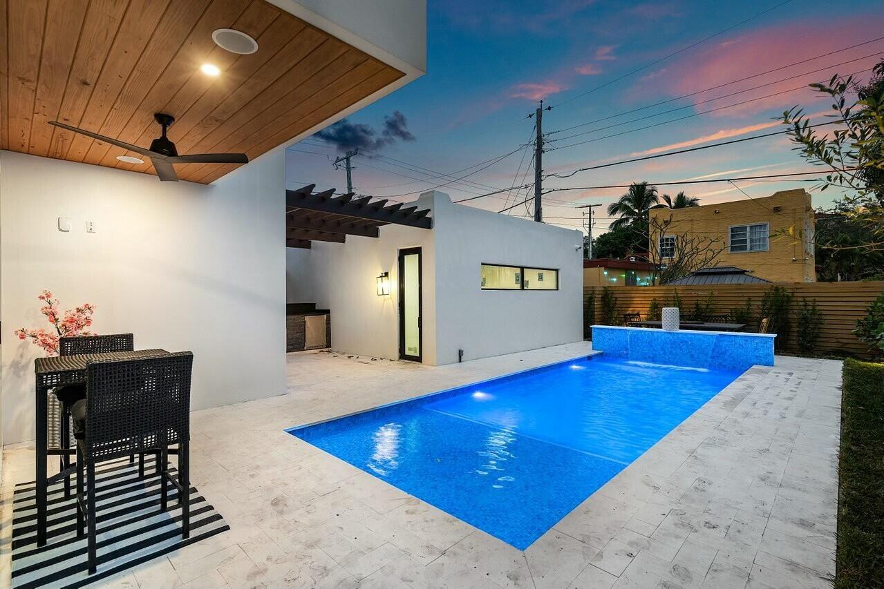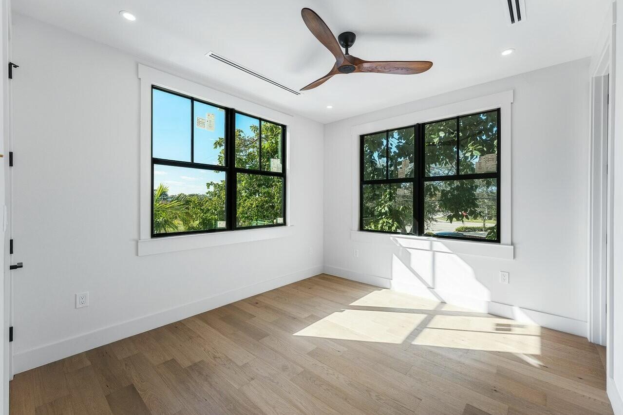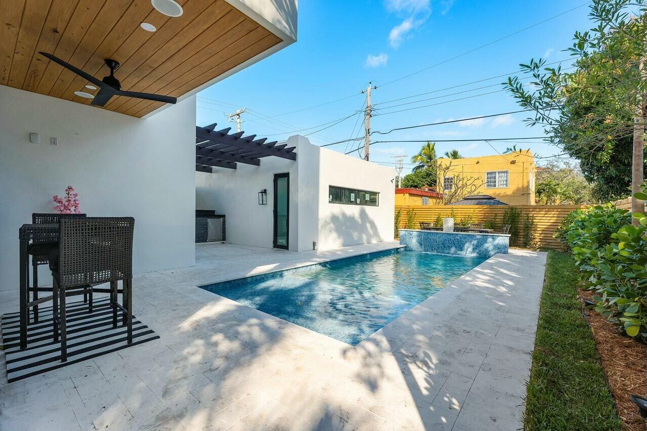 Discover unparalleled charm and sophistication in this brand-new Mission Revival home, ideally situated in the coveted College Park neighborhood of Lake Worth Beach. This architectural gem pays homage to the classic 1920s style while incorporating today's most sought-after modern amenities. From the moment you enter, you'll be greeted by soaring ceilings in the entryway that flood the space with natural light. The open-concept floor plan is anchored by a stunning chef's kitchen featuring top-of-the-line Thermador appliances, a quartz island, a pot filler, and a walk-in pantry with custom shelving. Perfect for entertaining or everyday living, the kitchen flows seamlessly into the great room and access the dining room via a butlers pantry. A versatile flex room on the main level can serve as a home office or playroom, complemented by a stylish half bath. Upstairs, three ensuite bedrooms ensure ultimate comfort and privacy. The primary suite, located at the back of the home, overlooks the serene backyard and pool with a Juliet balcony, featuring a generous walk-in closet, a luxurious bathroom with dual sinks, and a walk-in shower. Just off the primary bath, step onto the tiled rooftop terracea private retreat perfect for enjoying morning coffee, sunsets, or quiet relaxation under the stars. The secondary bedrooms mirror each other in layout and design, offering ample closet space and luxury ensuite bathrooms. Modern touches include a Control 4 home automation system, impact-resistant windows, recessed lighting, and more. Step outside to your personal oasis, complete with a 27' x 10' pool featuring a sun shelf, travertine pool deck, and a covered patio wired for outdoor entertainment. The fully fenced backyard, framed by lush landscaping, ensures privacy and tranquility. A two-car garage, energy-efficient features, and close proximity to vibrant Lake Worth Beach make this home an extraordinary opportunity. Combining timeless design with contemporary convenience, this home is truly one-of-a-kind.