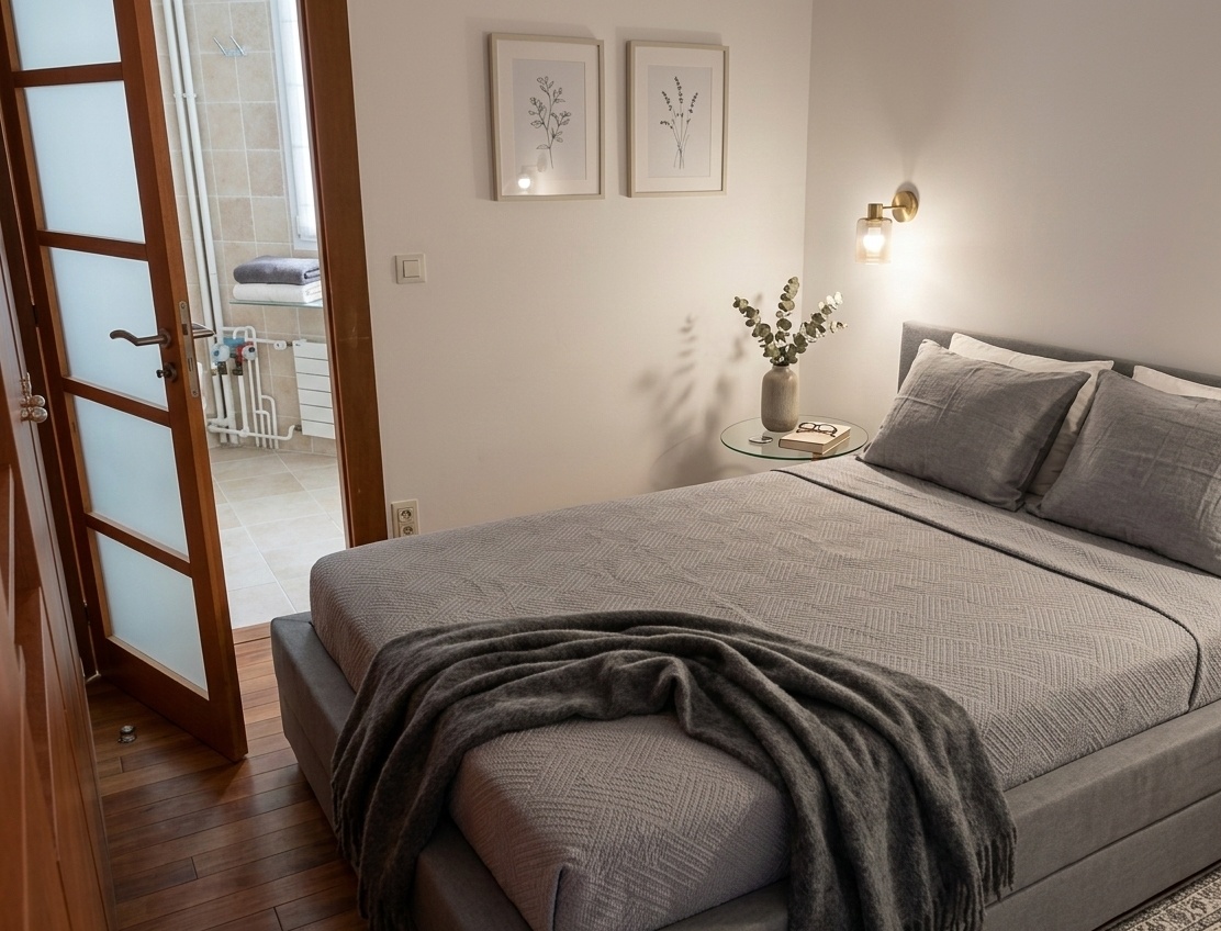 La chambre offre un refuge paisible, avec un agencement calme et des finitions chaleureuses garantissant confort et intimité. La salle de bain comprend une douche, complétant l’installation pratique et moderne de l’appartement.