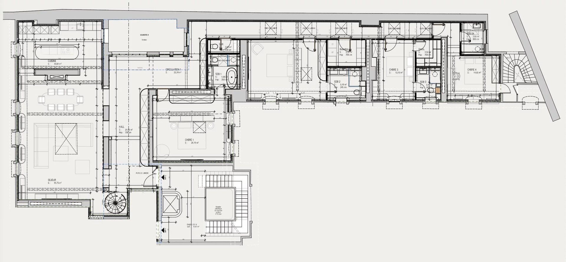 The apartment has four bedrooms, including a master bedroom with dressing room and private bathroom, and three additional bedrooms with their own bathrooms. Two dressing rooms and numerous storage spaces perfect the layout and comfort.
