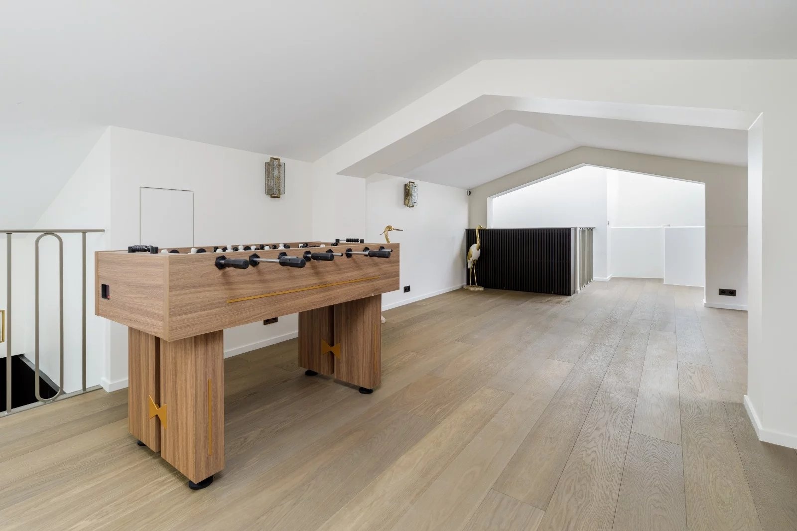 With a ceiling height of 5.10 meters in the triple living room, the living space consists of a lounge, dining room, and fully integrated kitchen, offering light and volume. An elegant mezzanine completes this unique space.