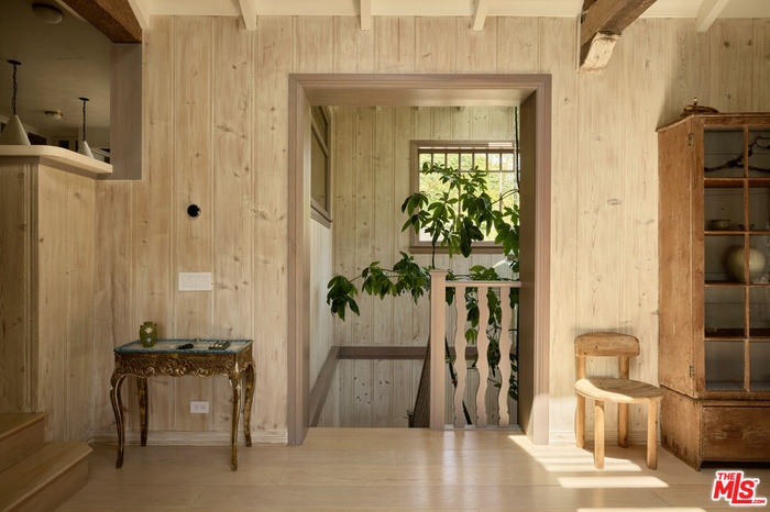 A bold and beautifully tailored Santa Monica Canyon residence, recently reimagined to near perfection. Set discreetly behind privacy gates, the secure compound unfolds with a motor court, pool and spa, outdoor kitchen, and sweeping canyon-to-ocean vistas. The main living level floats above the street, where a dramatic great room defined by hand-carved beam ceilings and a wood-burning fireplace anchors the home with warmth and character. The kitchen, anchored by an inviting dining area, flows effortlessly to an alfresco dining deck overlooking the estate and distant ocean, while a cozy den offers a more intimate retreat. Upstairs, the primary suite is joined by two additional bedrooms, and the lower level reveals a fully appointed guest suite paired with a stylish living and entertainment lounge that opens seamlessly to the outdoors. Thoughtfully designed for both privacy and ease, this refined Santa Monica Canyon retreat balances architectural character with effortless California living.