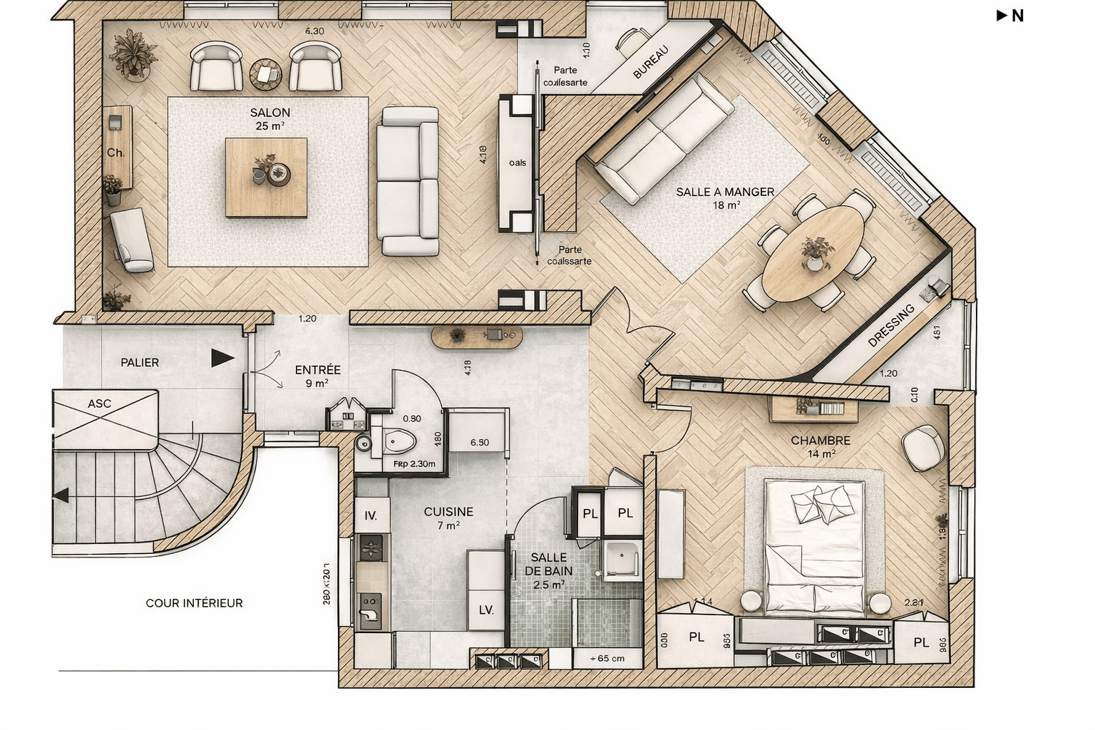 L’appartement s’étend sur environ 80 m2 et propose des espaces de vie séparés comprenant un salon, une salle à manger, une cuisine et un petit bureau, offrant une grande flexibilité pour la vie quotidienne et les réceptions. La salle de bain est située en dehors de la chambre, apportant confort et praticité.