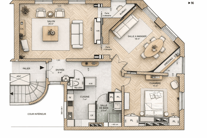 • Salon, salle à manger, cuisine et petit bureau séparés