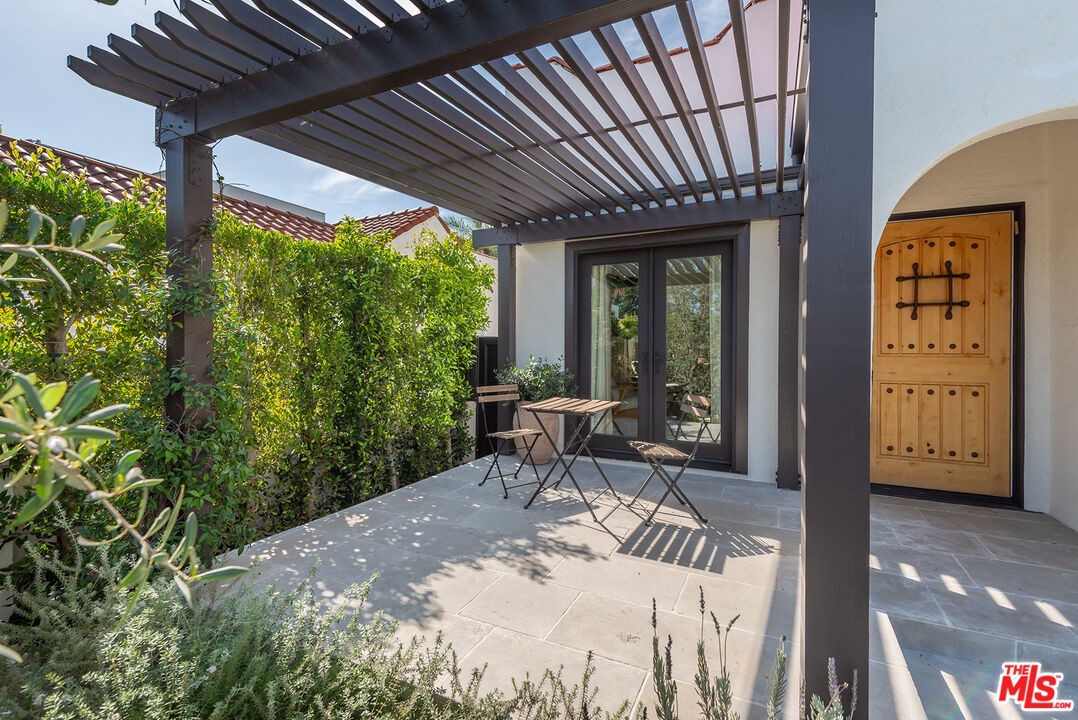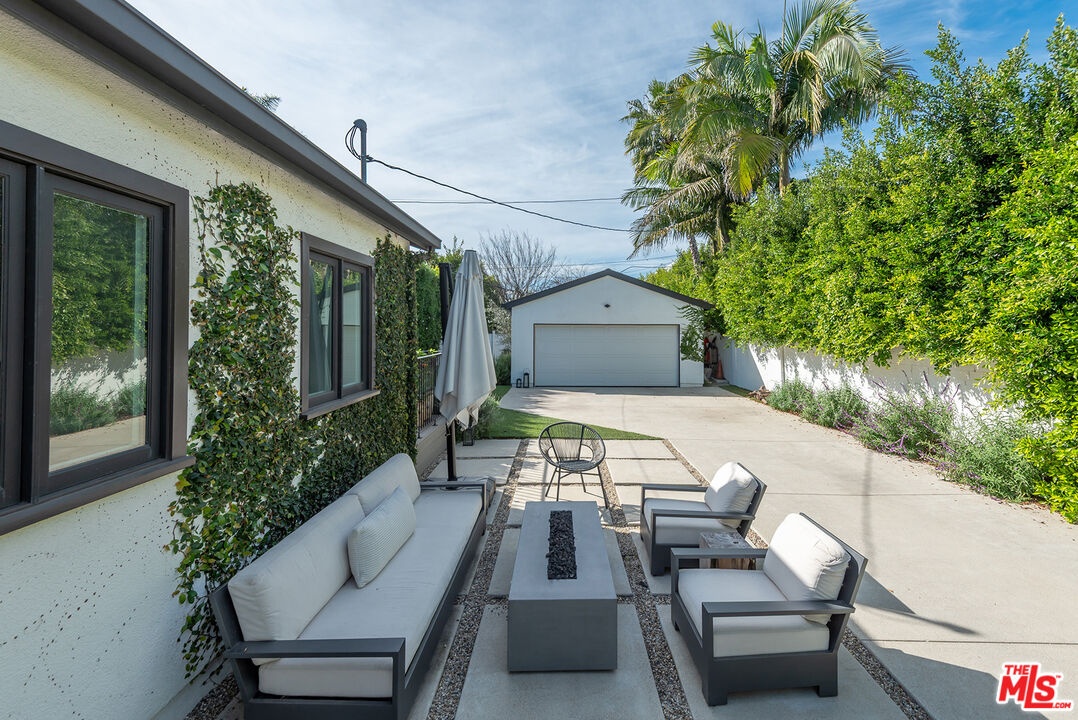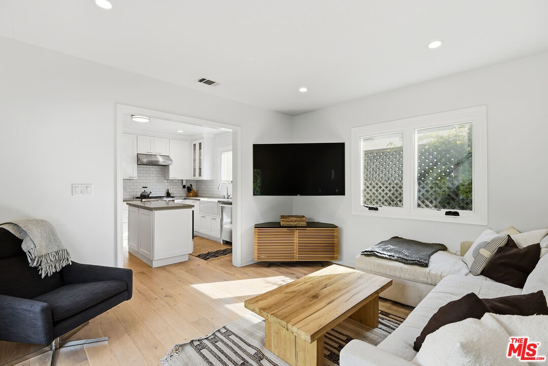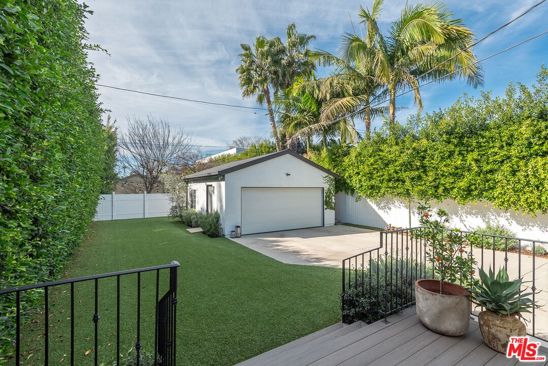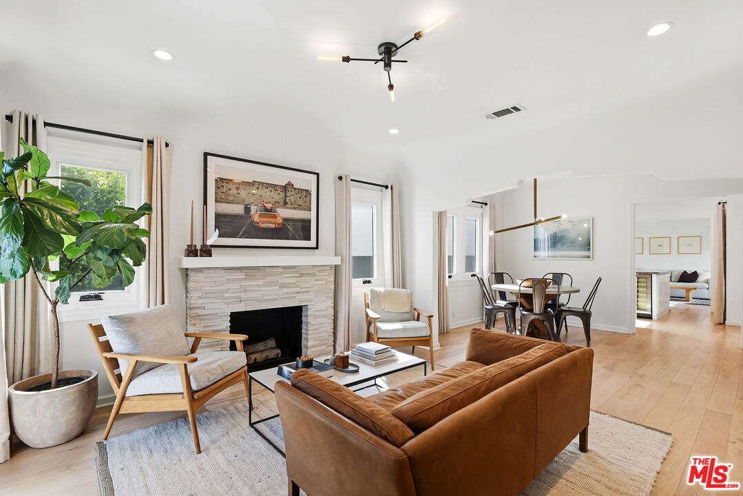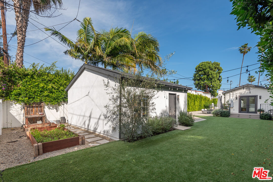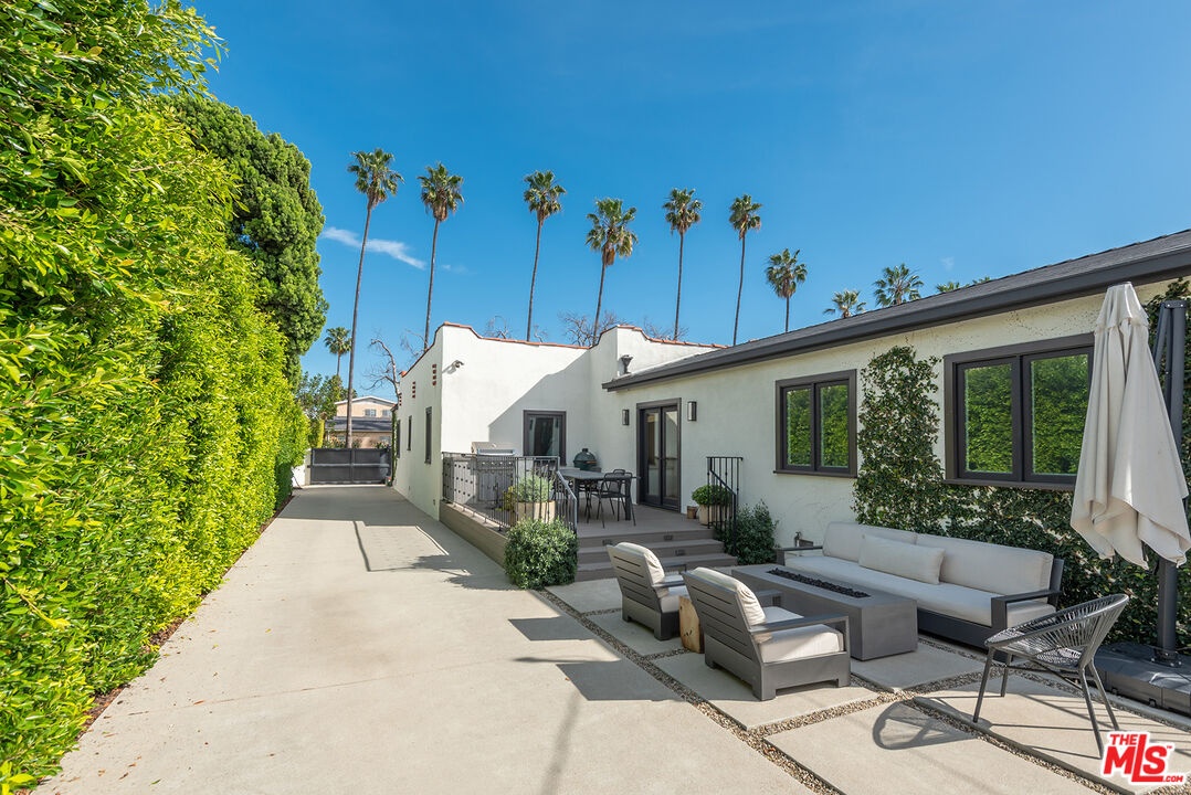 Charming, gated 3BR+2BA Spanish-style home, in the heart of Melrose Village. Filled with natural light and classic architectural character, the home features hardwood floors, recessed lighting throughout and a spacious living room that flows seamlessly into the dining area. The updated kitchen features stainless steel appliances including a Wolf oven, Subzero refrigerator, a wine fridge and generous cabinet and pantry storage. Family room is located off kitchen. Two private decks extend the living space outdoors, one off the family room and another off the primary bedroom, offering inviting spots to relax, dine or entertain. The home offers spacious bedrooms with ample closet space, including a primary suite featuring a walk-in closet and en-suite bathroom. Thoughtfully landscaped front and backyard spaces provide privacy with mature hedges and lush greenery. The expansive lot offers multiple outdoor areas to enjoy, including a vegetable garden, built-in BBQ and fire pit, perfect for outdoor dining and relaxed evenings. A detached two-car garage offers excellent potential for an ADU, studio or creative workspace. The property is secured with a new sliding driveway gate and pedestrian entry gate. Ideally located just moments from The Grove, Larchmont Village, Melrose shopping and some of the best dining and entertainment in Los Angeles.