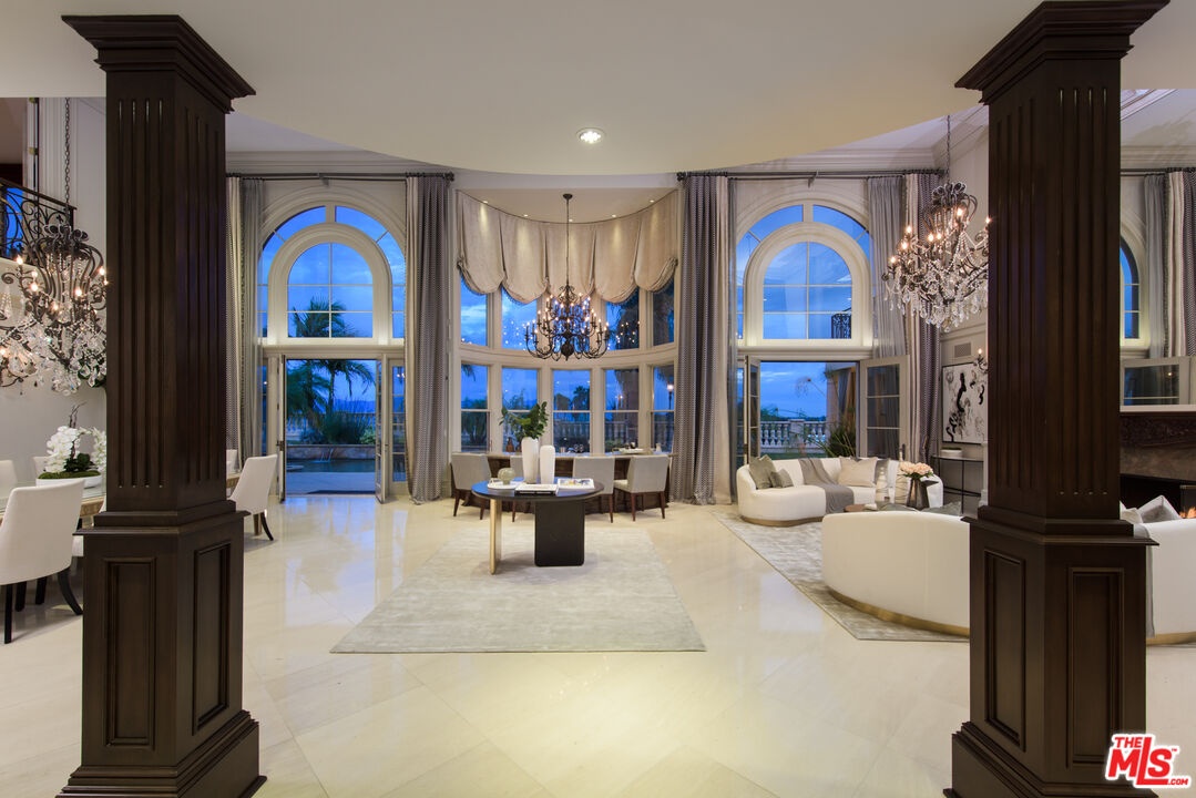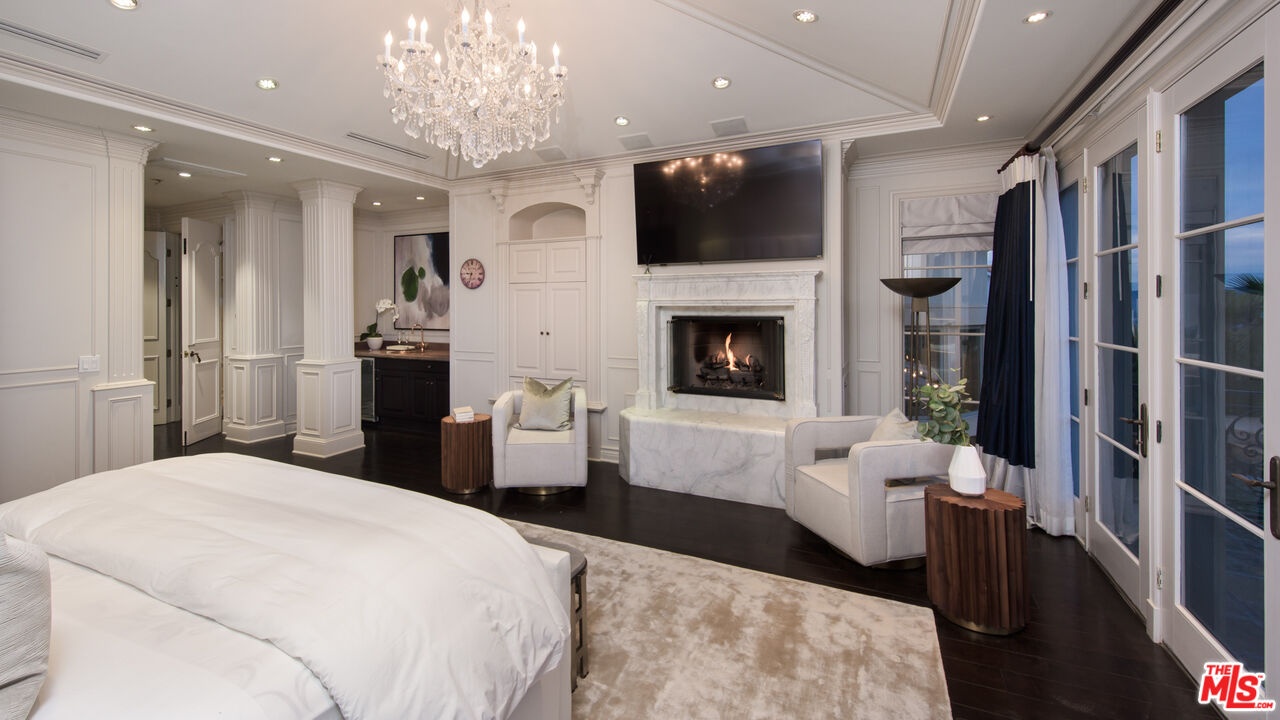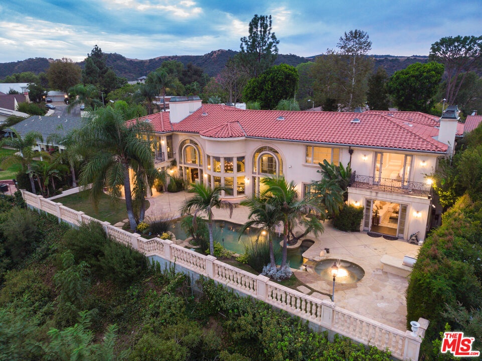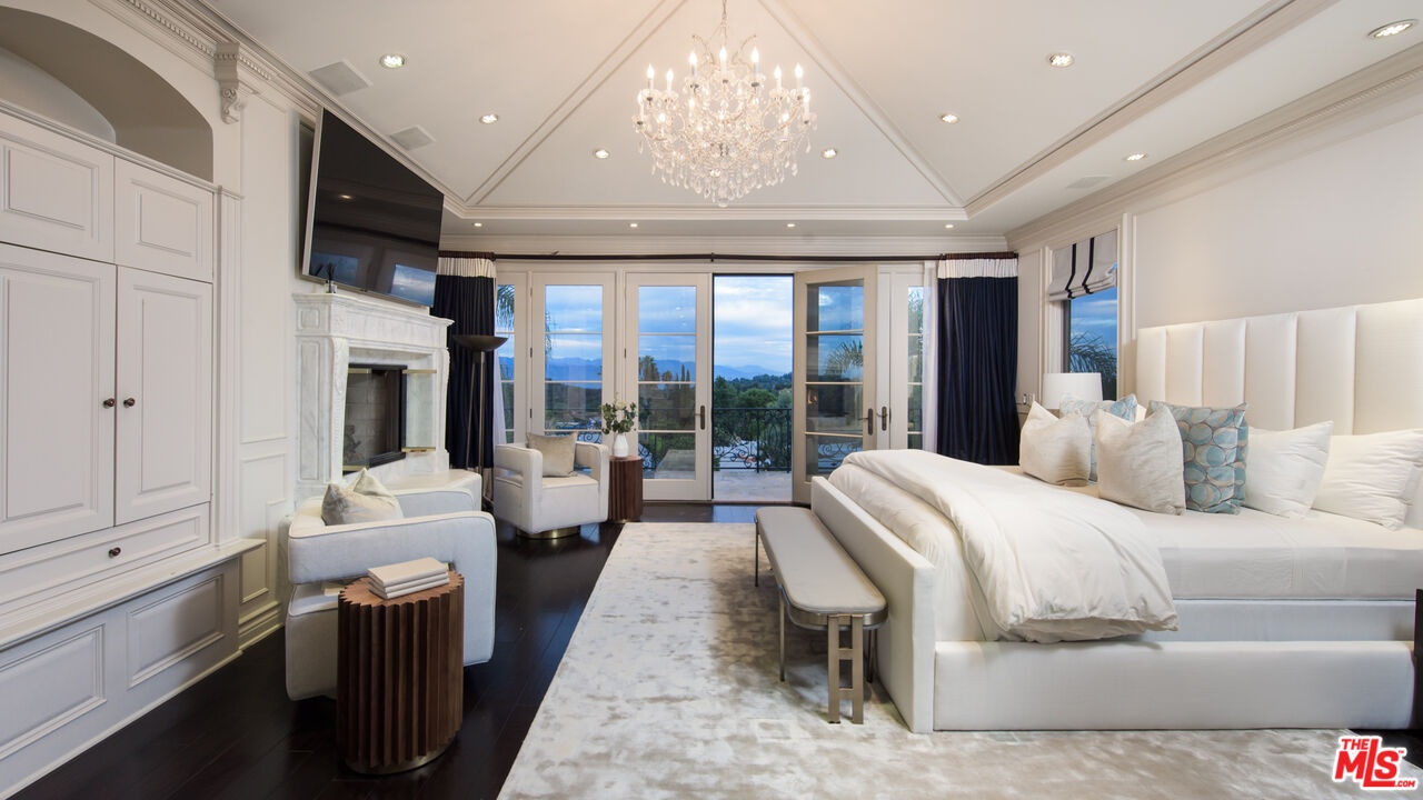Situated in the coveted Bel Air Skycrest neighborhood, this elegantly modern yet traditional-style home was envisioned for grand-scale living and entertaining. Capturing panoramic city, canyon, and mountain views, the home seamlessly blends indoor and outdoor living, offering the ideal space to host family and friends. Arrive at the home, where the ivy-clad facade and lush landscaping frame the towering, arched front door. Enter into the magnificent formal living and dining room with soaring 30-foot ceilings, an entertainer's bar, regal fireplace, and floor-to-ceiling arched windows and glass doors framing views of the property and mountains beyond. Off the entertaining space is the expansive gourmet chef's kitchen with spacious island, premier Viking appliances and an adjacent family room with fireplace. Glass doors connect the living and entertaining spaces to the extraordinary backyard retreat, where tall palms and mature trees hold court over the swimming pool, heated spa, built-in BBQ kitchen and lawn. Expansive terraces and a covered loggia offer ample space for lounging, dining and entertaining amidst the far-reaching views. Completing the first floor is a plush media room with a wet bar and an office that may serve as an additional bedroom or staff quarters. The stairs ascend to the sweeping terraced hallway, which overlooks the living room below. At one end are three bedrooms, each with ensuite baths and walk-in closets, and on the other, the stunning primary suite boasting a wet bar with fridge, soaring ceilings, marble fireplace, a soaking tub and private balcony with fantastic views. Featuring a two-car garage and plenty of additional parking, the home offers a quiet, tranquil setting in a central location close to the Westside and L.A.'s best private schools, including Curtis, Buckley, Mirman and Milken. With convenient nearby access to the 405, the home is minutes from Brentwood, Beverly Hills, Santa Monica and the Valley.