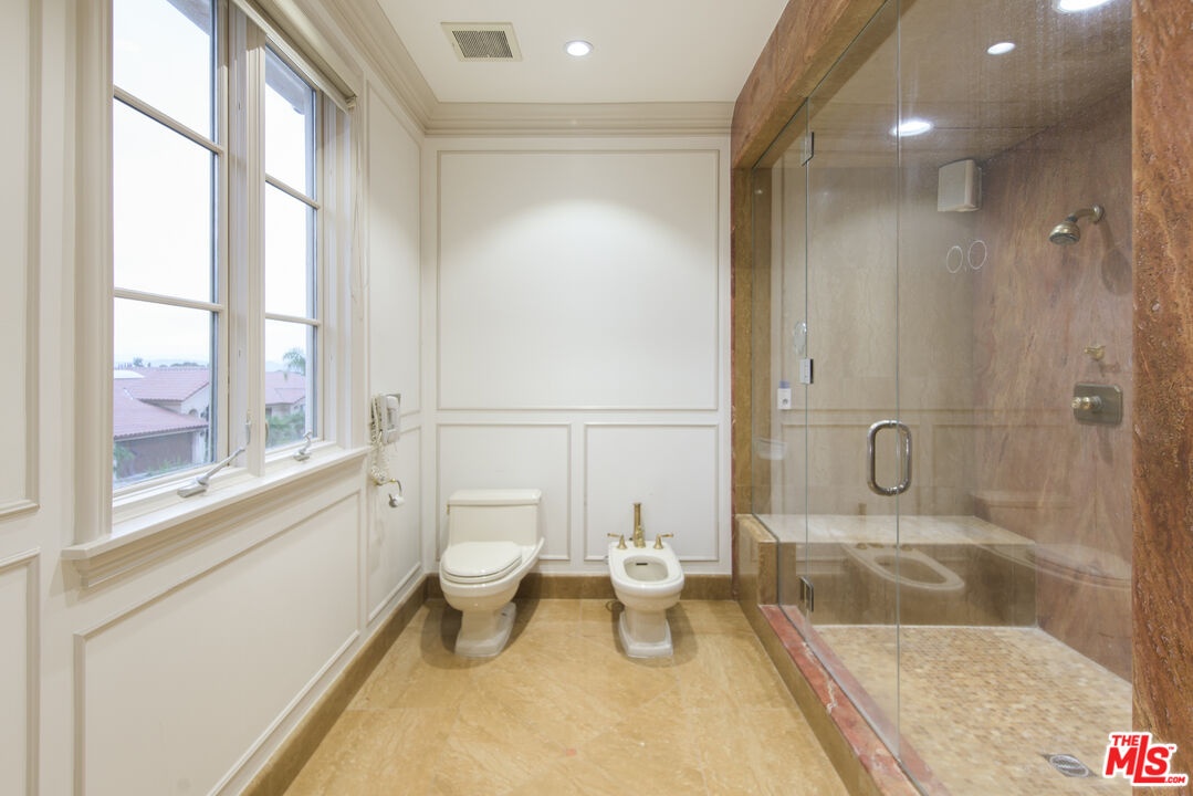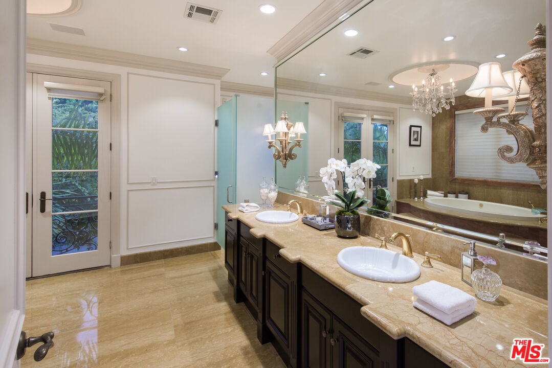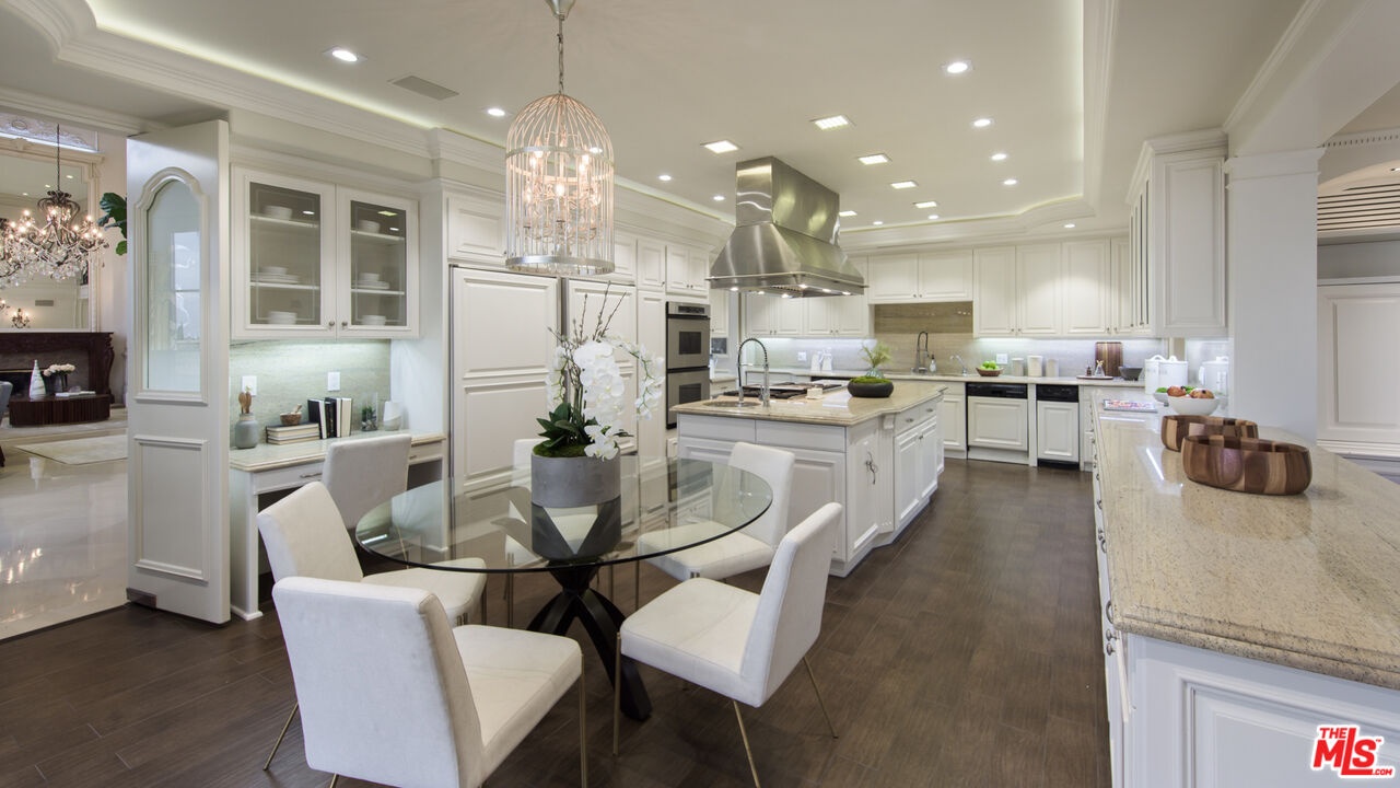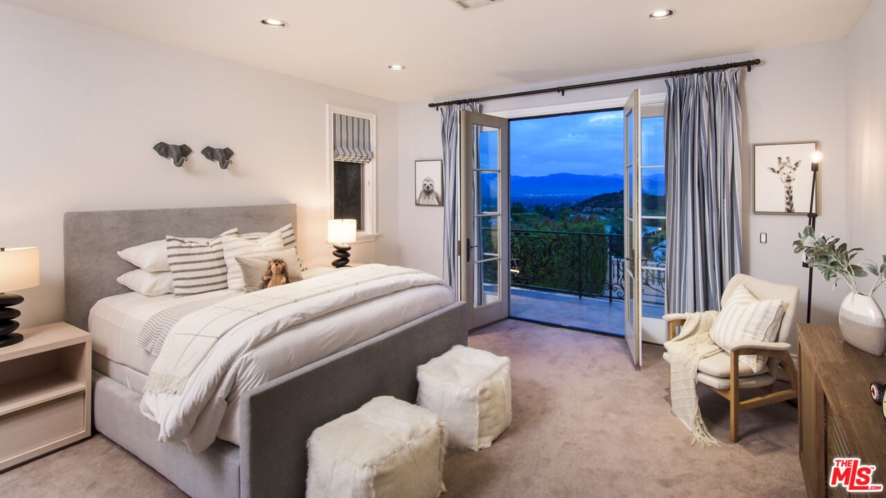 Situated in the coveted Bel Air Skycrest neighborhood, this elegantly modern yet traditional-style home was envisioned for grand-scale living and entertaining. Capturing panoramic city, canyon, and mountain views, the home seamlessly blends indoor and outdoor living, offering the ideal space to host family and friends. Arrive at the home, where the ivy-clad facade and lush landscaping frame the towering, arched front door. Enter into the magnificent formal living and dining room with soaring 30-foot ceilings, an entertainer's bar, regal fireplace, and floor-to-ceiling arched windows and glass doors framing views of the property and mountains beyond. Off the entertaining space is the expansive gourmet chef's kitchen with spacious island, premier Viking appliances and an adjacent family room with fireplace. Glass doors connect the living and entertaining spaces to the extraordinary backyard retreat, where tall palms and mature trees hold court over the swimming pool, heated spa, built-in BBQ kitchen and lawn. Expansive terraces and a covered loggia offer ample space for lounging, dining and entertaining amidst the far-reaching views. Completing the first floor is a plush media room with a wet bar and an office that may serve as an additional bedroom or staff quarters. The stairs ascend to the sweeping terraced hallway, which overlooks the living room below. At one end are three bedrooms, each with ensuite baths and walk-in closets, and on the other, the stunning primary suite boasting a wet bar with fridge, soaring ceilings, marble fireplace, a soaking tub and private balcony with fantastic views. Featuring a two-car garage and plenty of additional parking, the home offers a quiet, tranquil setting in a central location close to the Westside and L.A.'s best private schools, including Curtis, Buckley, Mirman and Milken. With convenient nearby access to the 405, the home is minutes from Brentwood, Beverly Hills, Santa Monica and the Valley.