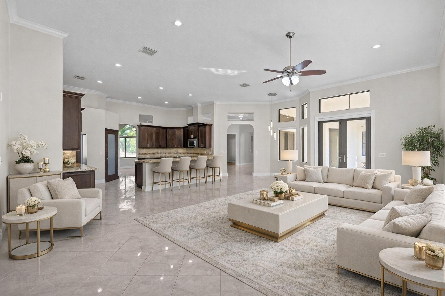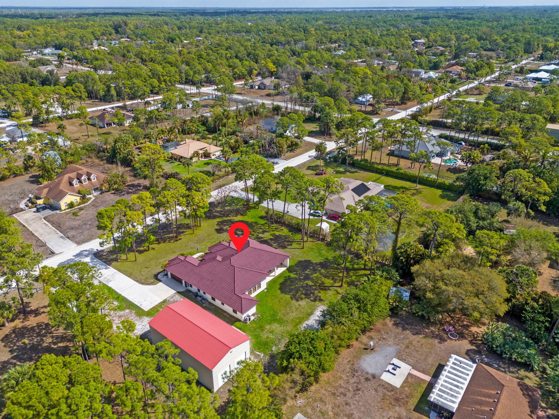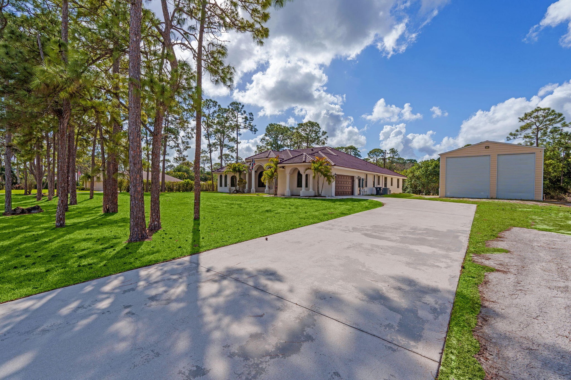 Welcome to this home in The Acreage, offering 4 bedrooms plus a den, 3 full bathrooms, and a half bath, all set on an expansive 1.14-acre lot with a 2-car attached garage and an impressive 1,800 sq ft detached steel shop. The home has been freshly painted and features hurricane impact windows and doors, a tankless hot water heater, reverse osmosis system, generator hookup, and newer water system. Enter through the double front doors into a bright and spacious interior with 12' ceilings, a welcoming foyer, vertically laid porcelain flooring, and abundant natural light throughout. The kitchen is designed for both everyday living and entertaining, featuring a large island with storage, granite countertops, stainless steel appliances, glass display cabinetry, a generous walk-in pantry, and a breakfast nook overlooking the surrounding property. The split floor plan provides privacy and comfort with real wood floors, detailed millwork, tray ceilings, French doors, and spacious living areas. The primary suite offers peaceful views and includes dual walk-in closets, granite vanities, a large walk-in shower, and a relaxing jacuzzi tub. Step outside to enjoy the 34' x 16' covered lanai, surrounded by mature pine trees and tropical palms that create a quiet and relaxing outdoor setting. The property also features a substantial 60' x 30' Eversafe steel building with a 21' ceiling, large roll-up doors, 200-amp service, and multiple 220 and 110 outlets, providing exceptional flexibility for storage, hobbies, or workspace. Located in the desirable Acreage area of Palm Beach County, this home offers peaceful country-style living while remaining just minutes from shopping, dining, parks, and equestrian facilities. Convenient access to Florida's Turnpike, I-95, Palm Beach International Airport, and the area's beautiful beaches makes commuting and travel simple while still enjoying the privacy and space this unique property provides. Make this luxurious retreat your own and experience refined living in this exceptional residence.
