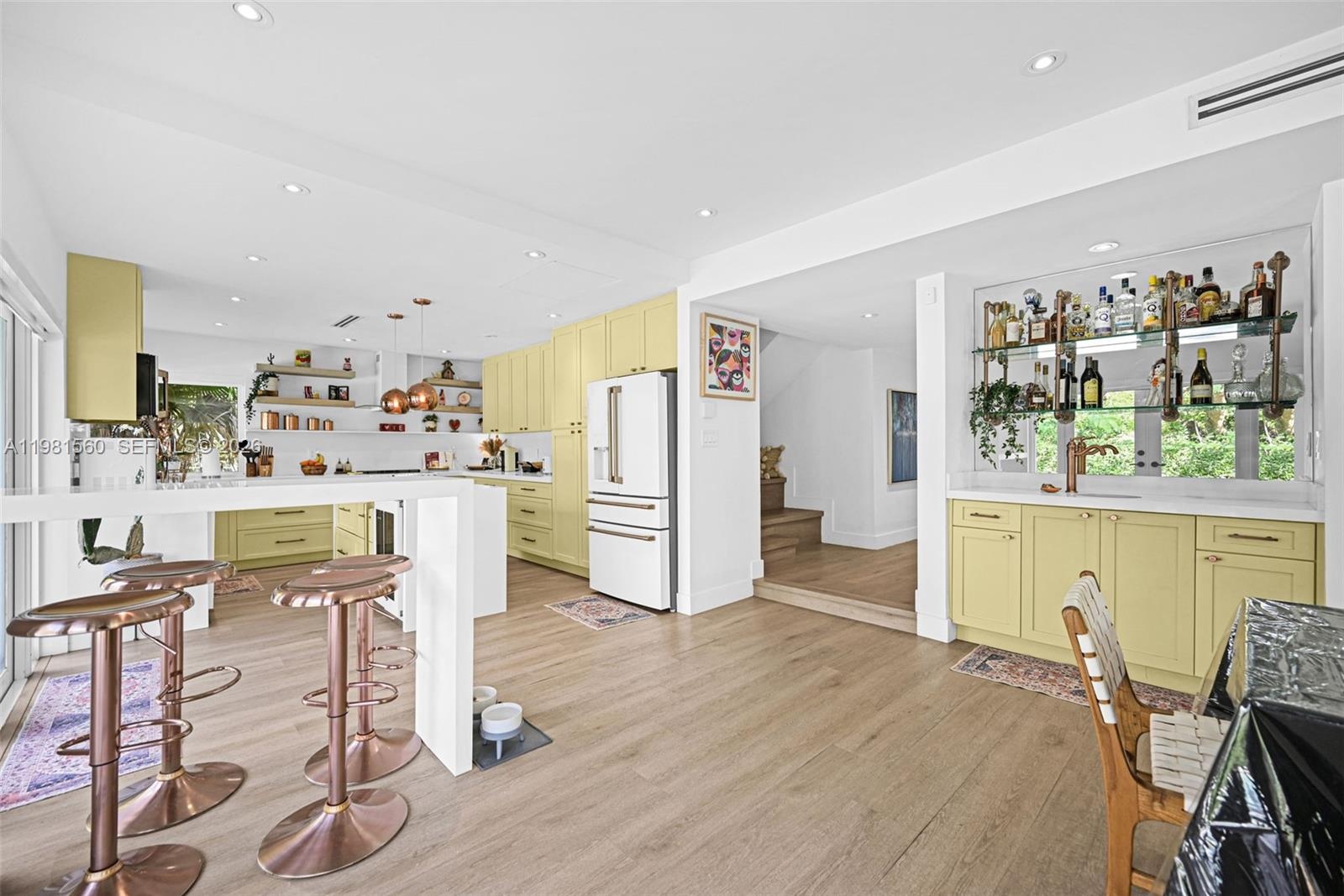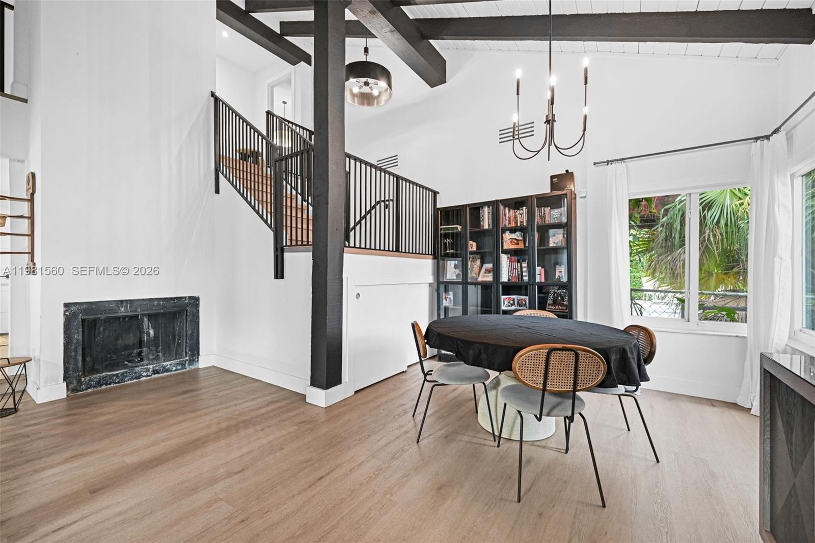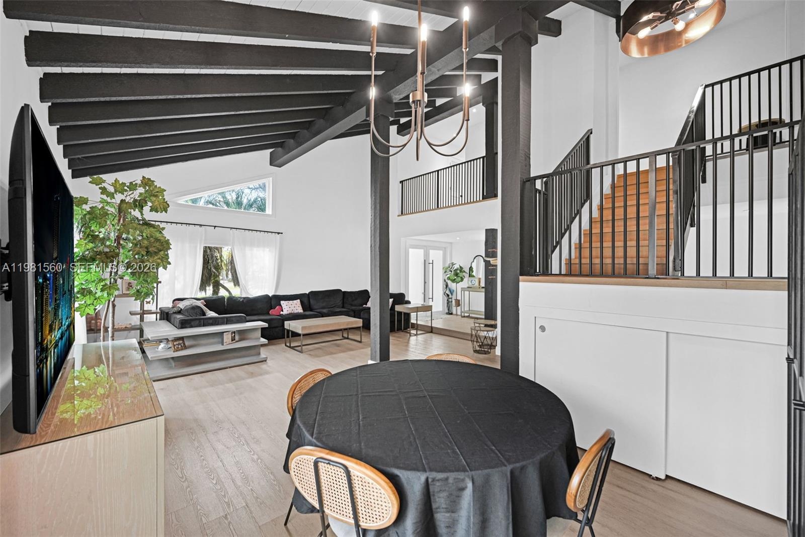 Inside, dramatic vaulted ceilings with exposed beams create a striking architectural focal point. The open living areas are filled with natural light and flow seamlessly into the dining space and a stylishly updated kitchen featuring quartz countertops, custom cabinetry, stainless steel appliances, and open shelving.