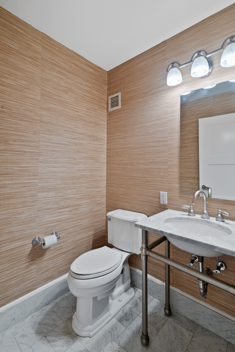 The sumptuous primary suite, spanning over 500 square feet, is a private retreat featuring five closets and a spa-inspired en-suite bath. Appointed with a deep soaking tub, separate glass-enclosed shower, Dornbracht fixtures, white Italian tile, and marble finishes, the bath offers a serene sanctuary above the city. The second bedroom also enjoys its own en-suite bath, complete with a deep soaking tub positioned to take in striking New York City skyline views—an indulgent setting for unwinding at day’s end. A well-appointed powder room provides additional comfort for guests.
