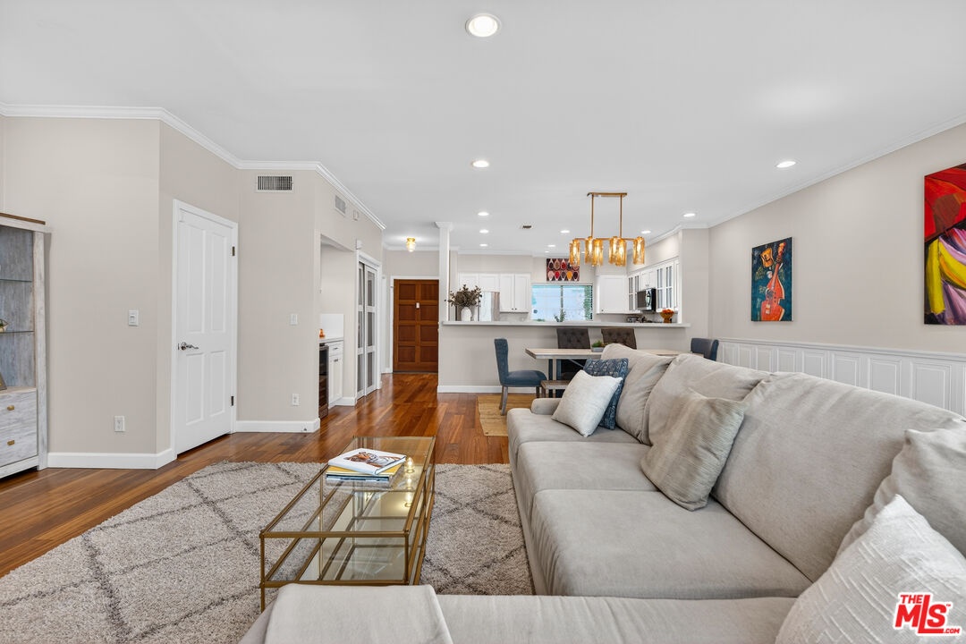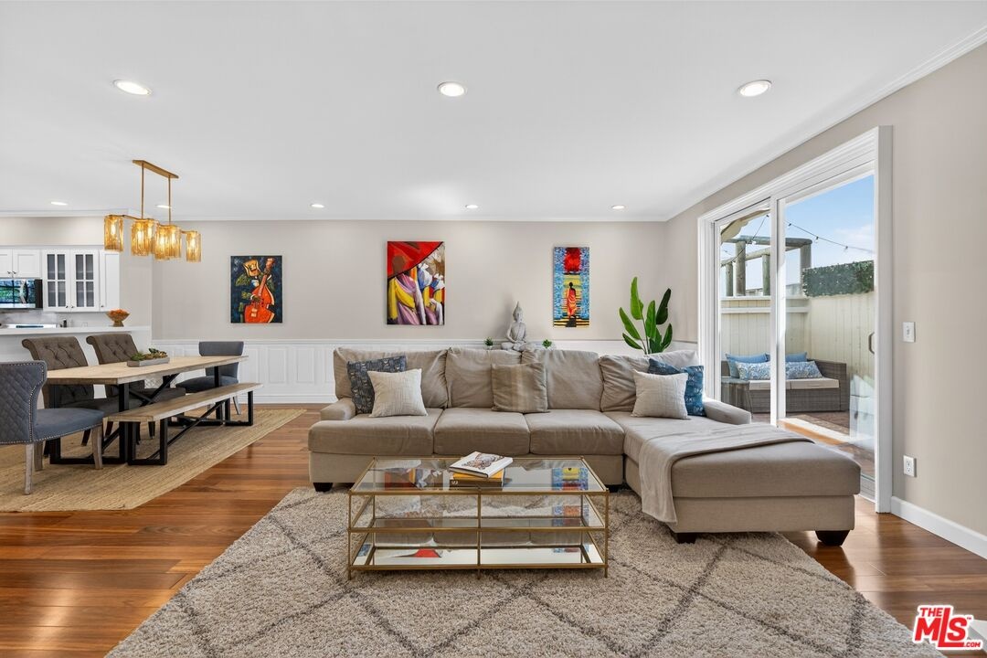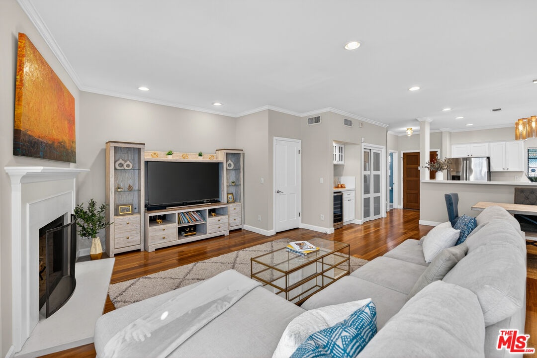Welcome to a bright and inviting townhome nestled within a private five-unit building in the heart of Santa Monica, where thoughtful design meets effortless coastal living. This elegantly appointed 3-bedroom, 2.5-bathroom residence features high ceilings, classic crown molding, and a spacious open floor plan. The expansive layout is anchored by a generous living and dining area, perfect for family time, casual evenings, or stylish entertaining by the Caesarstone fireplace. A sun-filled private patio extends from the living room ideal for enjoying morning coffee, reading a book, or relaxing with friends. The kitchen is impressively sized and thoughtfully designed, showcasing Caesarstone countertops, stainless steel appliances, and new cabinetry for a cohesive and sophisticated aesthetic. A dedicated Caesarstone bar with a wine refrigerator offers flexibility perfect for hosting gatherings or creating a chic beverage station. Upstairs the primary suite is a serene retreat, boasting high ceilings, abundant natural light, a generous walk-in closet, and a spa-like en-suite bathroom with a separate shower. Two additional bedrooms are generously sized and share a full bathroom, providing comfort and convenience for family or guests. Additional highlights include in-unit laundry and direct access to side-by-side two-car parking with built-in cabinets for ample storage rare and valuable feature in Santa Monica. Situated on a quiet, tree-lined street, this home is just a block and half to Montana Avenue and walkable to Palisades Park - perfect for an evening walk to enjoy the gorgeous sunset overlooking the ocean. It's located in Santa Monica's highly sought-after school district (walkable to both Roosevelt Elementary and Lincoln Middle School), offering premier boutiques, cafes, acclaimed restaurants, and exceptional community amenities all just moments away.