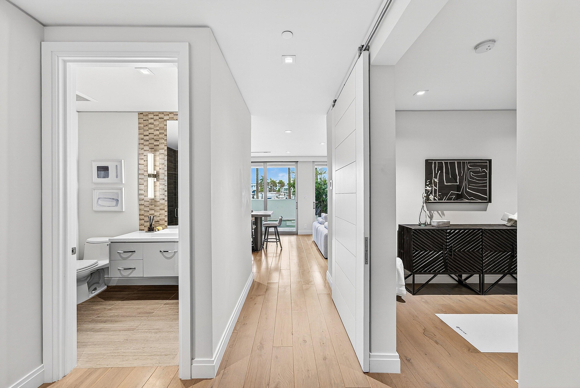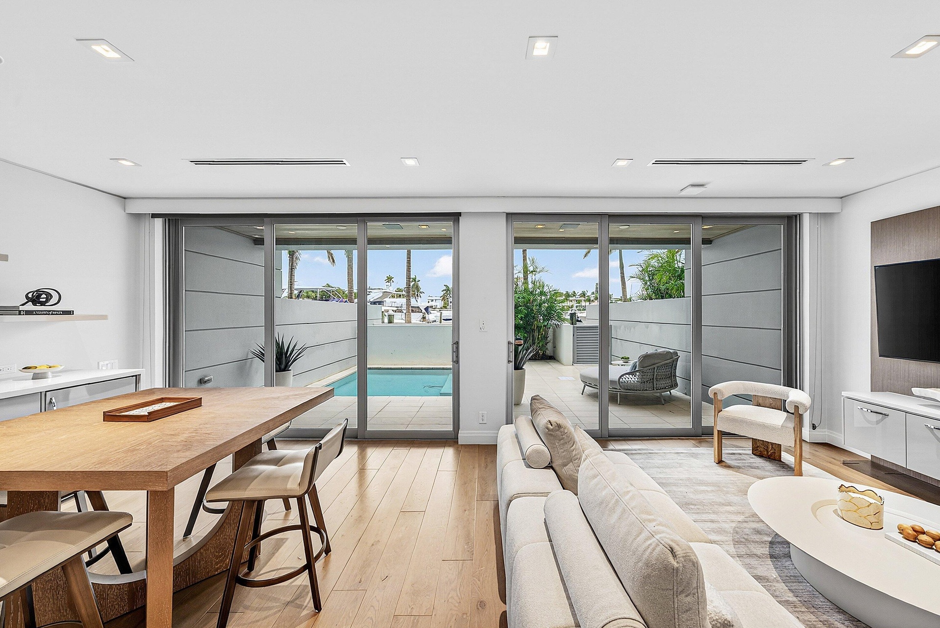 - Living, kitchen, and dining room with balcony and marina views