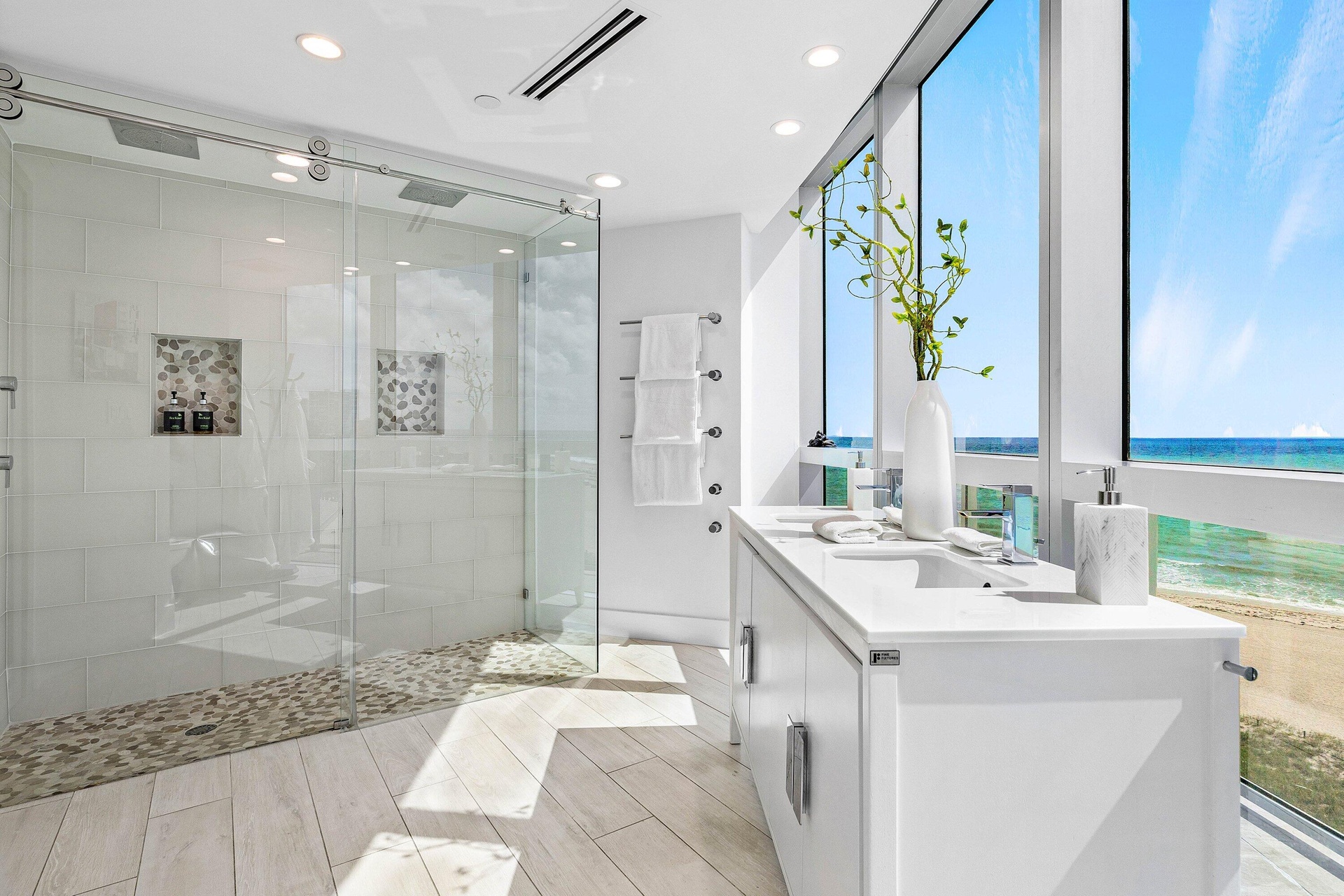 Featuring two spacious master suites plus a third en-suite guest bedroom, each with luxurious finishes. The open-concept living area flows seamlessly onto expansive wraparound terraces—perfect for entertaining or taking in the sunrise over the Atlantic. The European-style kitchen showcases custom cabinetry, a waterfall island, Sub-Zero refrigerator, wine cooler, and premium appliances. Additional highlights include motorized window treatments, marble flooring, walk-in closets and and a generous utility/pantry room.
