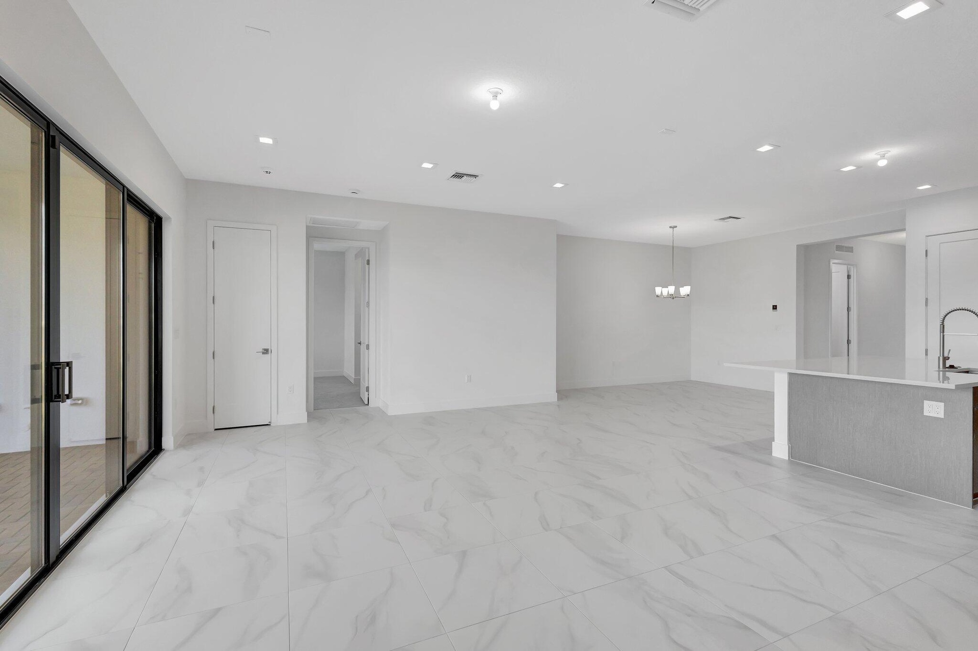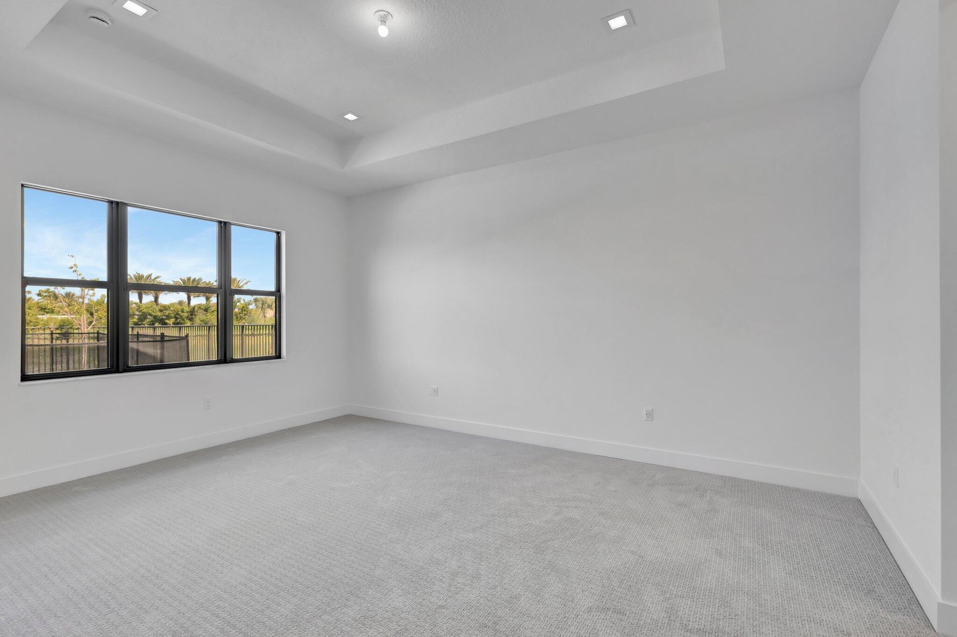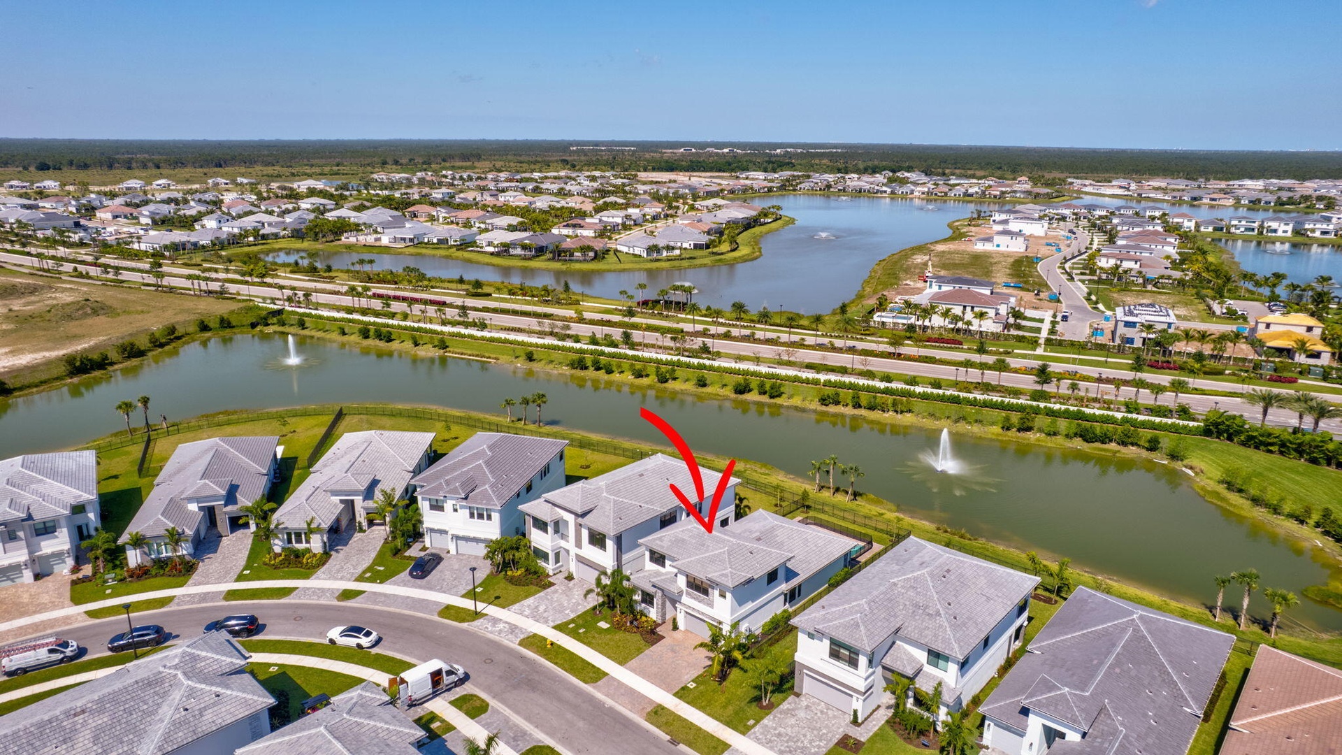 This residence in Avenir features a modern layout with open living spaces and lake views.
