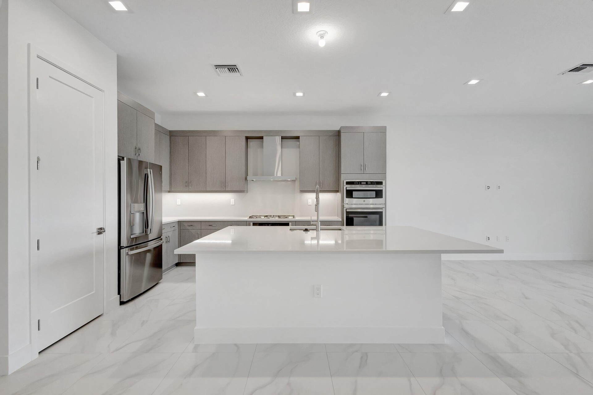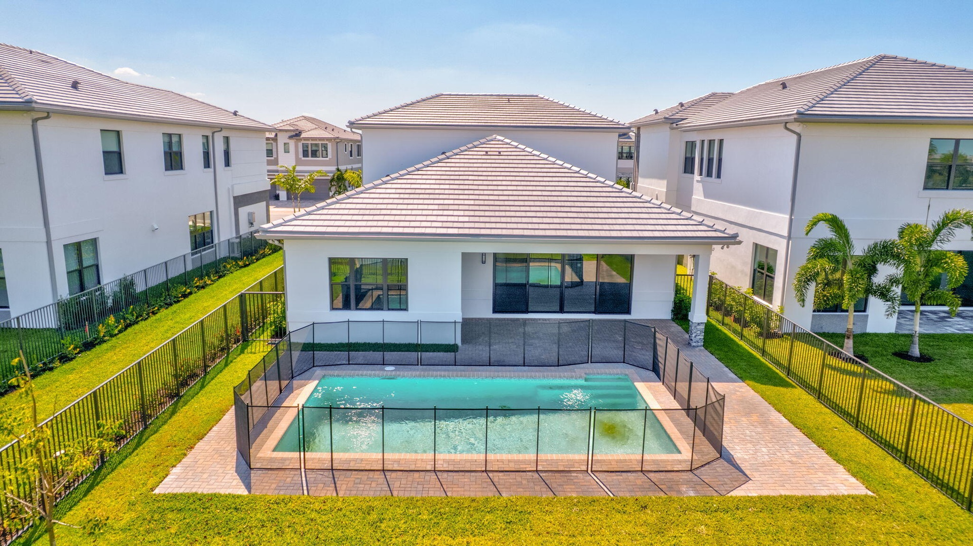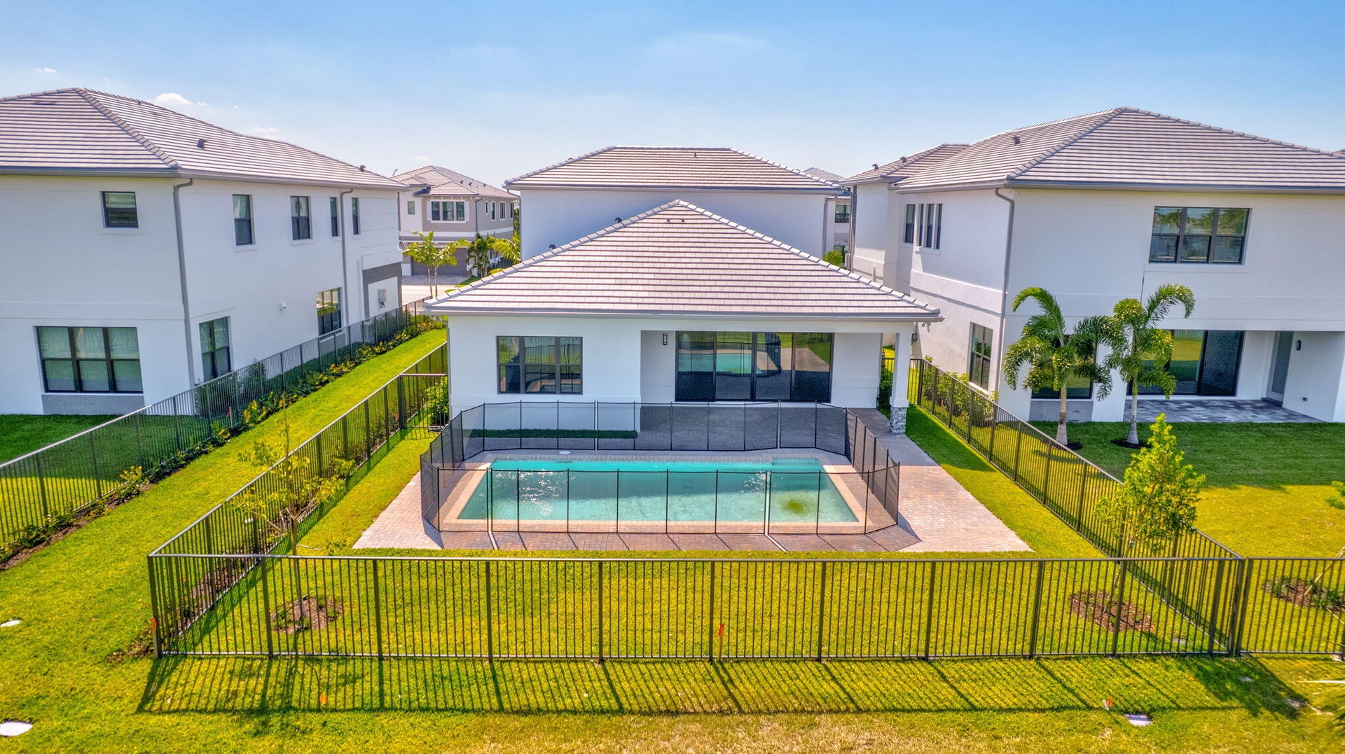 This residence in Avenir features a modern layout with open living spaces and lake views. Large sliding glass doors connect the main living area to a covered patio and private pool, creating an easy indoor-outdoor flow. Inside, the home offers large-format porcelain flooring, high ceilings, and a bright, open living and dining area. The kitchen is centered around a generous quartz island with custom cabinetry, pantry, and stainless appliances. The primary suite is located on the first floor and includes dual walk-in closets and a spacious bathroom with freestanding soaking tub, oversized shower, and double vanities. A well-designed home with clean finishes, natural light, and a functional layout in the community of Avenir. Schedule your private showing today.