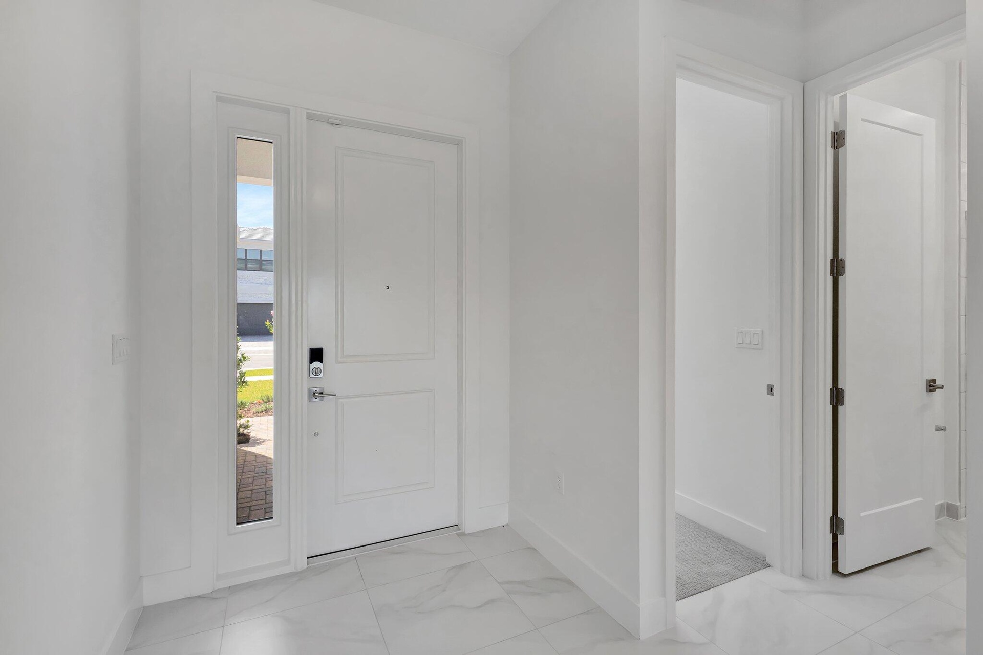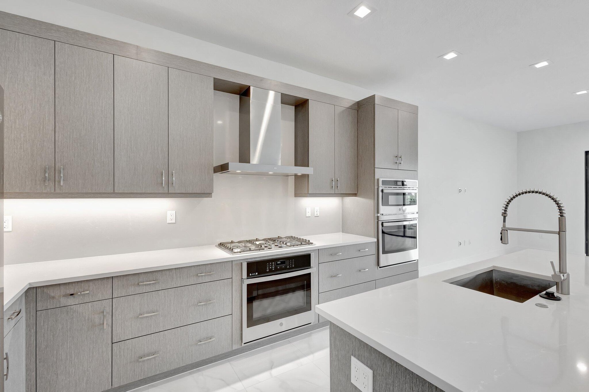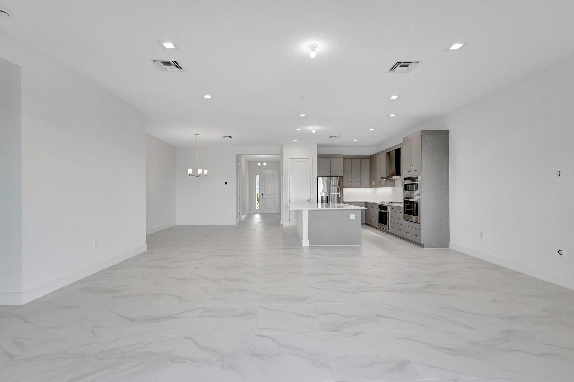 This residence in Avenir features a modern layout with open living spaces and lake views. Large sliding glass doors connect the main living area to a covered patio and private pool, creating an easy indoor-outdoor flow. Inside, the home offers large-format porcelain flooring, high ceilings, and a bright, open living and dining area. The kitchen is centered around a generous quartz island with custom cabinetry, pantry, and stainless appliances. The primary suite is located on the first floor and includes dual walk-in closets and a spacious bathroom with freestanding soaking tub, oversized shower, and double vanities. A well-designed home with clean finishes, natural light, and a functional layout in the community of Avenir. Schedule your private showing today.
