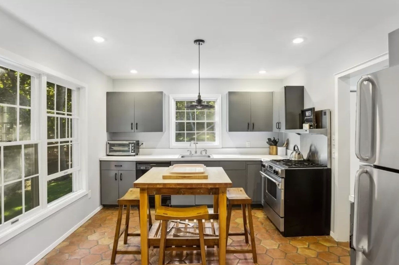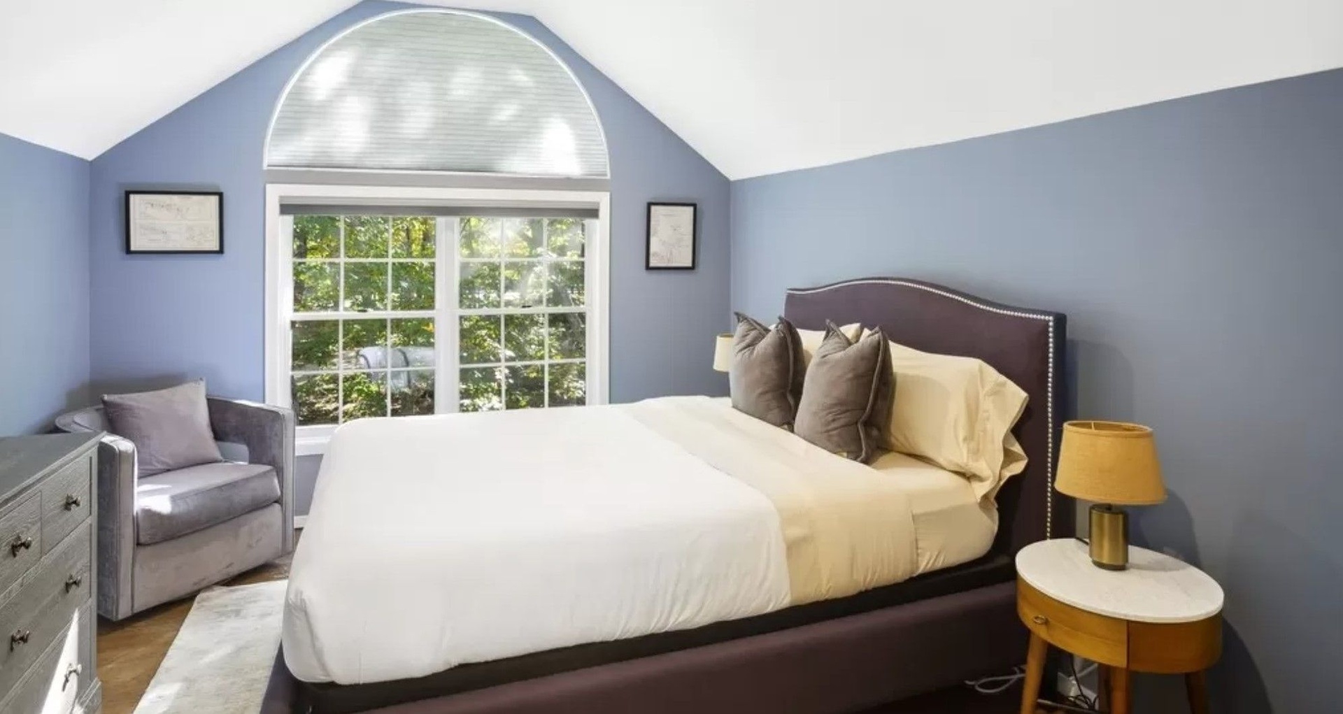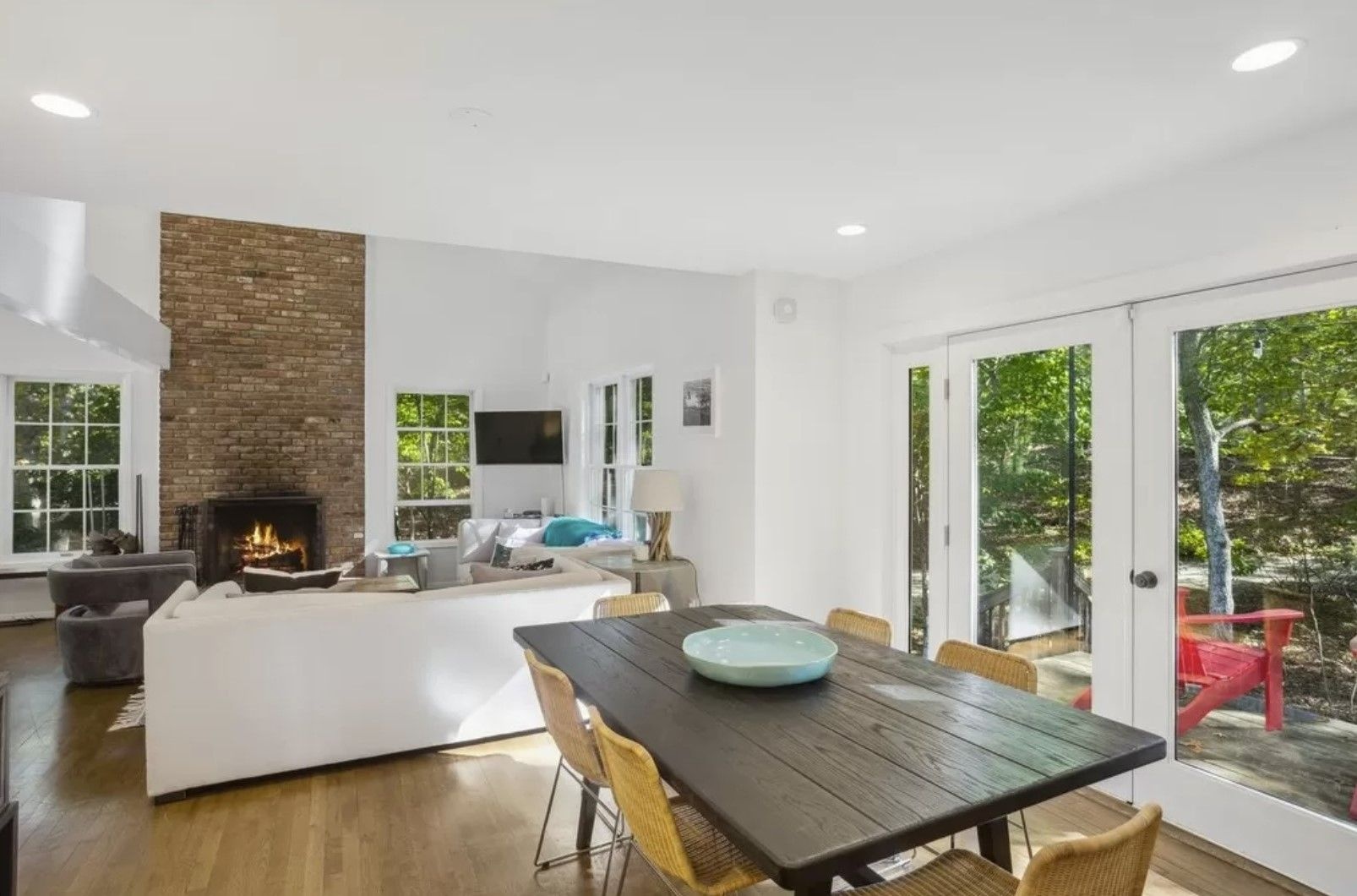 Inside, the home is warm and inviting with a living room centered around a wood-burning fireplace, kitchen, and a convenient first-floor ensuite bedroom. Upstairs features the ensuite primary bedroom, an additional guest bedroom, and full guest bath.