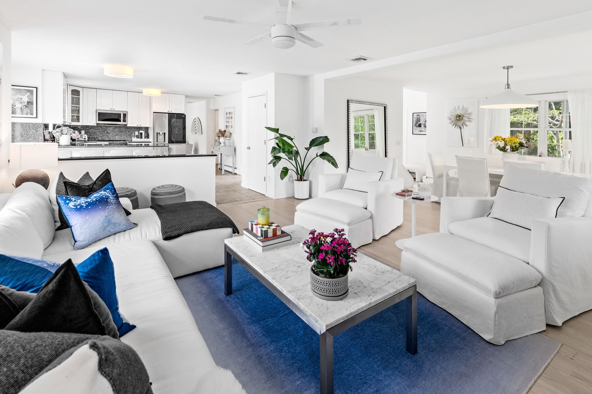 The main floor features an open and airy layout with a modern eat-in kitchen, a sophisticated dining area, and a relaxed living room that’s ideal for entertaining or unwinding after a day at the beach. Upstairs, all four bedrooms await, including a spacious primary suite with dual walk-in closets and a serene en-suite bath.