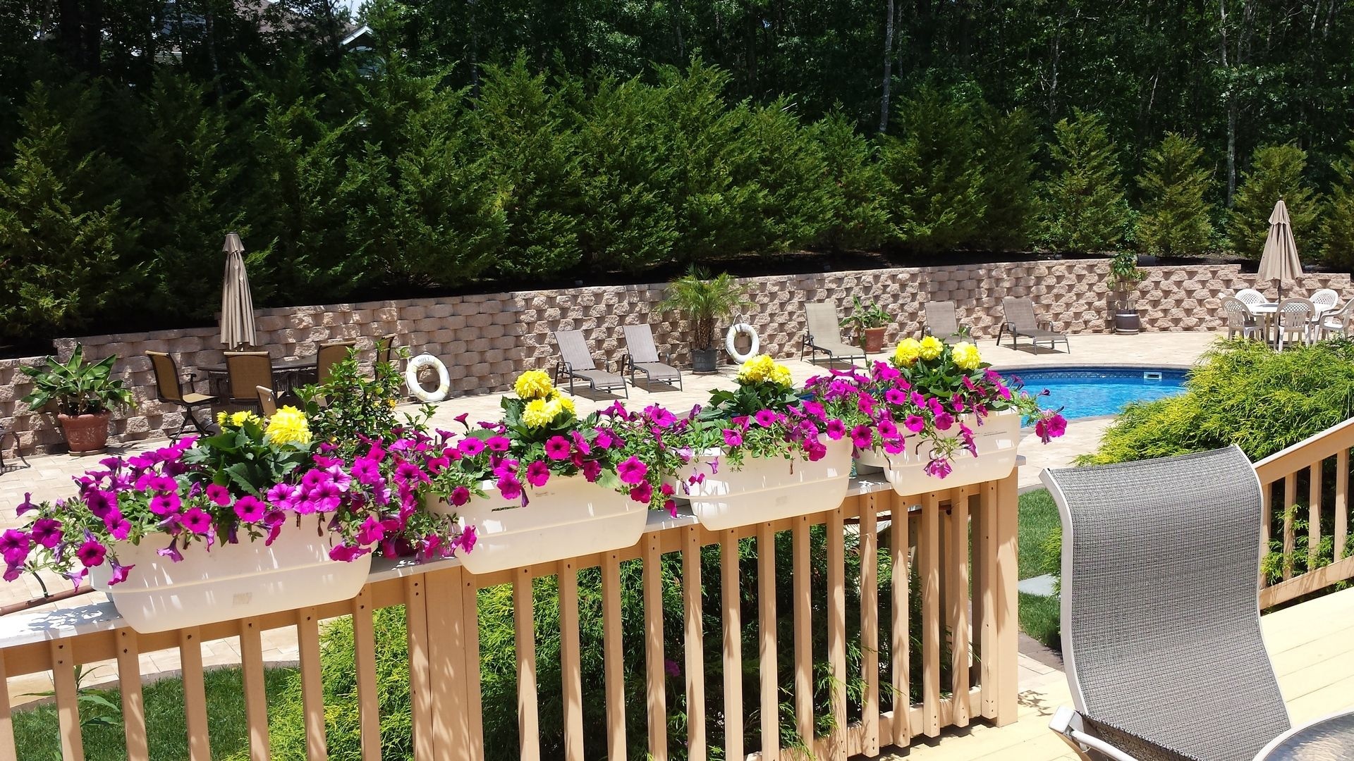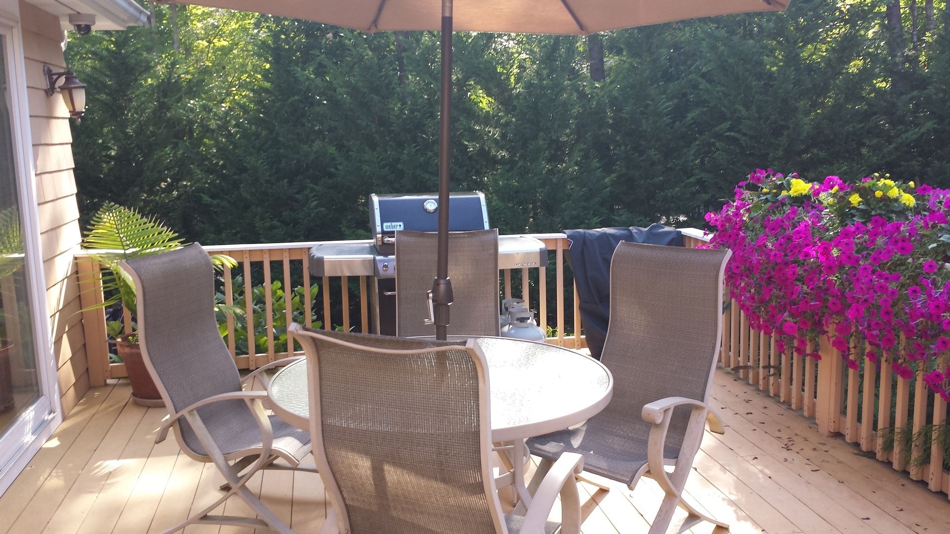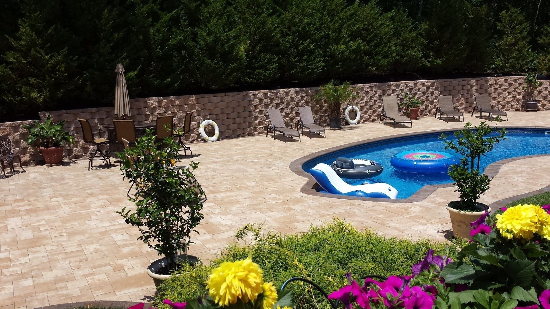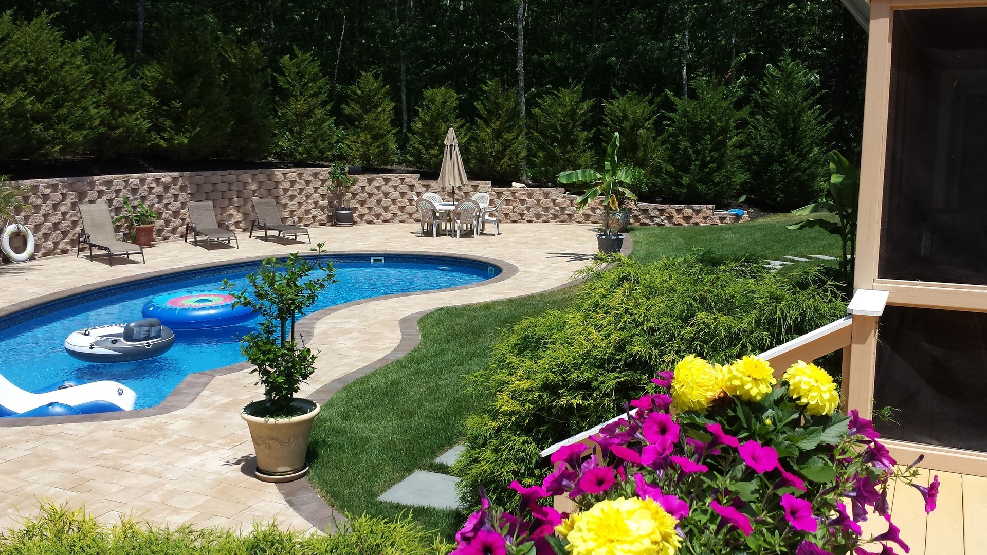 *Private Backyard with heated pool, expansive surrounding pavers, adjoining deck with 10-seat picnic table and BBQ, griddle, outside bar,2 gazebos with seating for 10, chaise lounges, multiple floats, games provided
