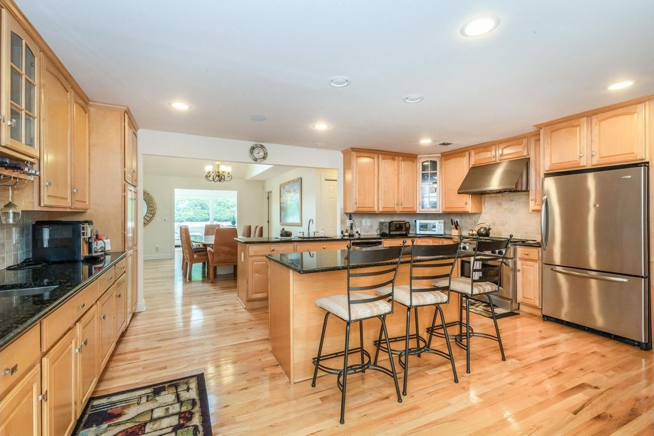 *Chef’s kitchen with stainless-steel appliances and island seating