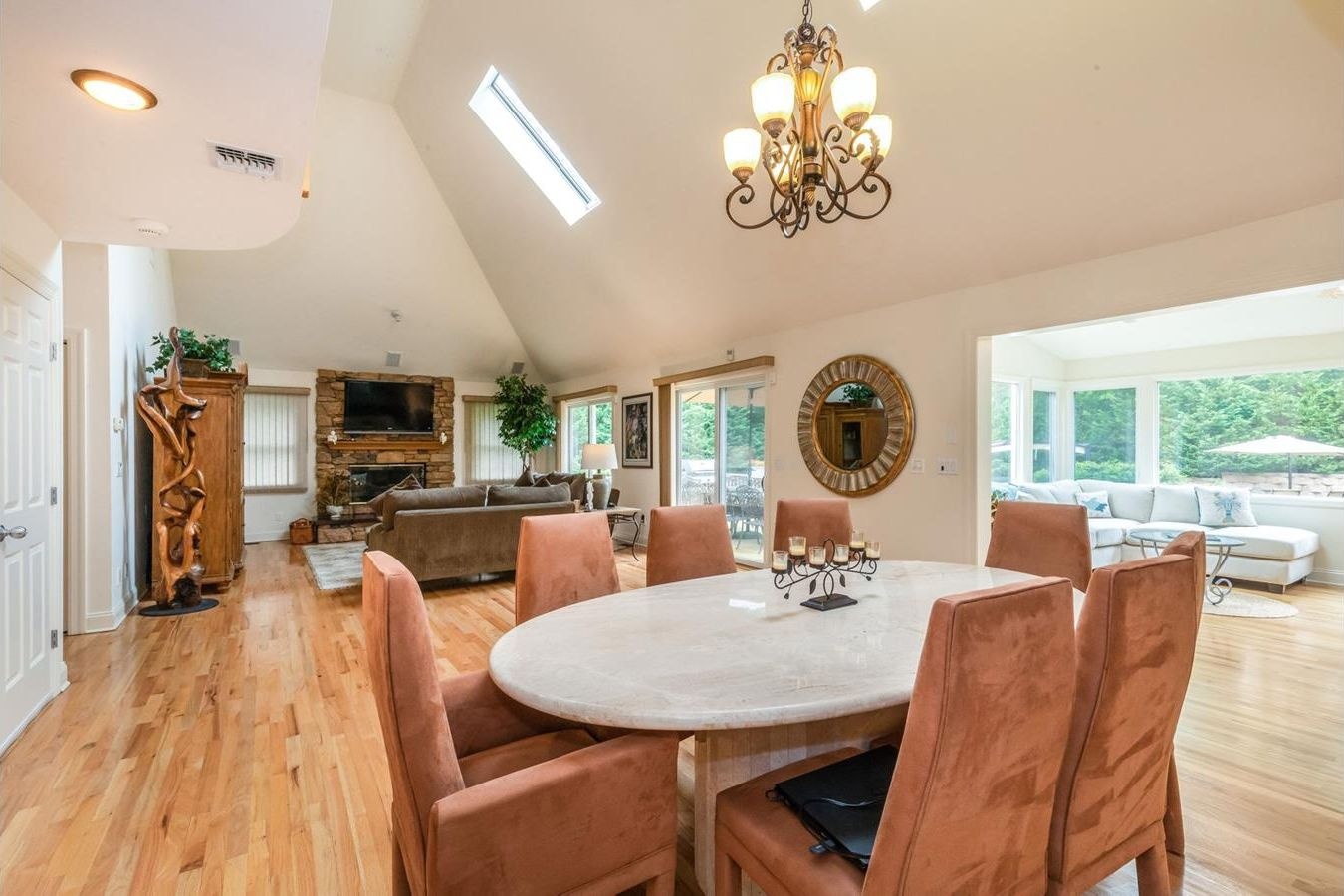*Great room with open floor plan, vaulted ceilings, skylights, adjoining dining area for 10, and a gas fireplace