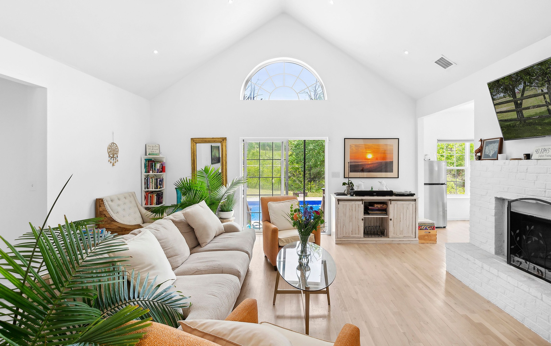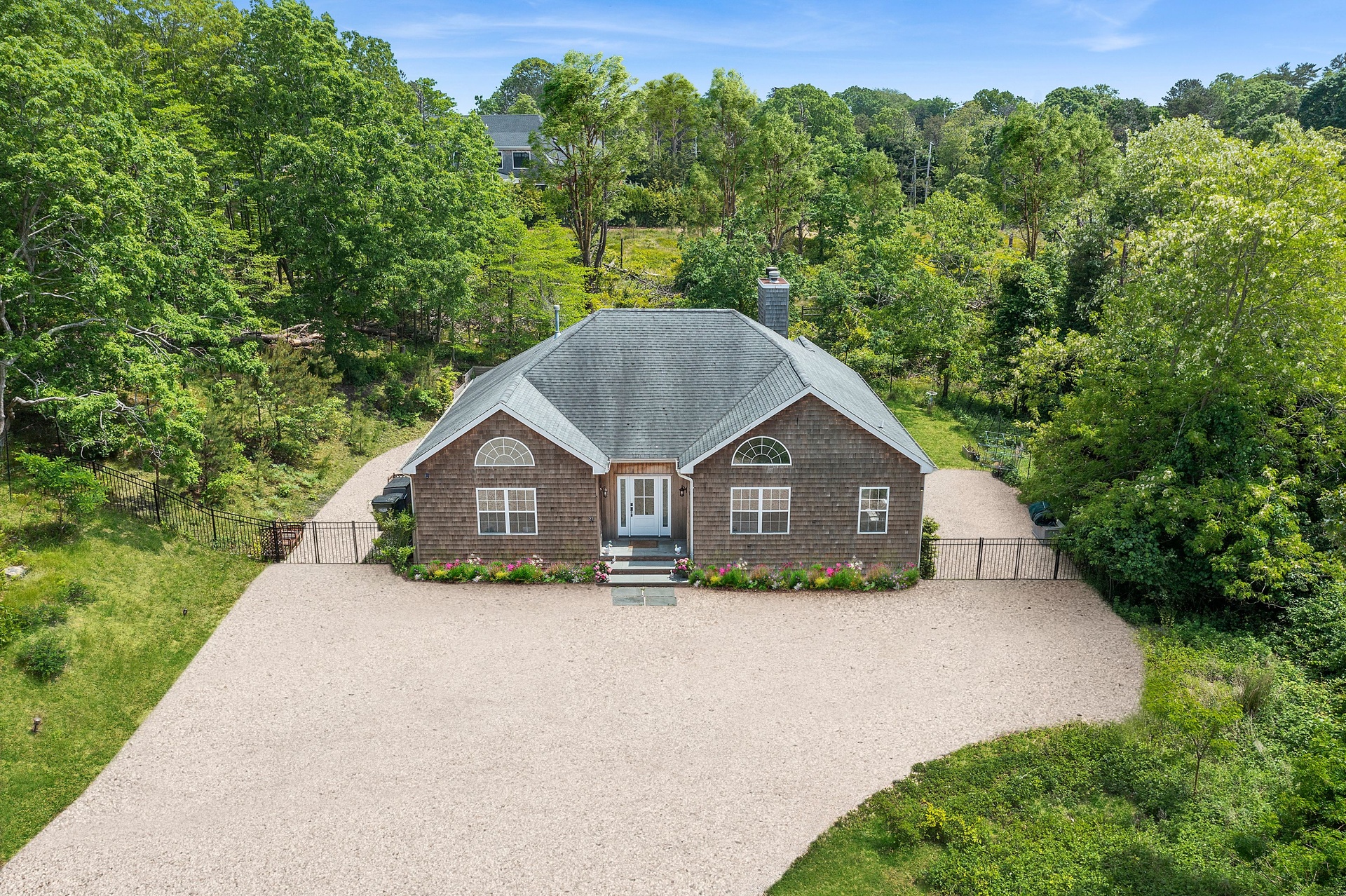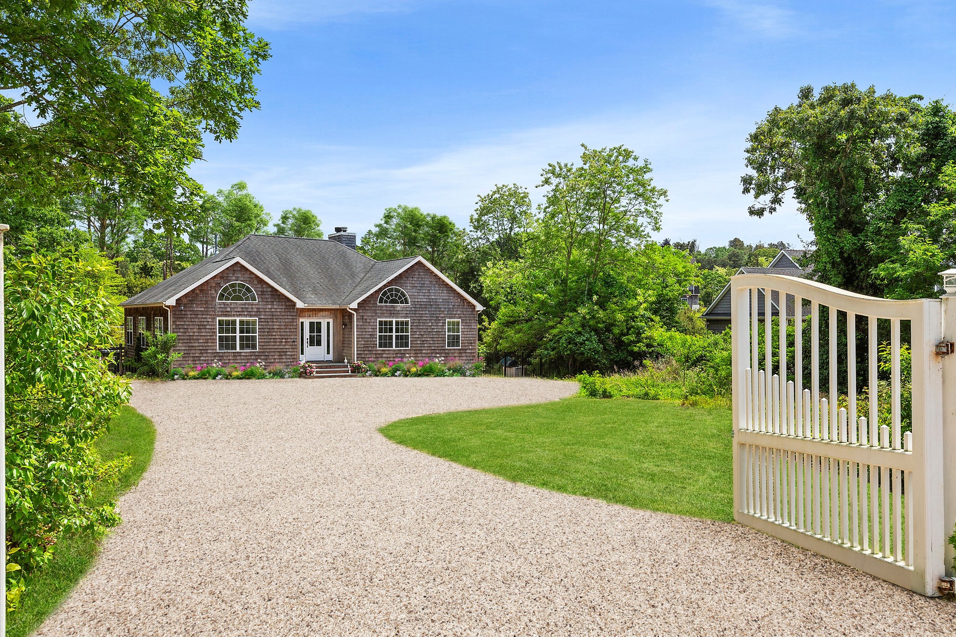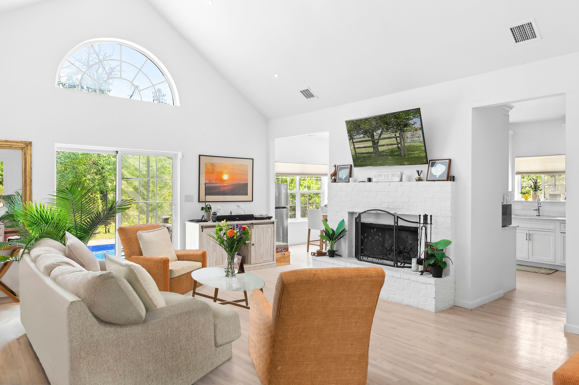 The tranquil grounds feature a Hamptons-style 4-bedroom, 3-bathroom residence with approximately 2,100 sq. ft. of finished interior living space, plus an additional 1,552 sq. ft. of unfinished space in the lower level. Situated on a .61-acre parcel on a quiet, no through-traffic road, this impeccable home includes an entry foyer, high-end kitchen, living room with a wood-burning fireplace, primary bedroom with walk-in closet and en-suite bathroom, junior primary guest bedroom with en-suite, and two more guest bedrooms with a shared bathroom. The light-filled living room benefits from vaulted ceilings and sliding glass doors that lead out to the patio and pool area.