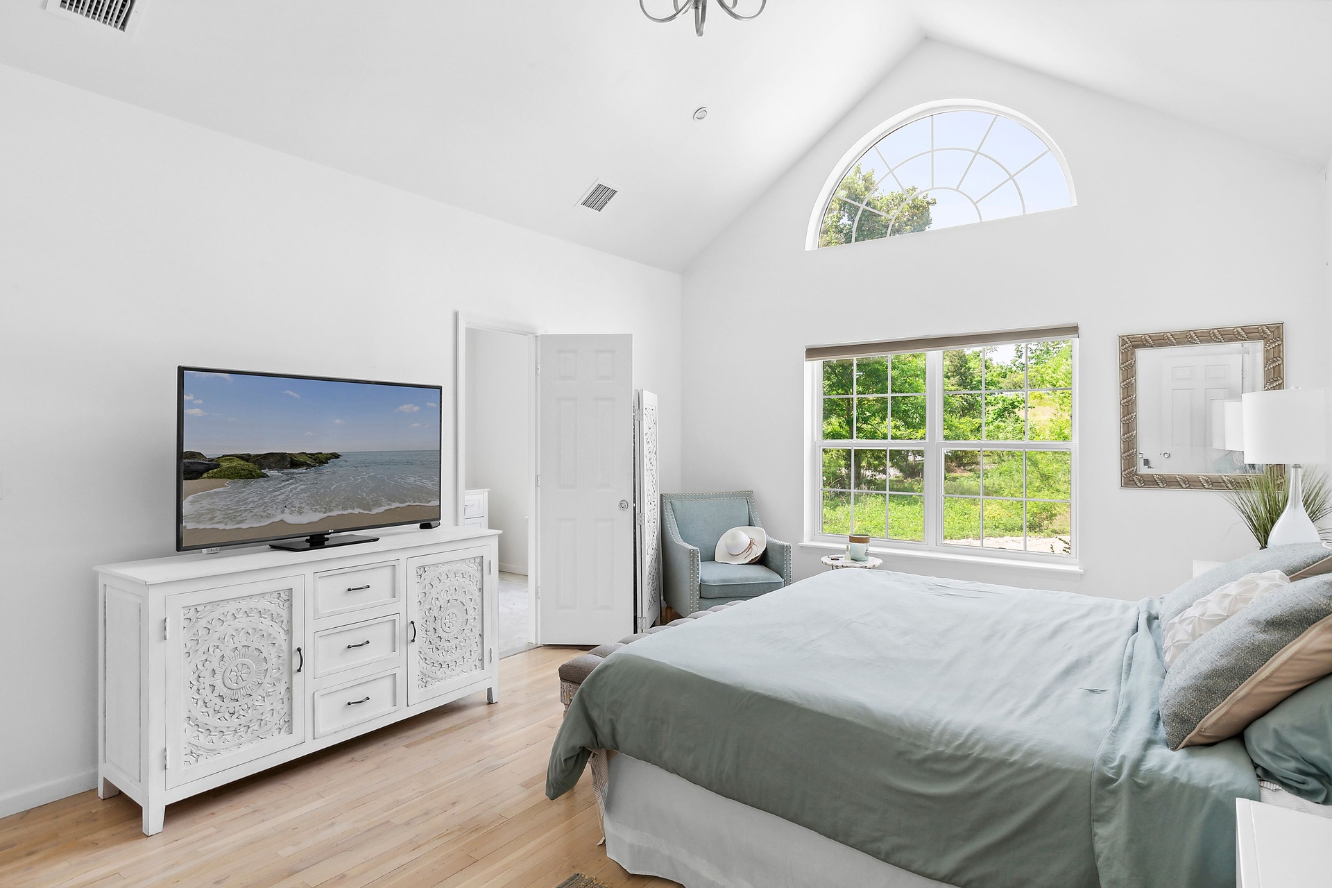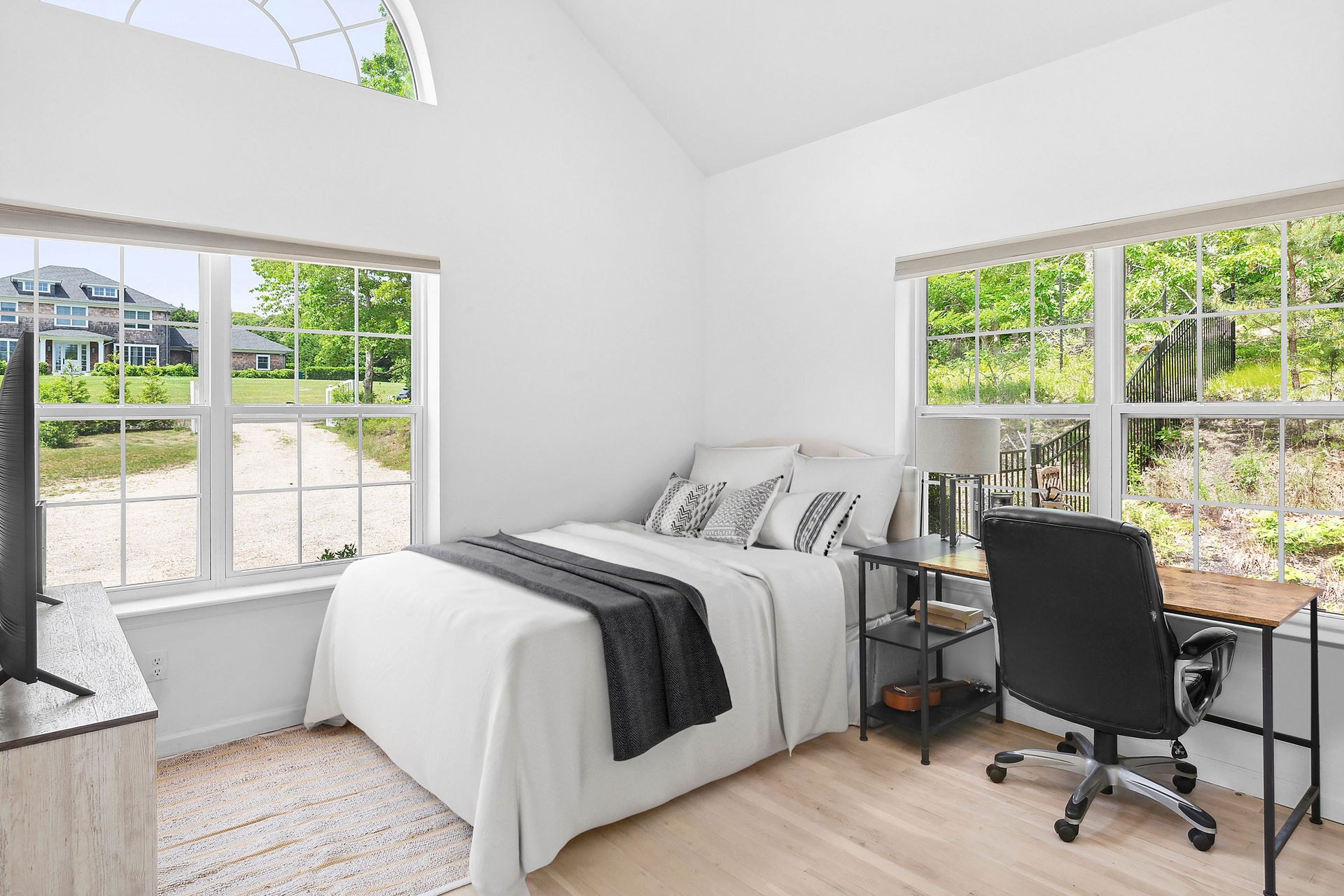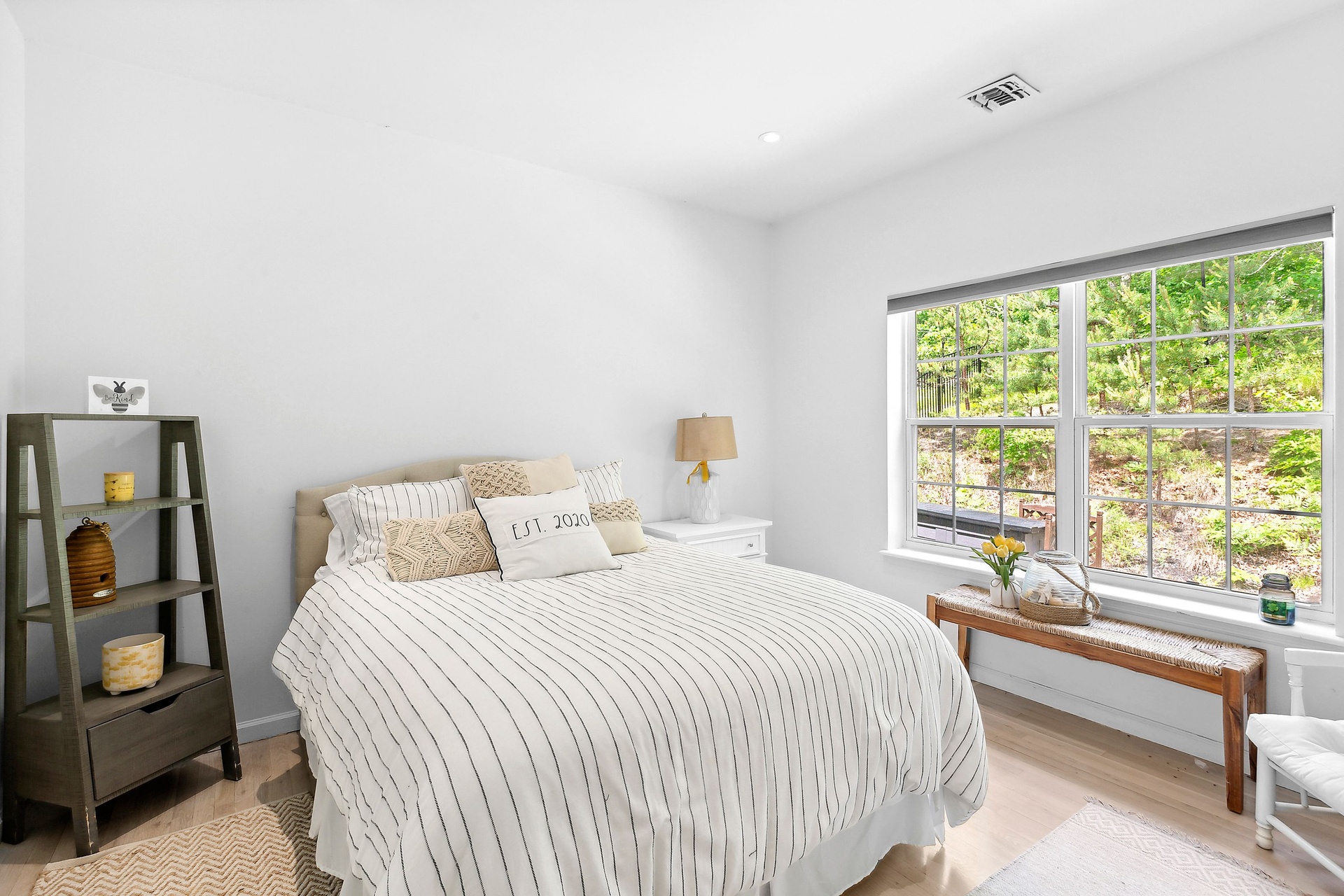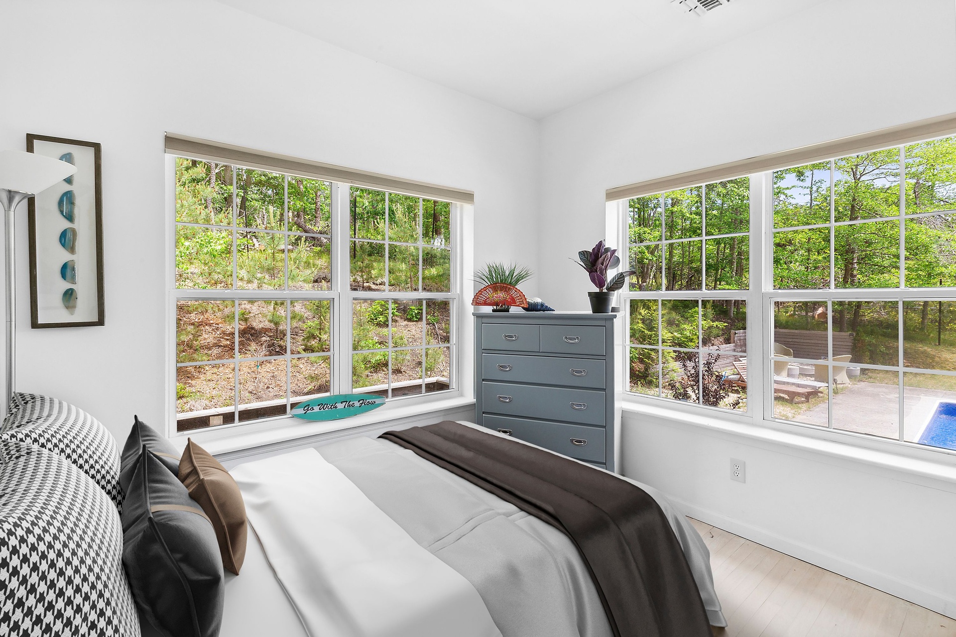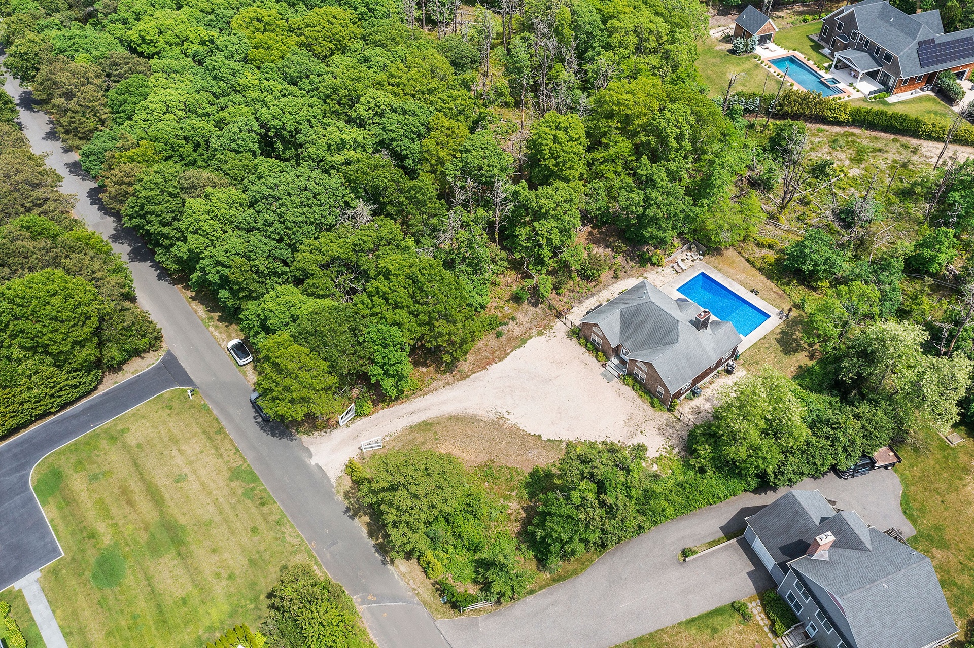 The tranquil grounds feature a Hamptons-style 4-bedroom, 3-bathroom residence with approximately 2,100 sq. ft. of finished interior living space, plus an additional 1,552 sq. ft. of unfinished space in the lower level. Situated on a .61-acre parcel on a quiet, no through-traffic road, this impeccable home includes an entry foyer, high-end kitchen, living room with a wood-burning fireplace, primary bedroom with walk-in closet and en-suite bathroom, junior primary guest bedroom with en-suite, and two more guest bedrooms with a shared bathroom. The light-filled living room benefits from vaulted ceilings and sliding glass doors that lead out to the patio and pool area.