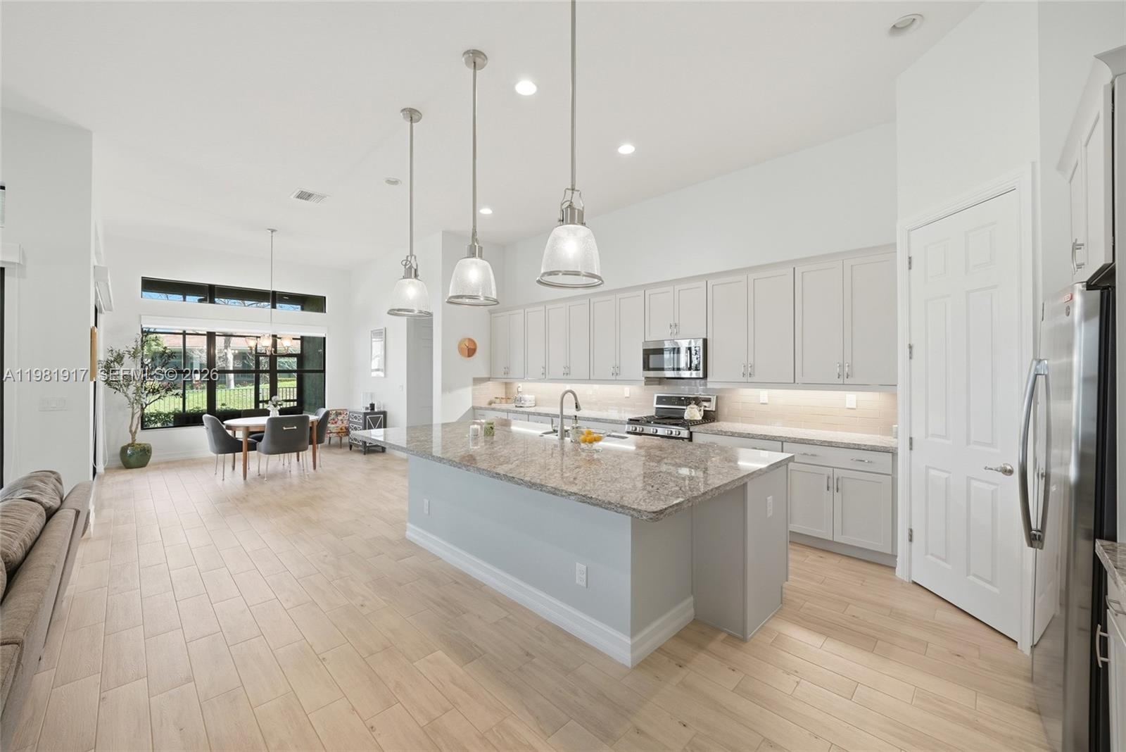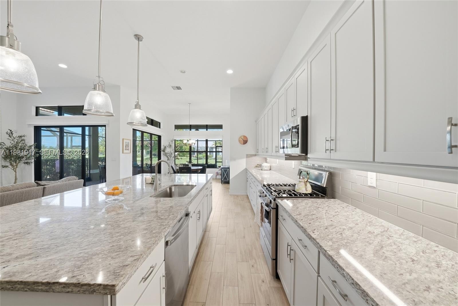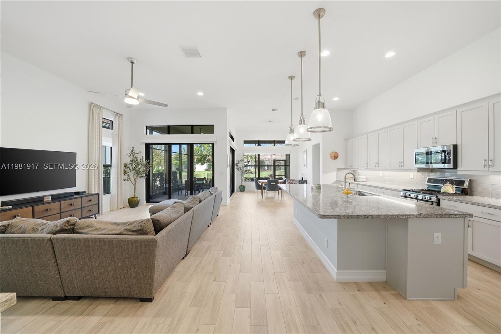 Interior highlights include a Generous Kitchen Island, Upgraded Custom Wet bar with a Wine refrigerator, and triple pocket sliding glass doors from both the living and dining areas, creating seamless indoor-outdoor living. The Primary Suite features Multiple windows that capture peaceful water views!