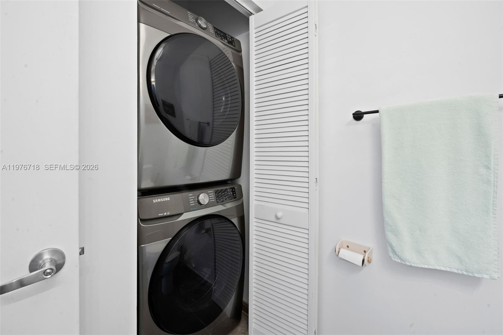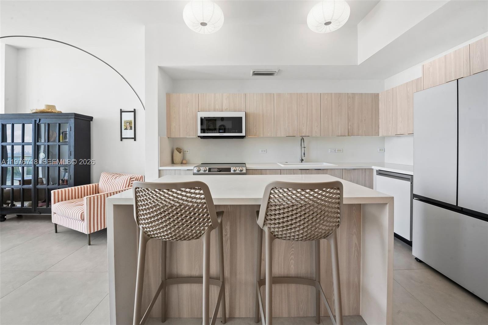 The residence itself is oversized for the category a true one-bedroom with soaring ceilings, a proper guest bath, and a layout that breathes. The renovation is tasteful: light-wood cabinetry, white stone countertops, and stainless steel appliances anchor a kitchen that reads clean without trying too hard. Large-format tile flows throughout, keeping the home bright and effortless to maintain. An in-unit washer/dryer adds the kind of quiet practicality that elevates daily life.