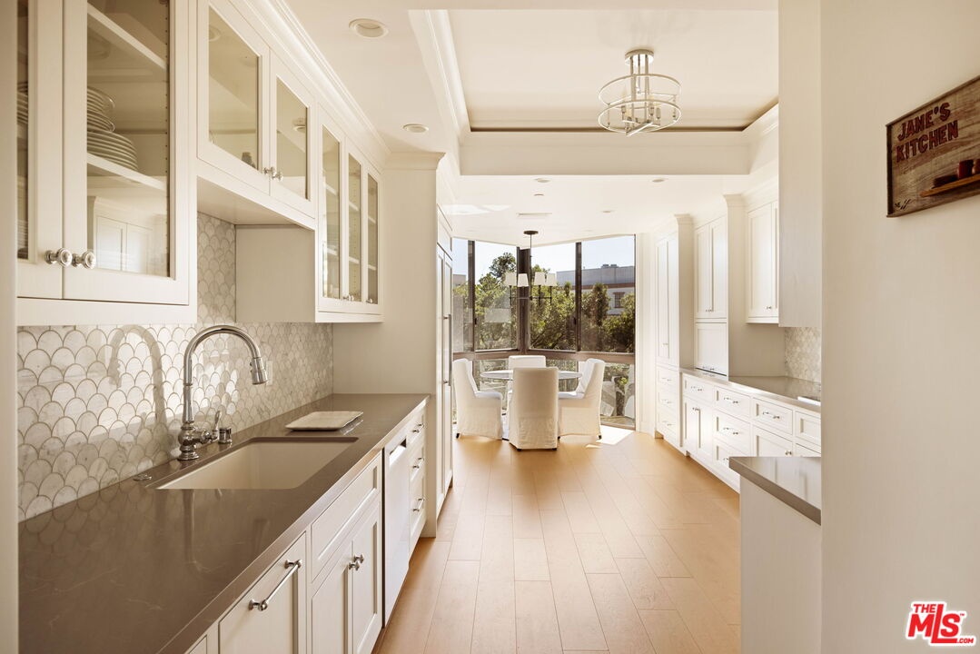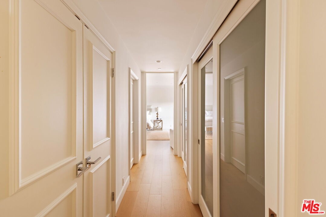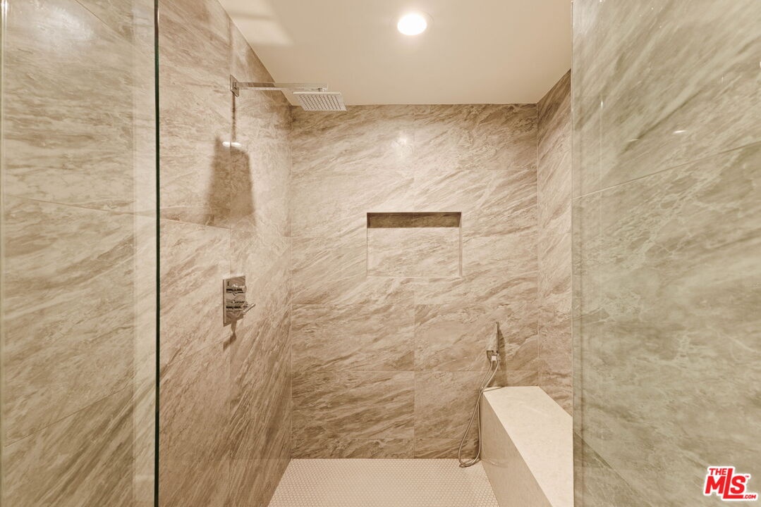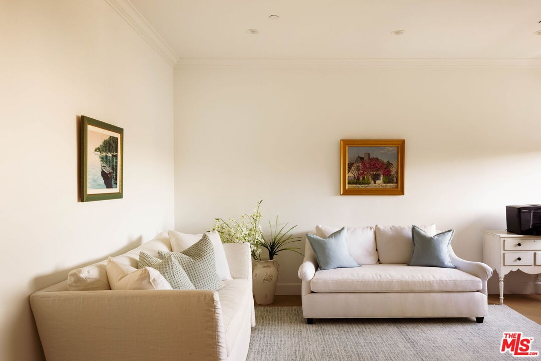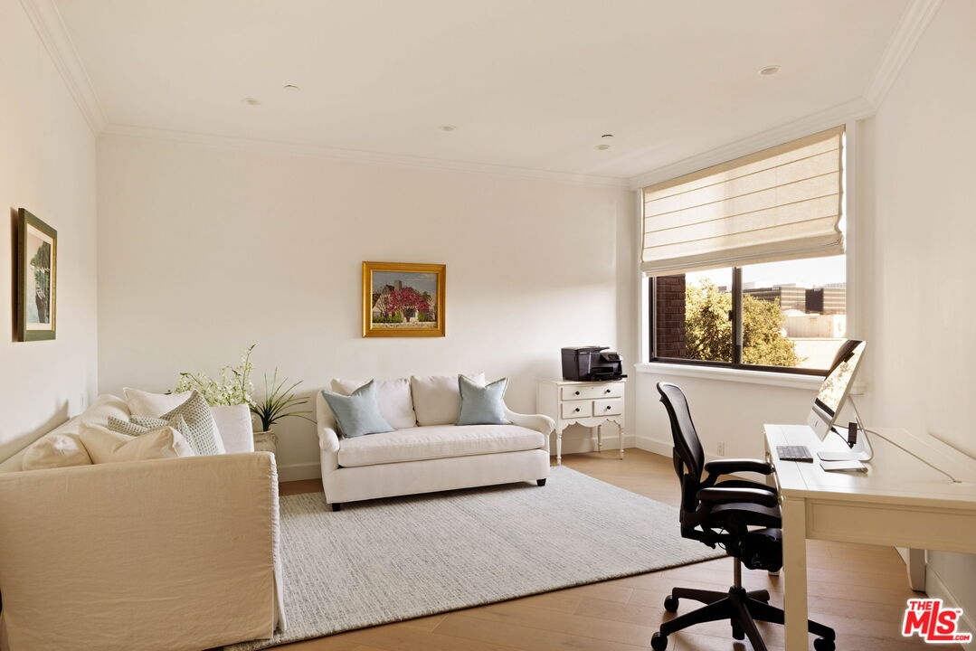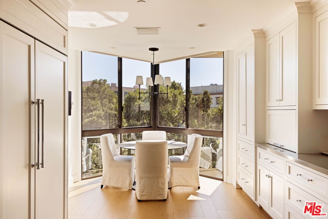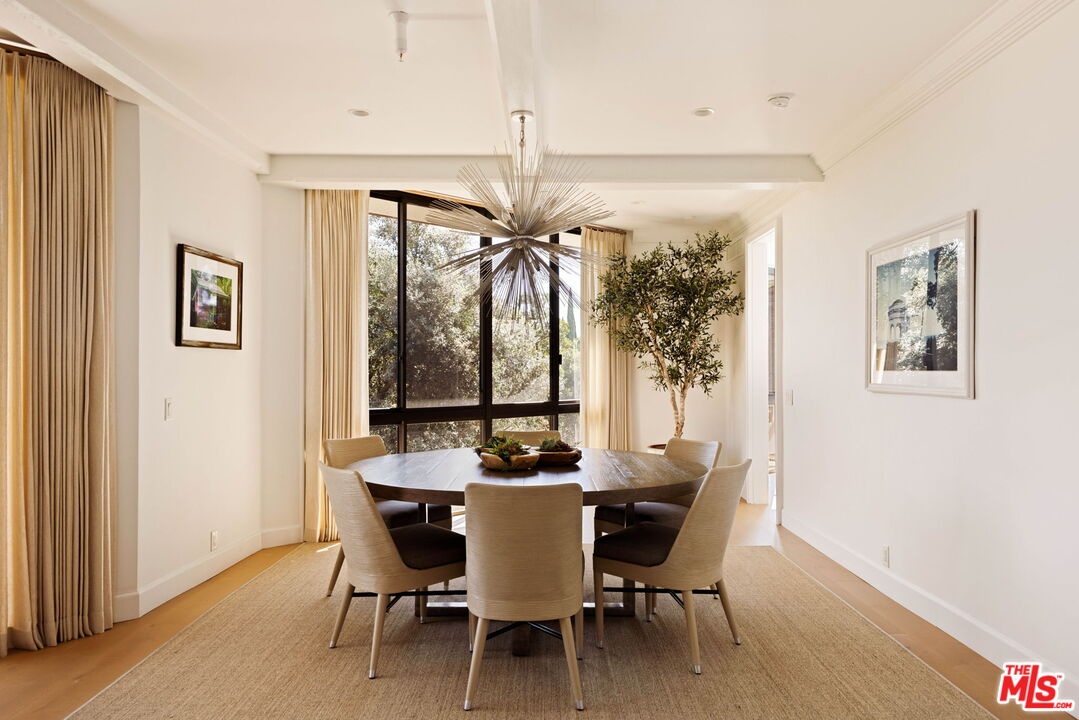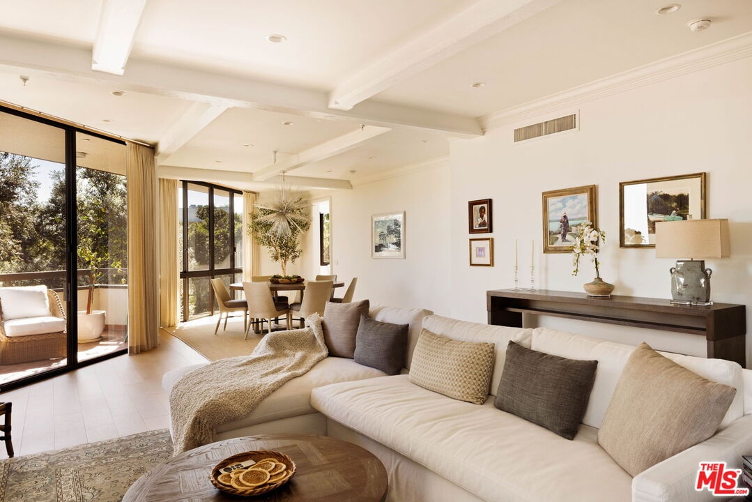 Welcome to Unit 354, a meticulously renovated 2-bedroom + den/office/media room at the iconic IV Seasons Condominiums in the heart of Beverly Hills. Enjoy the ultimate in luxury and convenience with 24/7 doormen, valet parking, and access to the building's pool, gym, and spa, all complemented by proximity to Beverly Hills' renowned schools, restaurants, and designer shops on Rodeo Drive, as well as Whole Foods and Erewhon. This sun-filled, southeast-facing residence was fully renovated in 2022, creating a completely turn-key experience. A grand foyer sets an impressive tone upon entry, with wide-plank wood floors leading into a dramatic living room featuring high ceilings, exposed beams, a fireplace, and sliding doors to a tranquil private patio, perfect for entertaining or relaxing in privacy. The dining area comfortably seats eight and flows seamlessly into a sun-flooded eat-in kitchen equipped with premium Wolf and Bosch appliances. The den/office offers flexible space for a home office, guest room, or media room, while the second bedroom features an ensuite bath and abundant natural light. The primary suite, occupying a private wing at the end of a hallway lined with closets, is a serene retreat. Its spa-like ensuite bathroom includes double vanities, a built-in dressing table, a freestanding soaking tub, and an oversized shower. Boasting one of the building's most spacious layouts, this elegant unit combines sophisticated design, modern upgrades, and a prime Beverly Hills location. A rare opportunity for refined living at the IV Seasons.