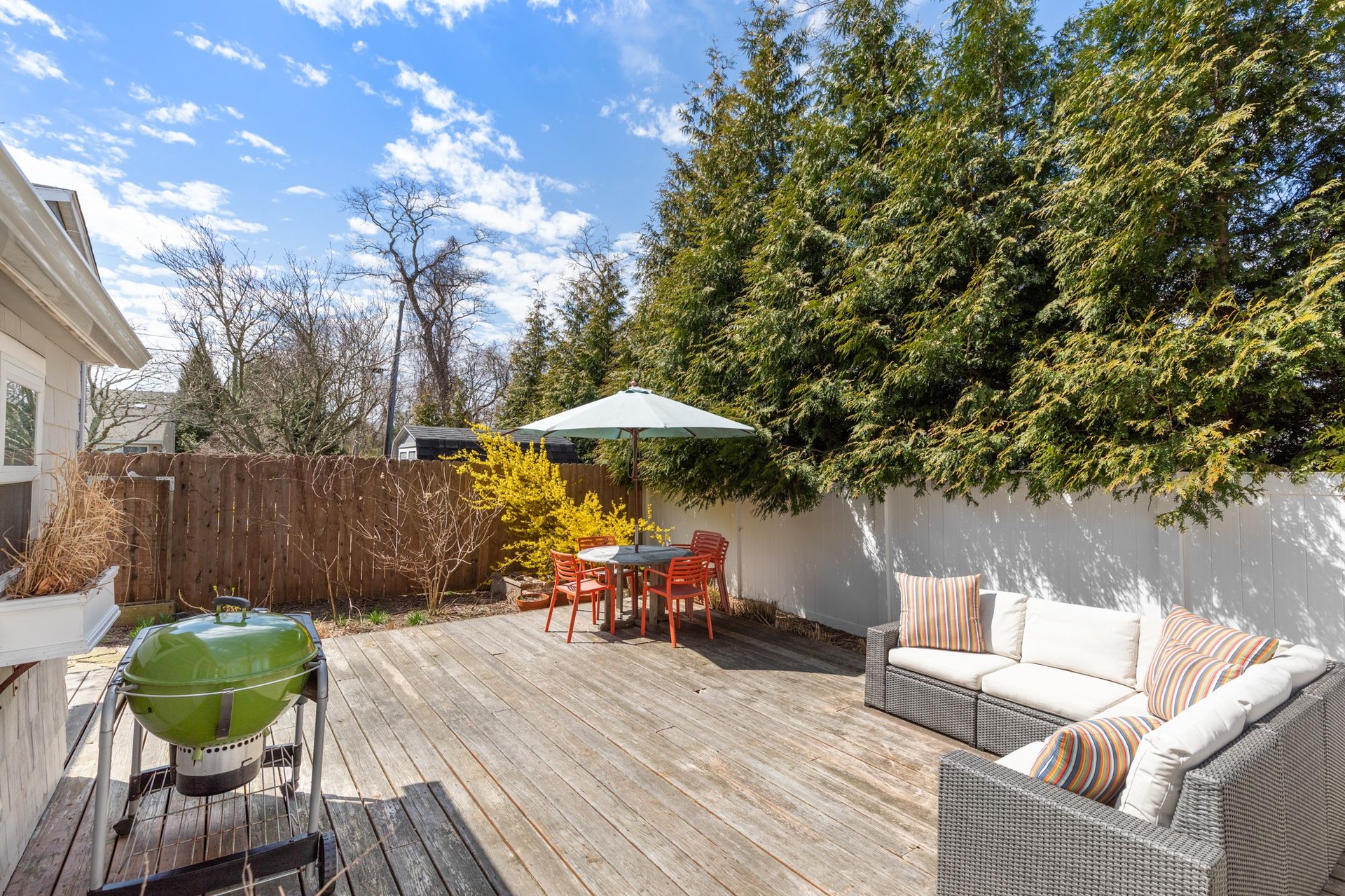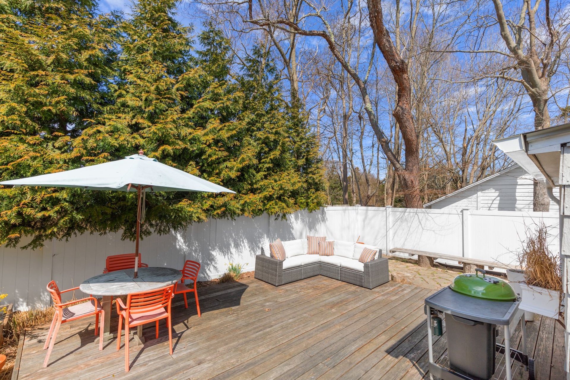 A large deck which is perfect for al fresco dining and entertaining as well as an outdoor shower and mature plantings that bloom during the spring and summer months round out this offering.