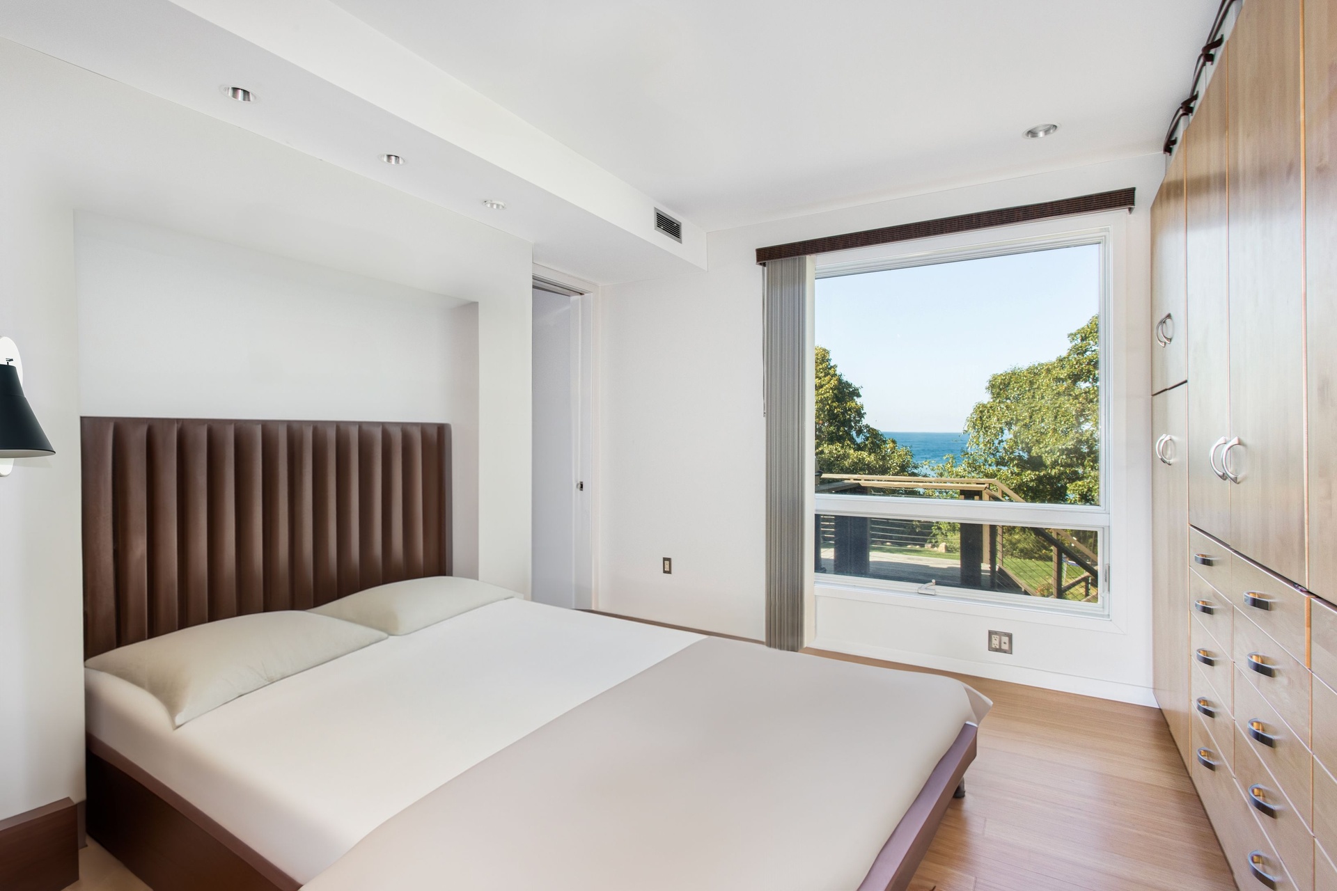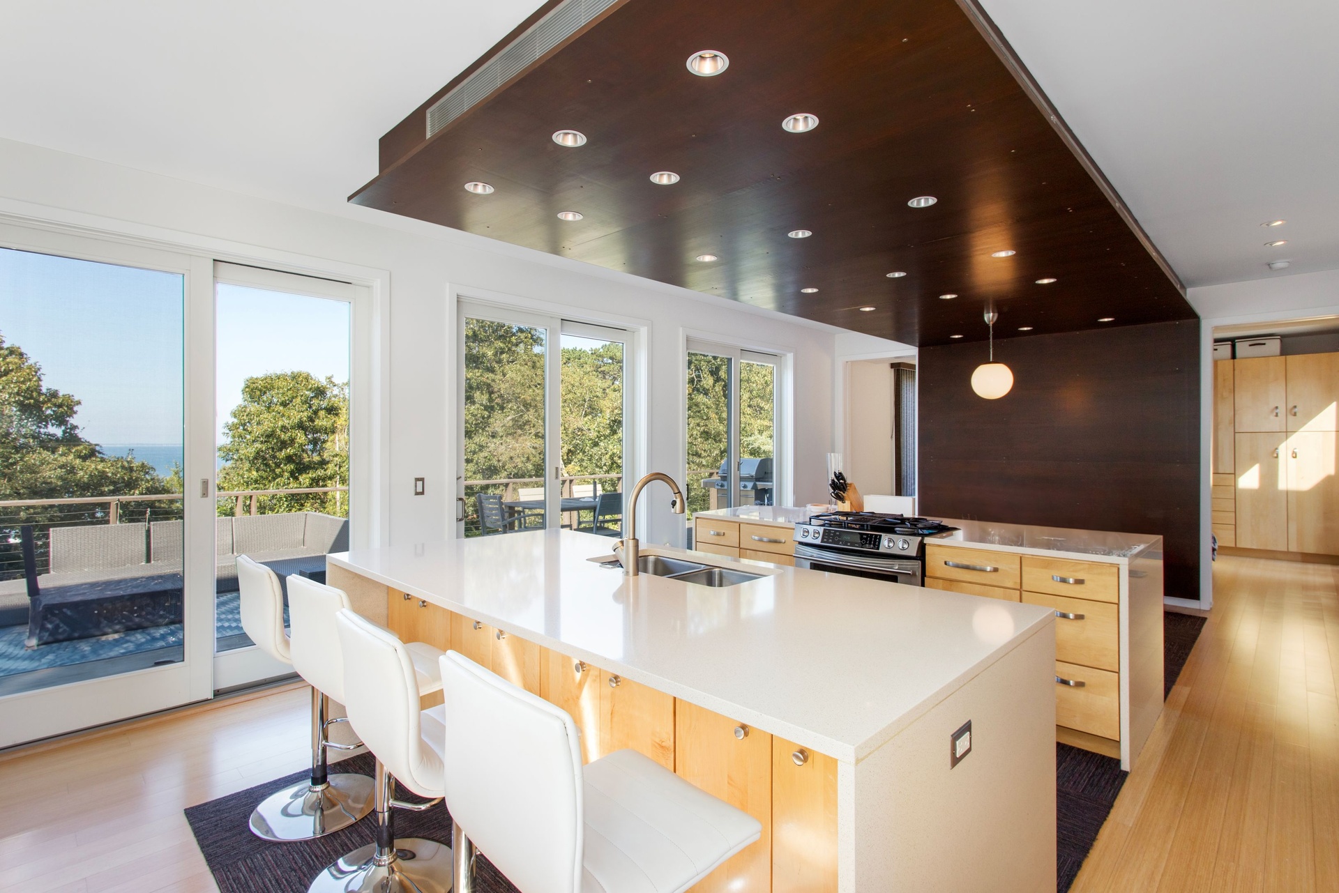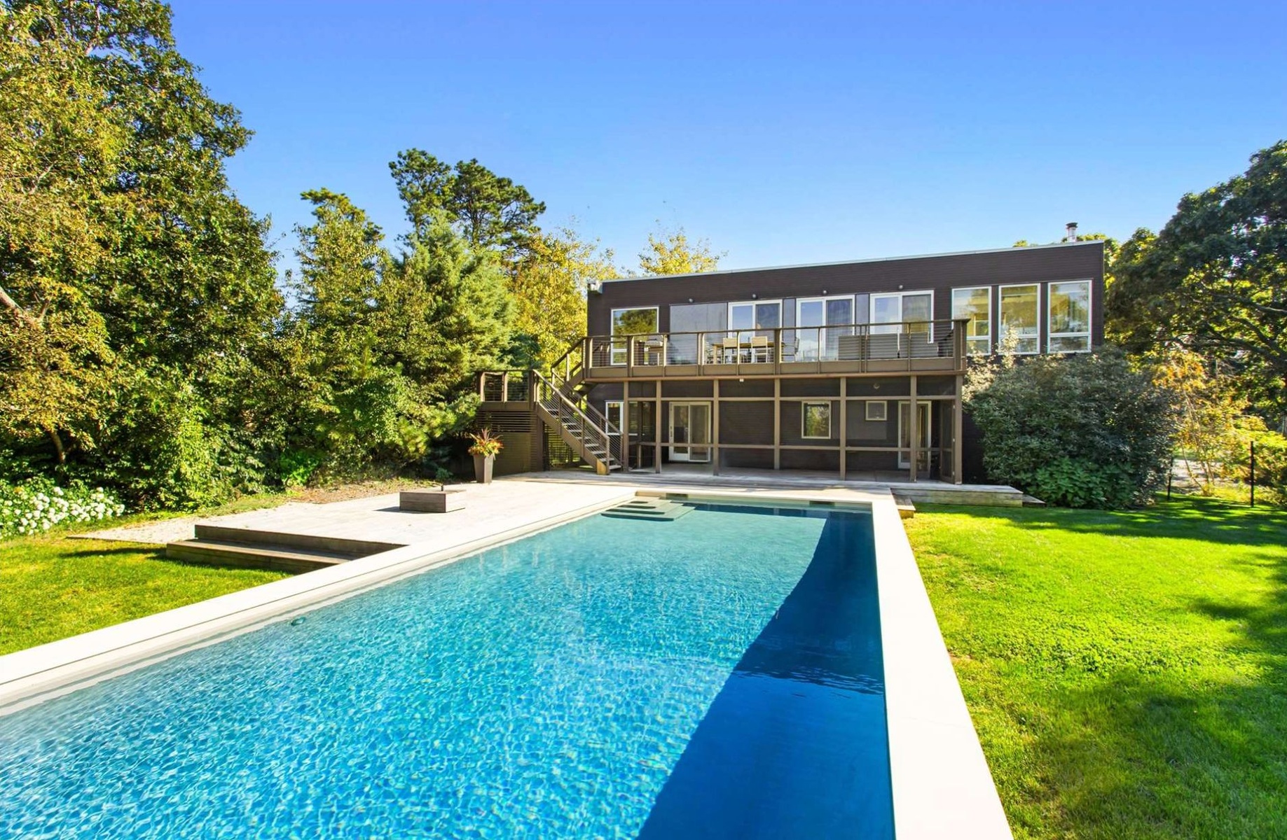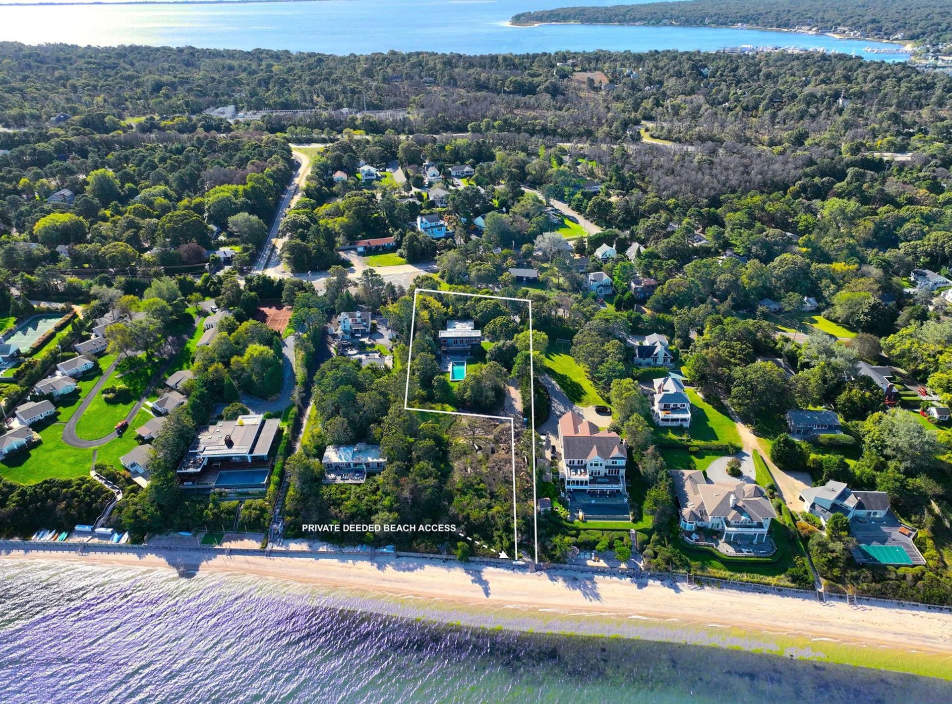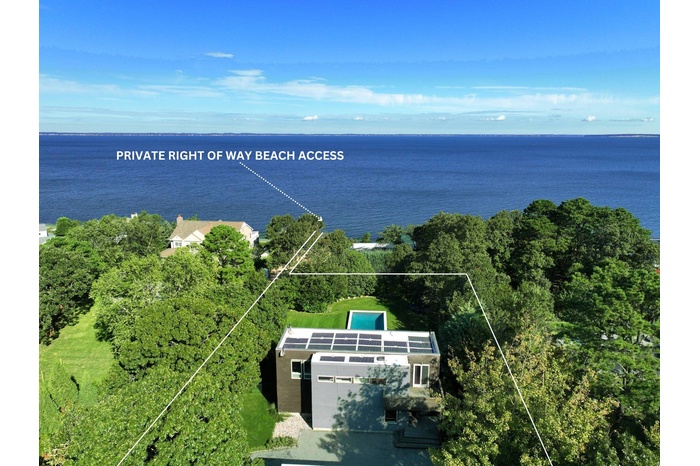 Nestled along the sun-kissed shores of the Hamptons, this extraordinary Modern Beach House is a serene retreat with rights to a pristine private Peconic Bay beach. This striking residence epitomizes the marriage of European sophistication with contemporary allure. Set on a shy 3/4 acre lot, perched high above with northerly views of the expansive waters of the Peconic Bay, this beachside home flawlessly combines sustainable modernity with a European flair. The interior of this residence is a testament to luxury and eco-conscious design. High ceilings, stunning bamboo hardwood flooring, and floor-to-ceiling glass create a bright and airy atmosphere, letting in an abundance of natural light. With three bedrooms and two baths, this is the perfect Hamptons summer getaway. A fully equipped chef's kitchen, complete with stainless steel appliances, ensures that meal preparation is a delight, especially with the northfacing Bay views as your backdrop. A series of expansive, multi-level mahogany decks encircle the property, creating the ideal setting for beachside living. Whether you're hosting elegant gatherings under the stars or seeking a peaceful retreat to enjoy the saltwater Bay breeze, these outdoor areas are a seamless extension of your coastal sanctuary. An oversized gunite pool, wrapped instone and mahogany, is perfect for entertaining throughout the summer. Just steps from the pool lies the pristine Bay beach, an exclusive sanctuary where you can enjoy the soft sands, the gentle lapping of the waves, and the pure bliss of beachfront living. All of this is conveniently located within minutes of local marinas and renowned shopping and dining options. This European-inspired modern beach house is more than a home-it's a haven of elegance and serenity in the heart of the Hamptons.