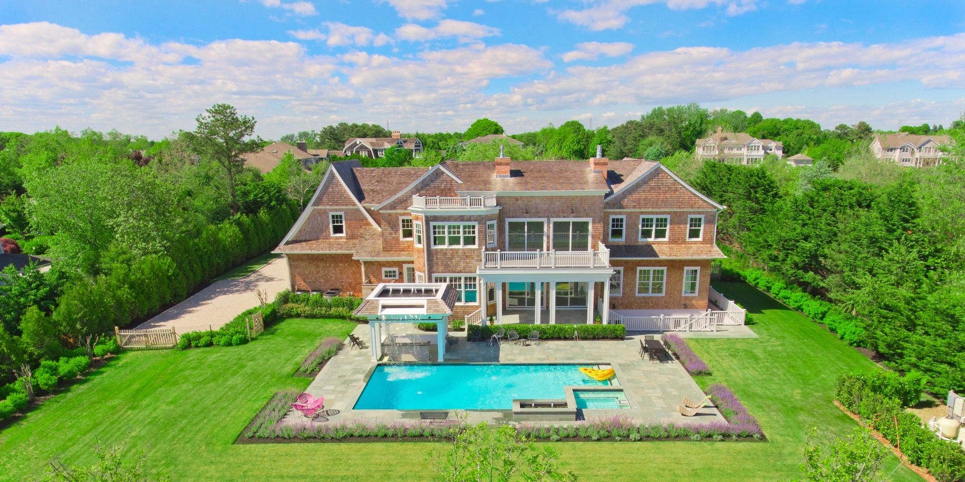 A stunning masterpiece, south of the highway with all the estate amenities generally found at higher price points. This home has them all, with a modern layout open spaces and filled with light, 8 large bedrooms with high ceilings, 9.5 baths, gourmet eat-in kitchen, formal dining room and living room. Every attention including outdoor entertaining areas with relaxing zen resort feel, includes Heated gunite 20X40 pool with waterfall features and spa pool, pool bar, LED lighting and gas fire pit all controllable from your smart phone. Immaculate grounds with room for tennis complete this package. This is a must see.
