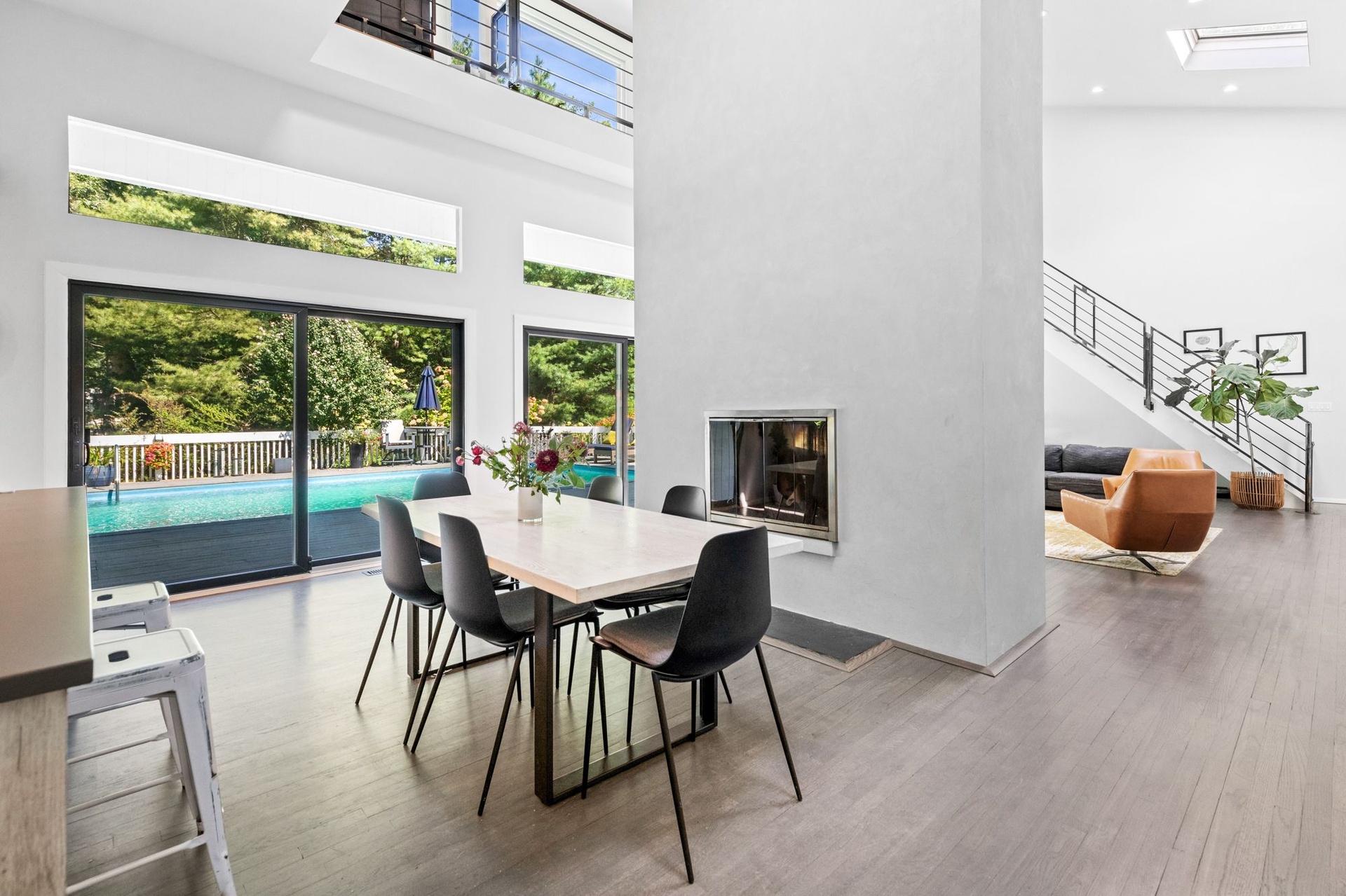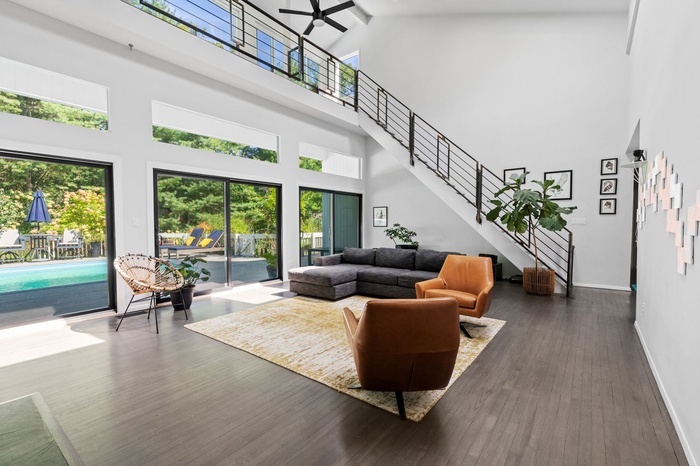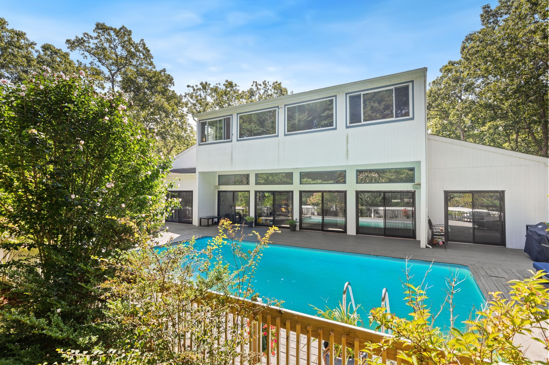 The heated pool and large deck are accessed directly from the main living space, offering unparalleled indoor/outdoor living and entertaining.