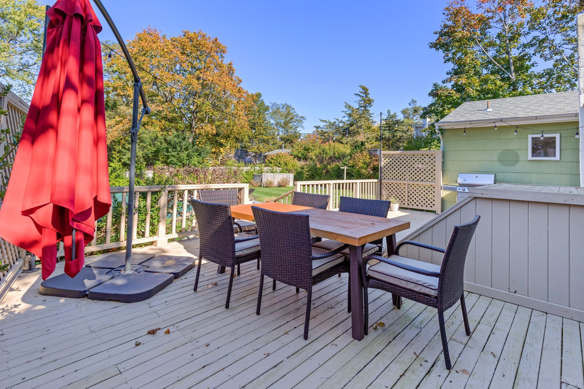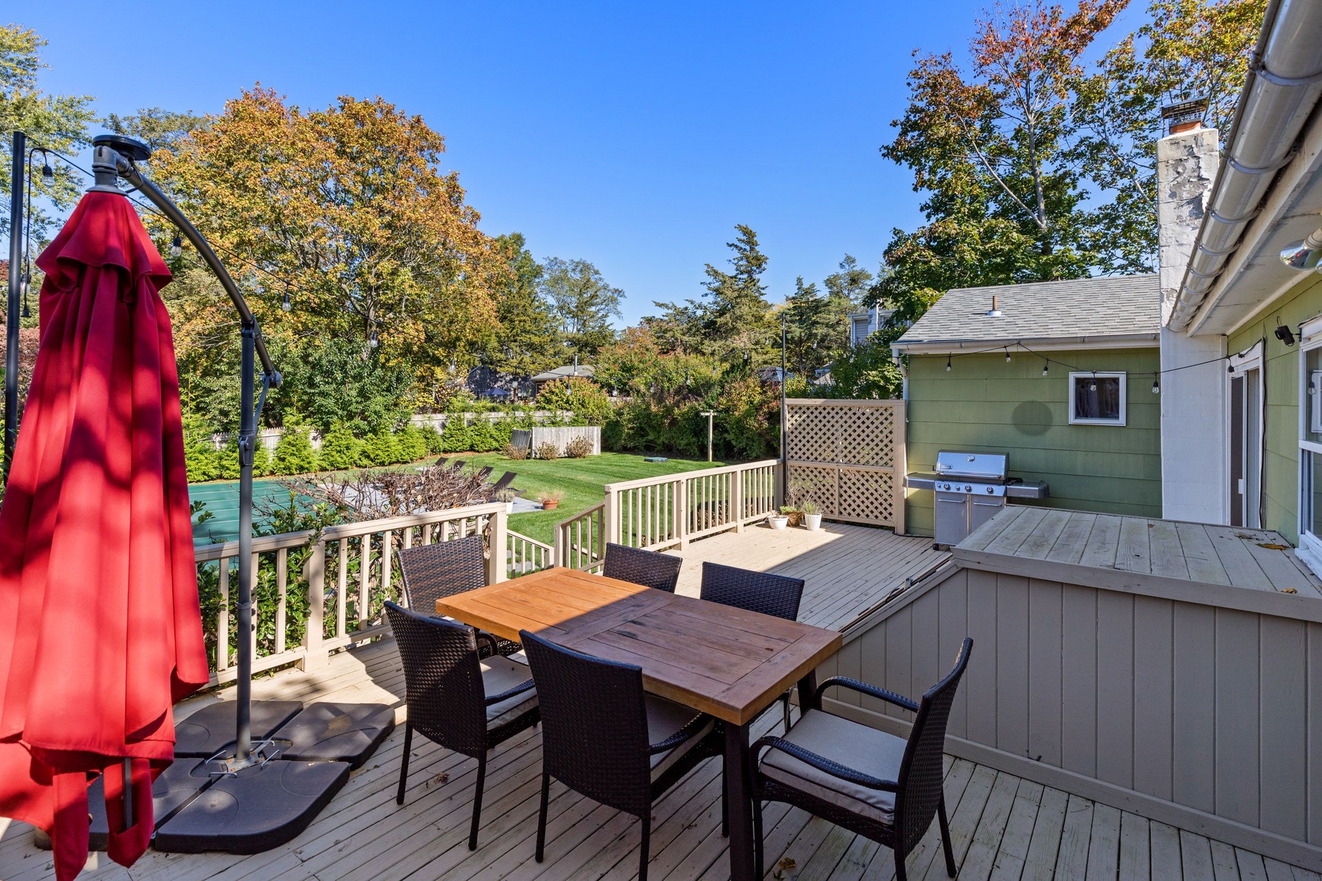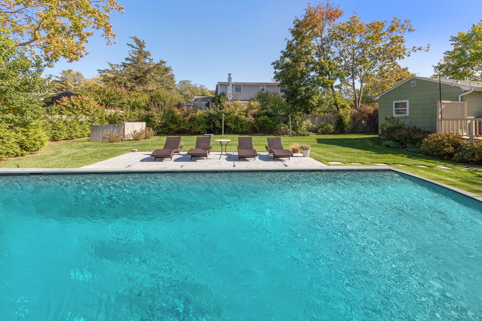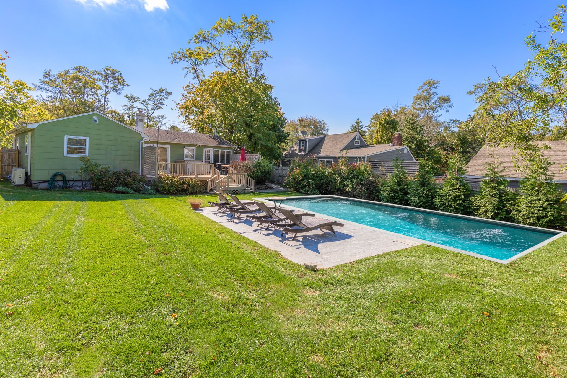 Enjoy your private yard with friends and family with an oversized saltwater heated swimming pool installed in 2021, an outdoor dining area with BBQ, and an outdoor hot shower. Lush landscaping and mature trees surround the property to ensure ultimate privacy.