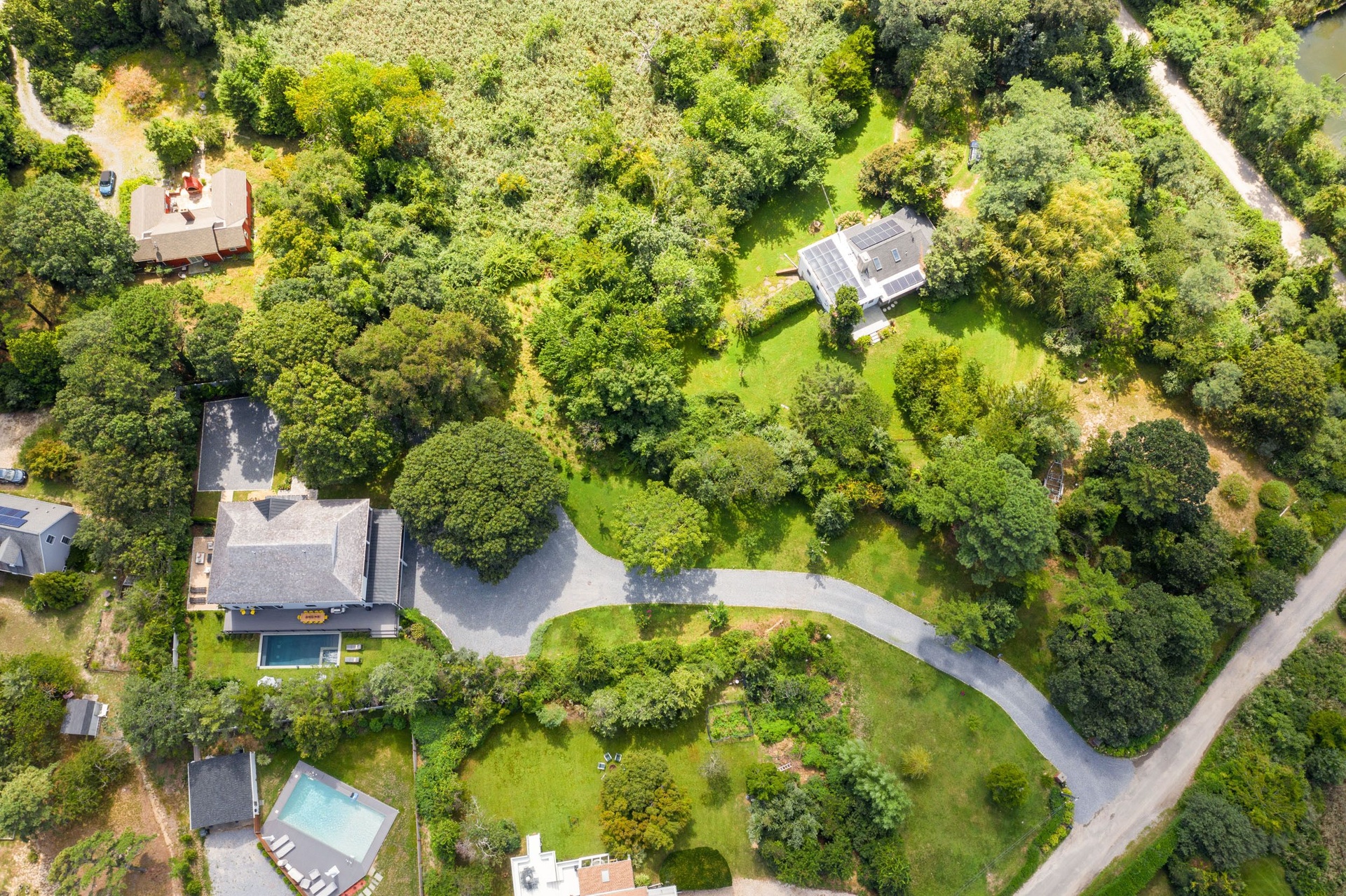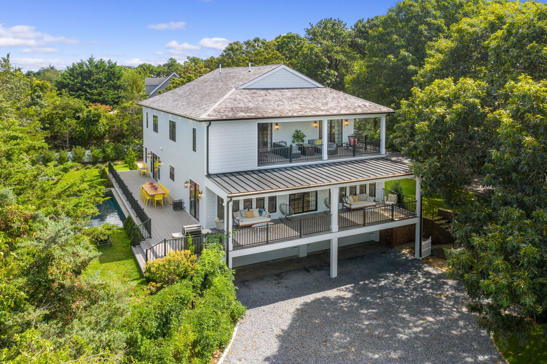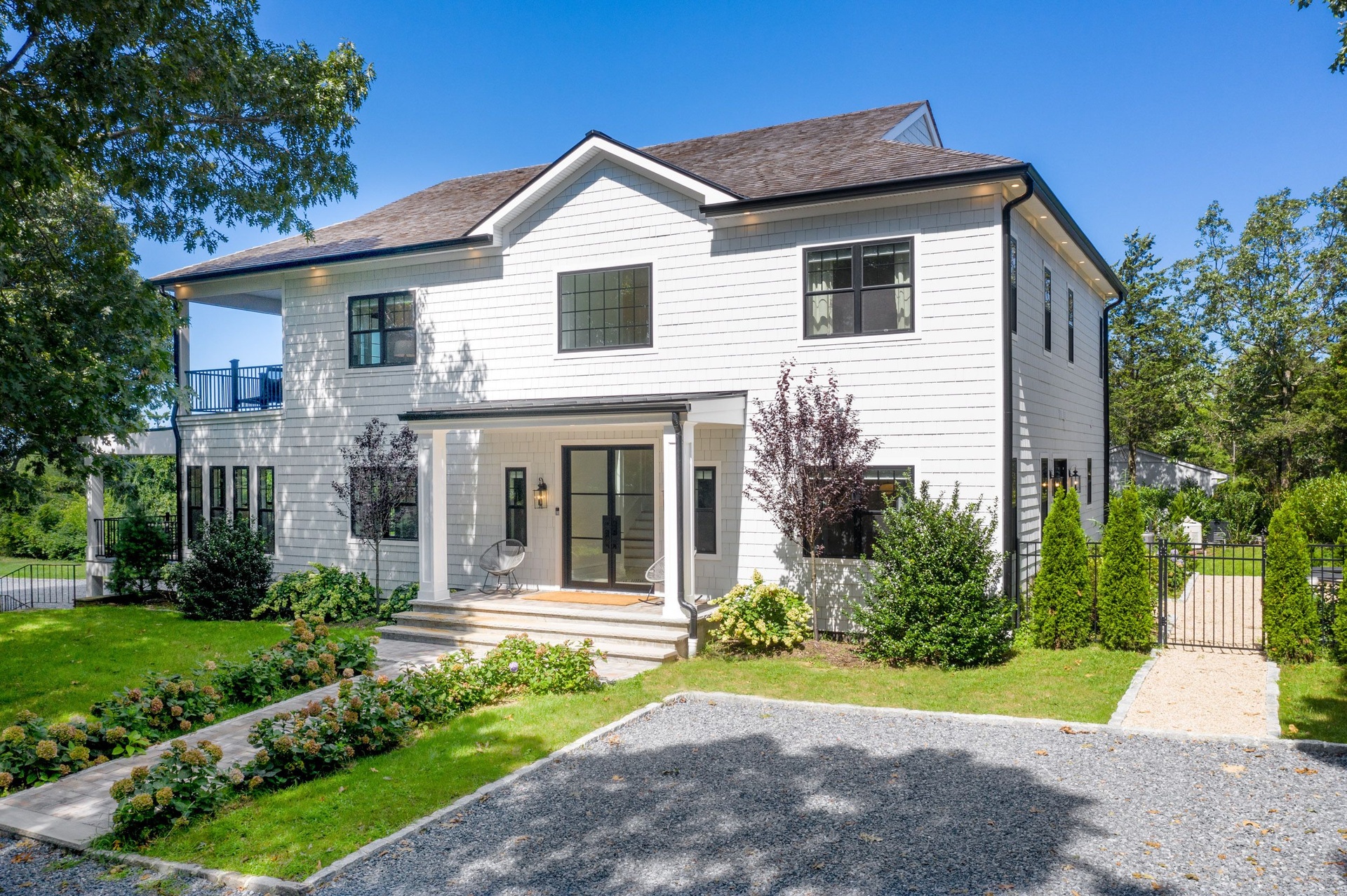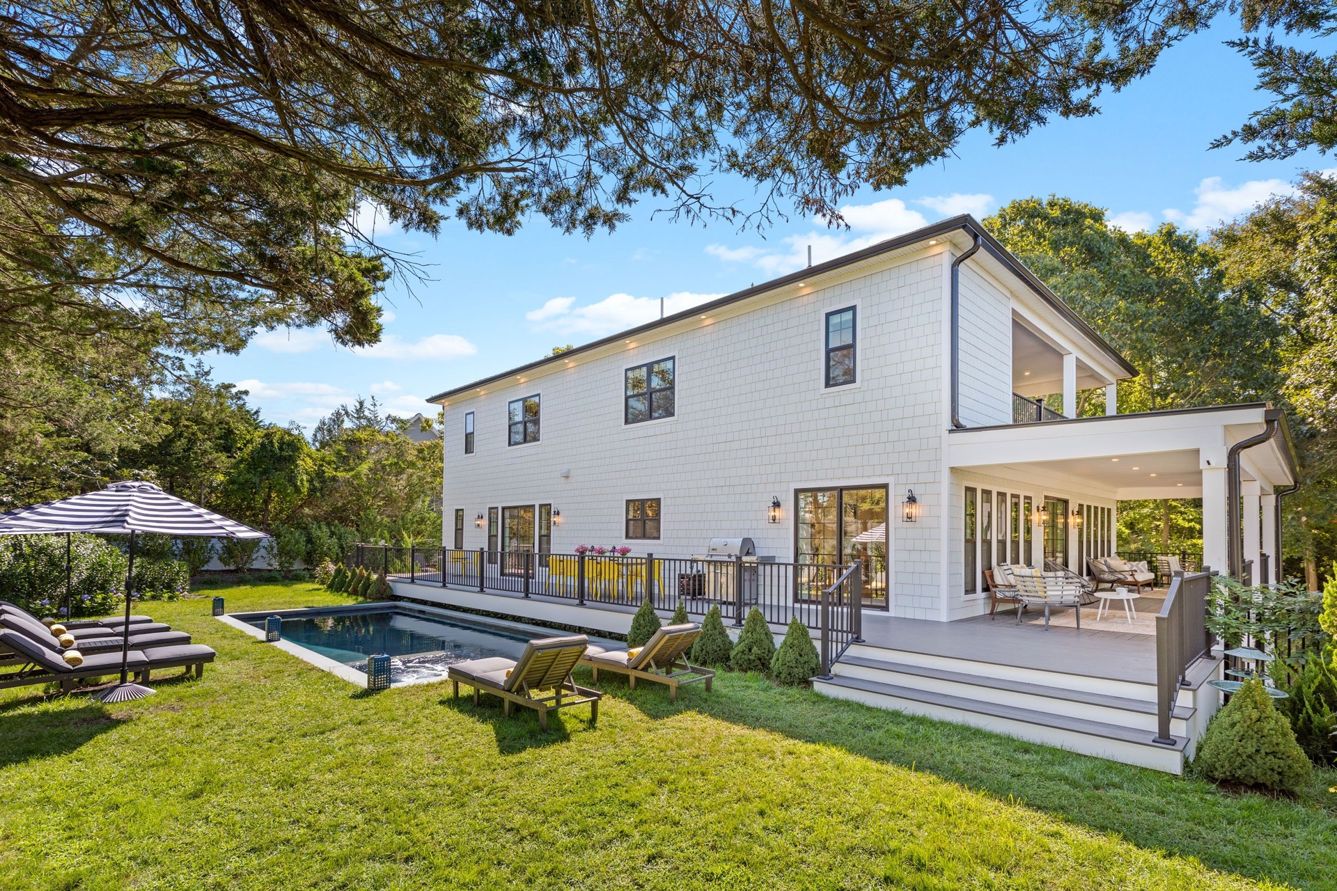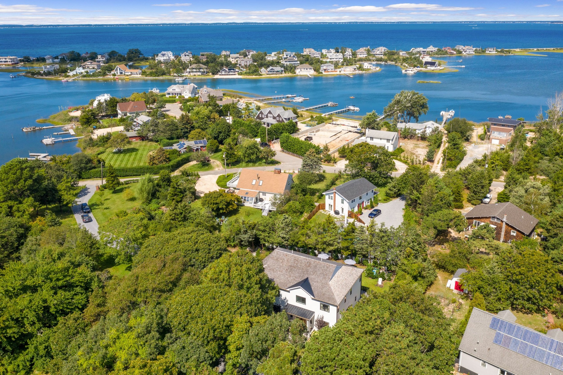 The long driveway takes you through the 1.6 acres of park like grounds, that lead to this enchanting home nicknamed "The Treehouse". Surrounded by nature, this completely renovated, three level home offers everything you will need in a Hamptons getaway. Enter the main level through the steel and glass double doors that open to a soaring double height foyer with custom woodwork throughout the walls and ceiling. The main level was deigned for entertainment so each room effortlessly flows both indoors and outdoors, offering plenty of space to gather. The living room is anchored by a commanding, custom made, gas fireplace which creates a cozy atmosphere in a space that offers plenty of room to spread out and relax. The completely open, custom kitchen comes equipped with all high-end appliances including a 48 inch built-in fridge, two dishwashers, a wine fridge, built-in microwave, two wall ovens, a plumbed Miele coffee maker, and a six burner gas cooktop. This is finished with an over 9 foot quartz waterfall island with cabinet storage on both sides. A separate formal dining, with wet bar, is directly off the kitchen for those special occasions. Finishing the main level is a guest suite, with custom closets, an en-suite bathroom, and a private courtyard. On the second level, you'll find the primary suite, which is the entire left wing of the home. It includes another custom built gas fireplace, two custom closets, an en-suite bathroom featuring a soaking tub, double vanity, and a double walk-in shower. This suite also includes a private deck that overlooks the treetops, with views of Peconic Bay that are perfect for the most beautiful sunsets. The right wing includes two guest bedrooms, a full bathroom with walk-in shower and soaking tub, and a laundry room with two washers and dryers. Down the staircase to the lower level you'll enter the full bar which features another quartz island, bar fridge, wine fridge, and ice maker. Off the bar, you can enter the 4 car garage that also includes a giant storage room. Off the other side of the bar, you'll find the media room and the gym, which includes another full bathroom. The best part of the house waits for you outside where you'll find the gunite salt water pool with built-in spa. Decks wrap around two sides of the house and overlook the grounds, are perfect for outdoor dining or for lounging around in the morning. All of this is surrounded by Cold Spring Pond where you can enjoy swimming, water sports, and shellfishing, steps from your front door. Located just minutes from Southampton Village, restaurants, and award winning beaches.