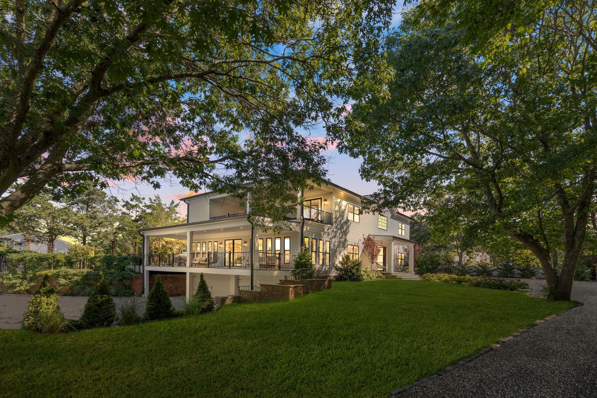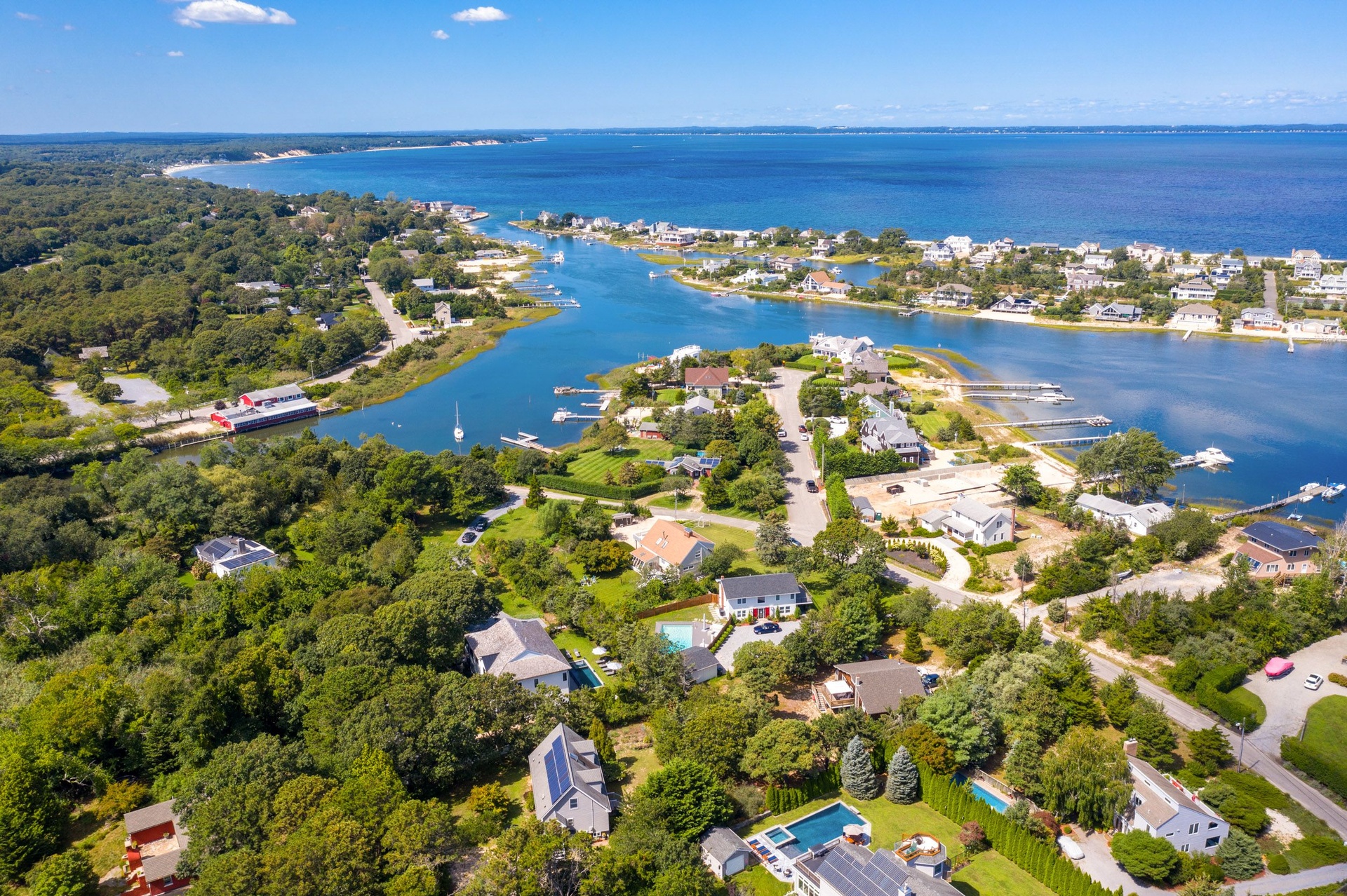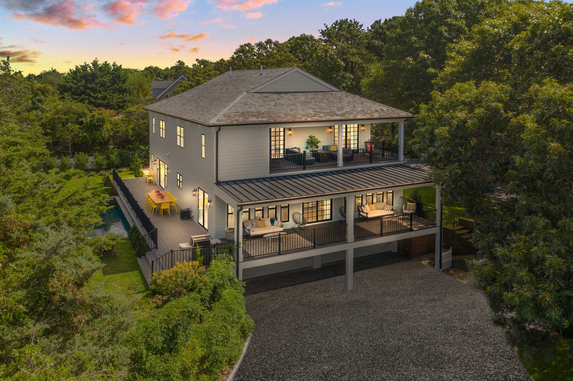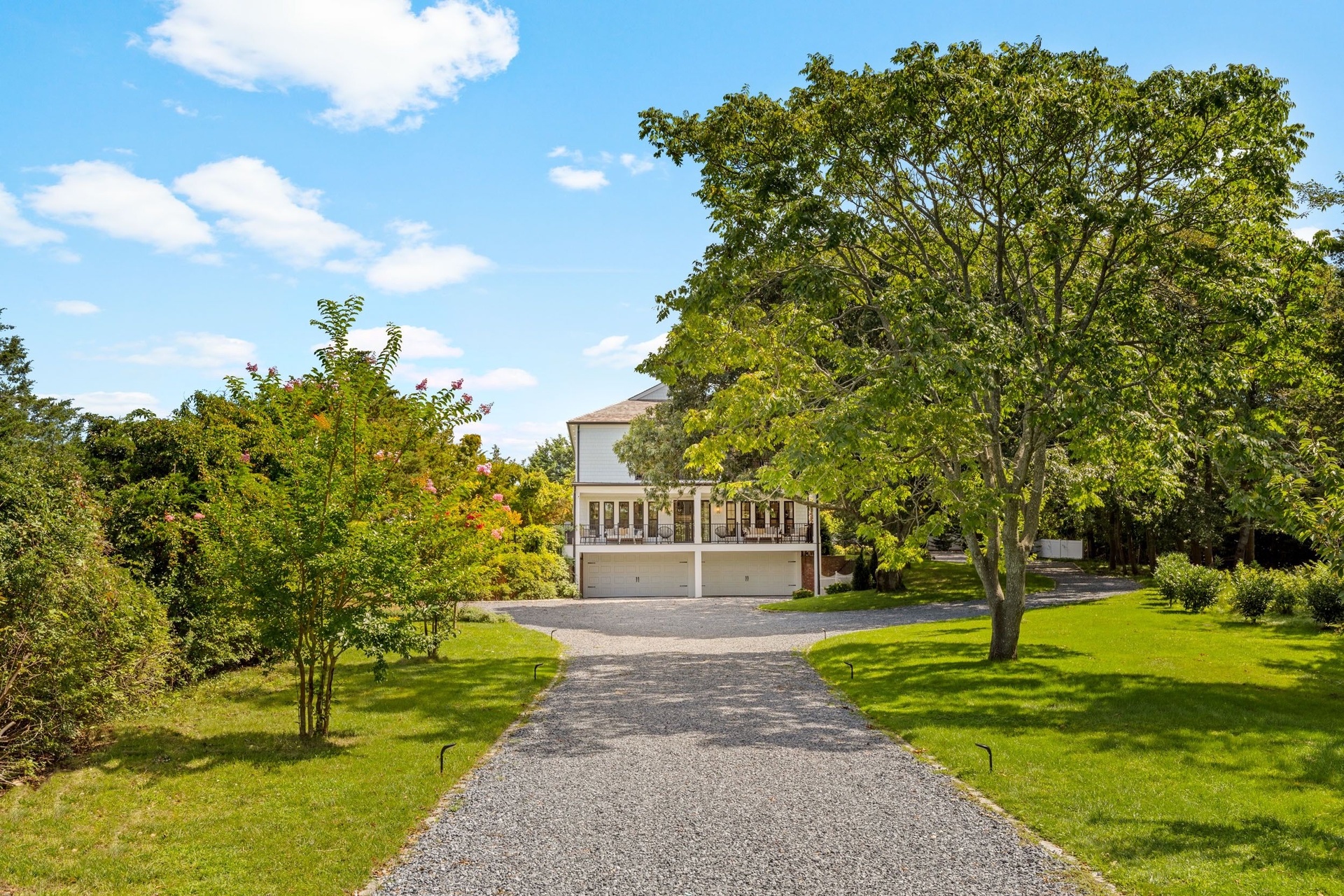 The long driveway takes you through the 1.6 acres of park like grounds, that lead to this enchanting home nicknamed "The Treehouse". Surrounded by nature, this completely renovated, three level home offers everything you will need in a Hamptons getaway. Enter the main level through the steel and glass double doors that open to a soaring double height foyer with custom woodwork throughout the walls and ceiling. The main level was deigned for entertainment so each room effortlessly flows both indoors and outdoors, offering plenty of space to gather. The living room is anchored by a commanding, custom made, gas fireplace which creates a cozy atmosphere in a space that offers plenty of room to spread out and relax. The completely open, custom kitchen comes equipped with all high-end appliances including a 48 inch built-in fridge, two dishwashers, a wine fridge, built-in microwave, two wall ovens, a plumbed Miele coffee maker, and a six burner gas cooktop. This is finished with an over 9 foot quartz waterfall island with cabinet storage on both sides. A separate formal dining, with wet bar, is directly off the kitchen for those special occasions. Finishing the main level is a guest suite, with custom closets, an en-suite bathroom, and a private courtyard. On the second level, you'll find the primary suite, which is the entire left wing of the home. It includes another custom built gas fireplace, two custom closets, an en-suite bathroom featuring a soaking tub, double vanity, and a double walk-in shower. This suite also includes a private deck that overlooks the treetops, with views of Peconic Bay that are perfect for the most beautiful sunsets. The right wing includes two guest bedrooms, a full bathroom with walk-in shower and soaking tub, and a laundry room with two washers and dryers. Down the staircase to the lower level you'll enter the full bar which features another quartz island, bar fridge, wine fridge, and ice maker. Off the bar, you can enter the 4 car garage that also includes a giant storage room. Off the other side of the bar, you'll find the media room and the gym, which includes another full bathroom. The best part of the house waits for you outside where you'll find the gunite salt water pool with built-in spa. Decks wrap around two sides of the house and overlook the grounds, are perfect for outdoor dining or for lounging around in the morning. All of this is surrounded by Cold Spring Pond where you can enjoy swimming, water sports, and shellfishing, steps from your front door. Located just minutes from Southampton Village, restaurants, and award winning beaches.