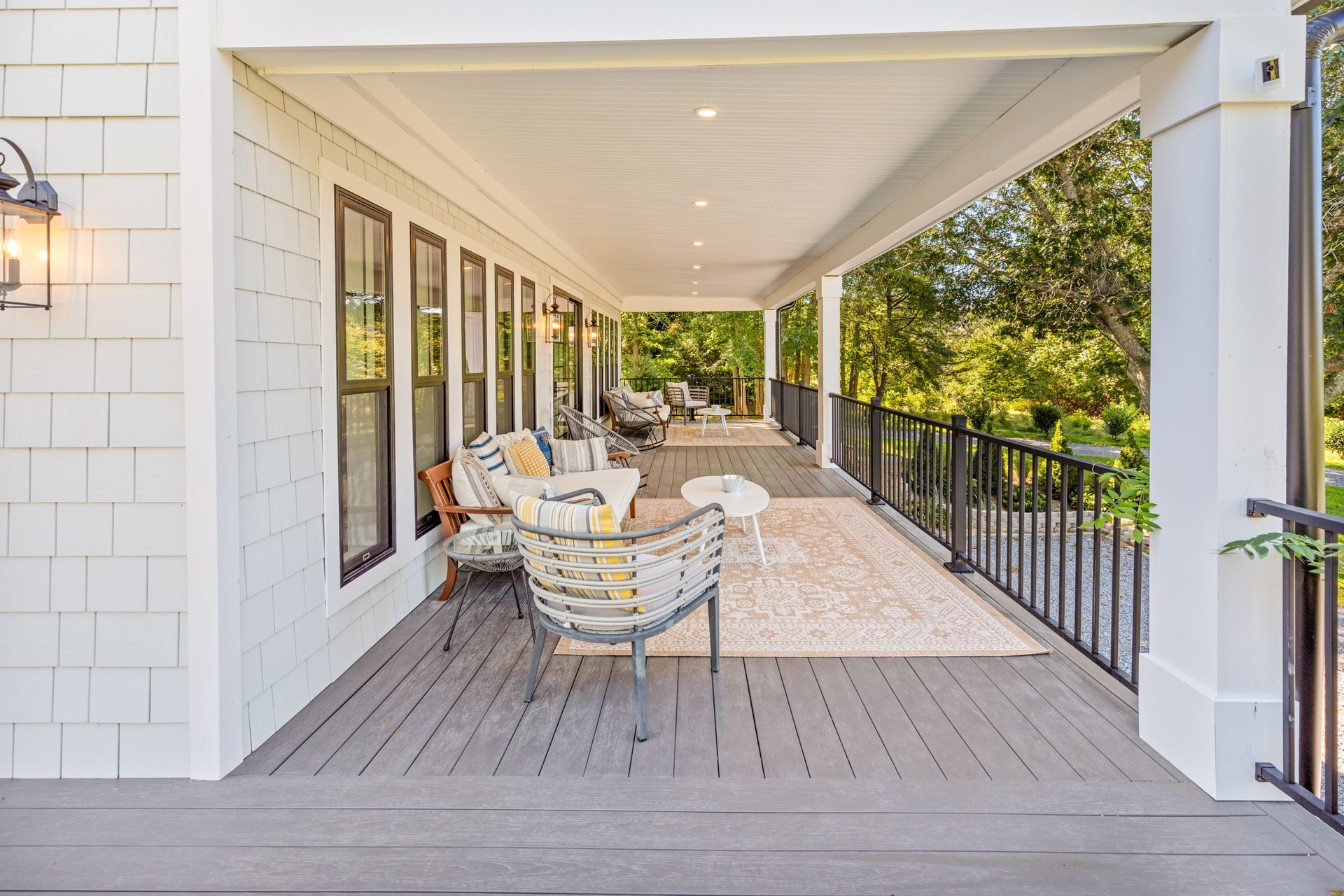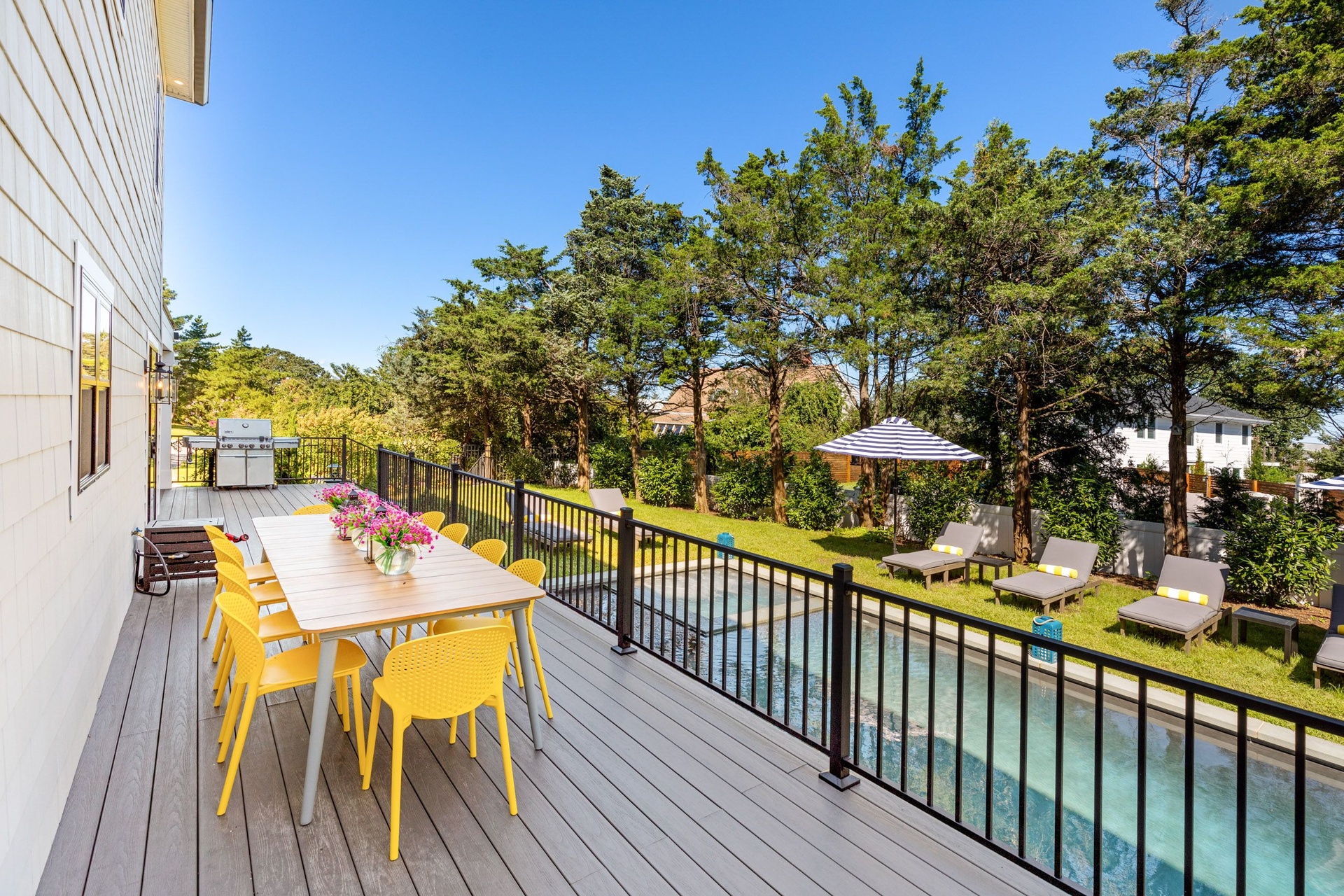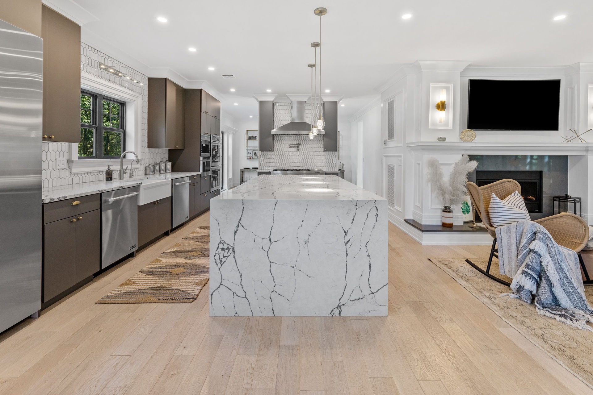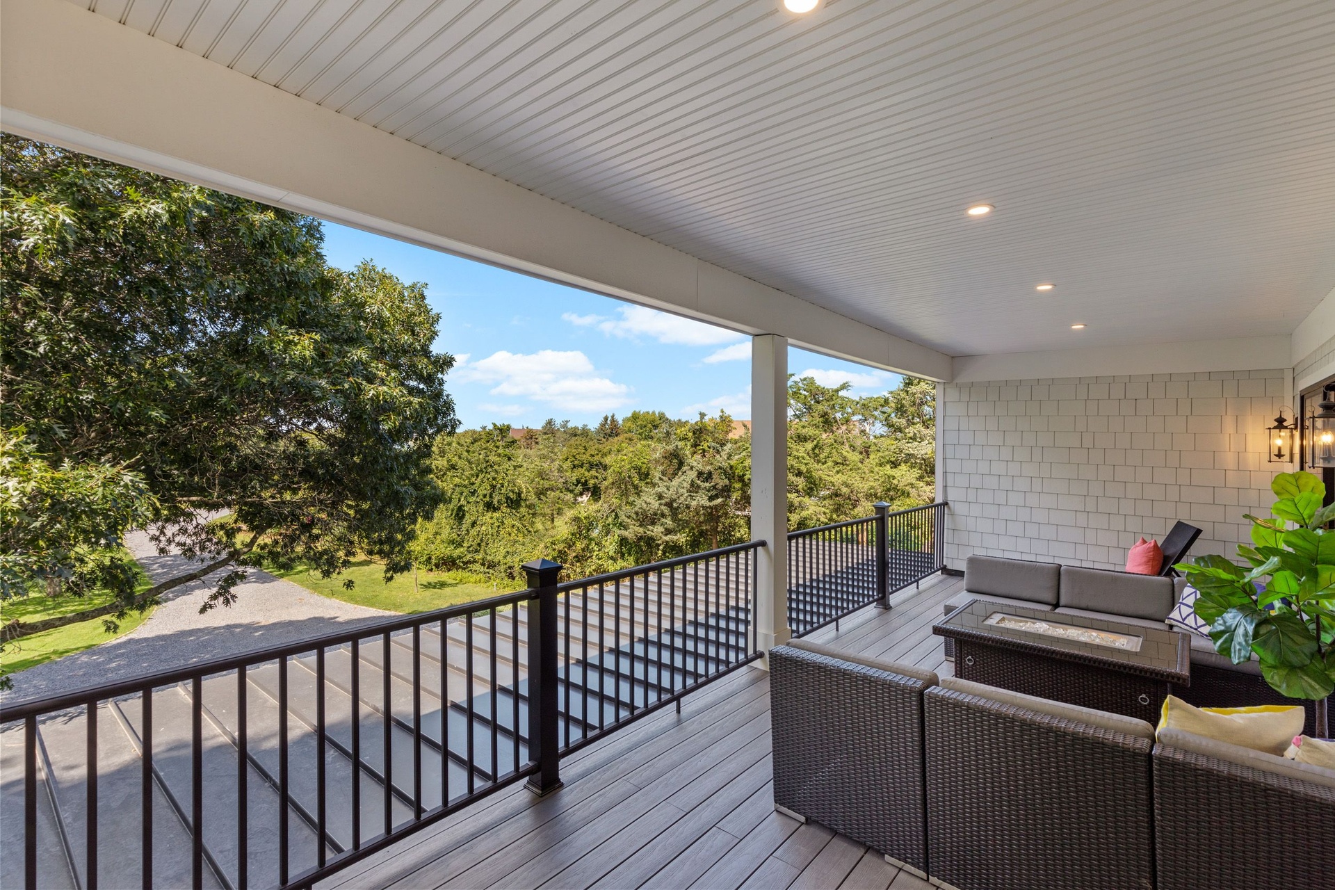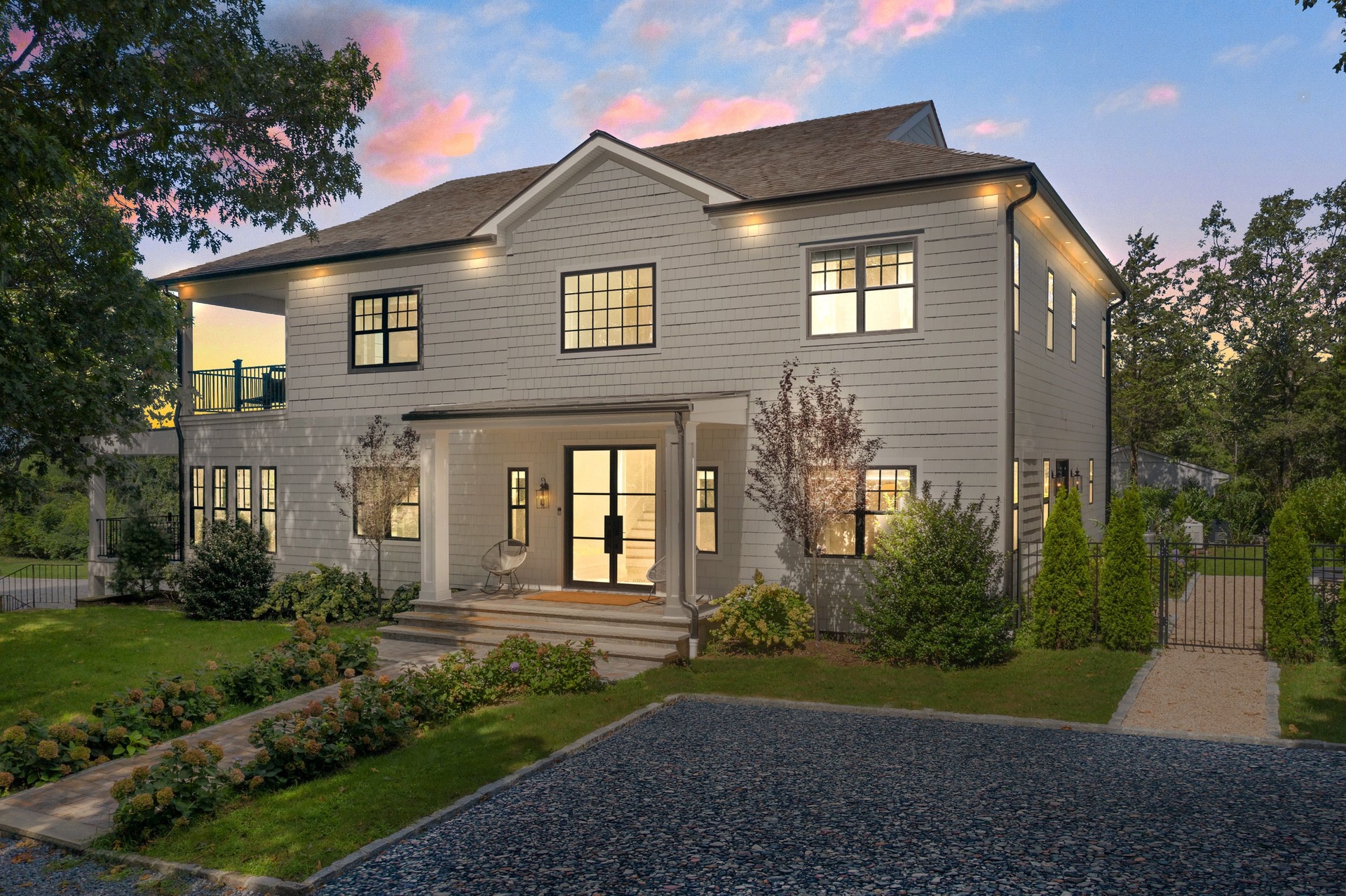 The long driveway takes you through the 1.6 acres of park like grounds, that lead to this enchanting home nicknamed "The Treehouse". Surrounded by nature, this completely renovated, three level home offers everything you will need in a Hamptons getaway. Enter the main level through the steel and glass double doors that open to a soaring double height foyer with custom woodwork throughout the walls and ceiling. The main level was deigned for entertainment so each room effortlessly flows both indoors and outdoors, offering plenty of space to gather. The living room is anchored by a commanding, custom made, gas fireplace which creates a cozy atmosphere in a space that offers plenty of room to spread out and relax. The completely open, custom kitchen comes equipped with all high-end appliances including a 48 inch built-in fridge, two dishwashers, a wine fridge, built-in microwave, two wall ovens, a plumbed Miele coffee maker, and a six burner gas cooktop. This is finished with an over 9 foot quartz waterfall island with cabinet storage on both sides. A separate formal dining, with wet bar, is directly off the kitchen for those special occasions. Finishing the main level is a guest suite, with custom closets, an en-suite bathroom, and a private courtyard. On the second level, you'll find the primary suite, which is the entire left wing of the home. It includes another custom built gas fireplace, two custom closets, an en-suite bathroom featuring a soaking tub, double vanity, and a double walk-in shower. This suite also includes a private deck that overlooks the treetops, with views of Peconic Bay that are perfect for the most beautiful sunsets. The right wing includes two guest bedrooms, a full bathroom with walk-in shower and soaking tub, and a laundry room with two washers and dryers. Down the staircase to the lower level you'll enter the full bar which features another quartz island, bar fridge, wine fridge, and ice maker. Off the bar, you can enter the 4 car garage that also includes a giant storage room. Off the other side of the bar, you'll find the media room and the gym, which includes another full bathroom. The best part of the house waits for you outside where you'll find the gunite salt water pool with built-in spa. Decks wrap around two sides of the house and overlook the grounds, are perfect for outdoor dining or for lounging around in the morning. All of this is surrounded by Cold Spring Pond where you can enjoy swimming, water sports, and shellfishing, steps from your front door. Located just minutes from Southampton Village, restaurants, and award winning beaches.