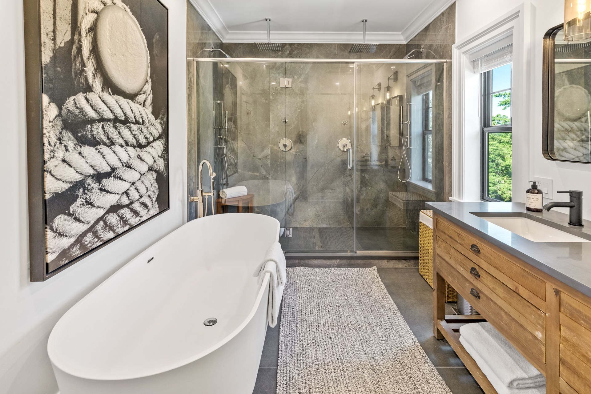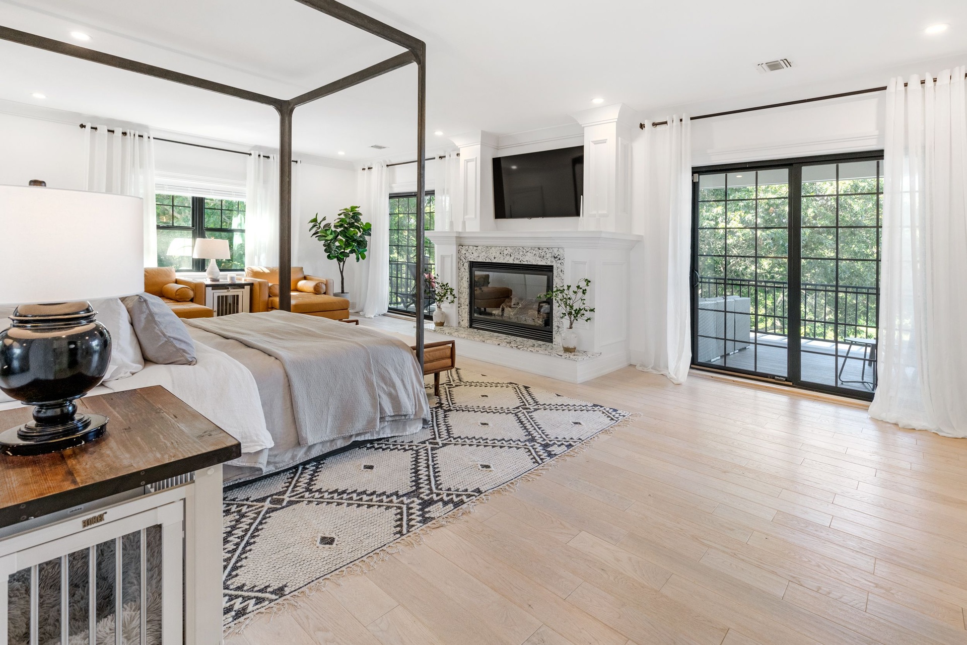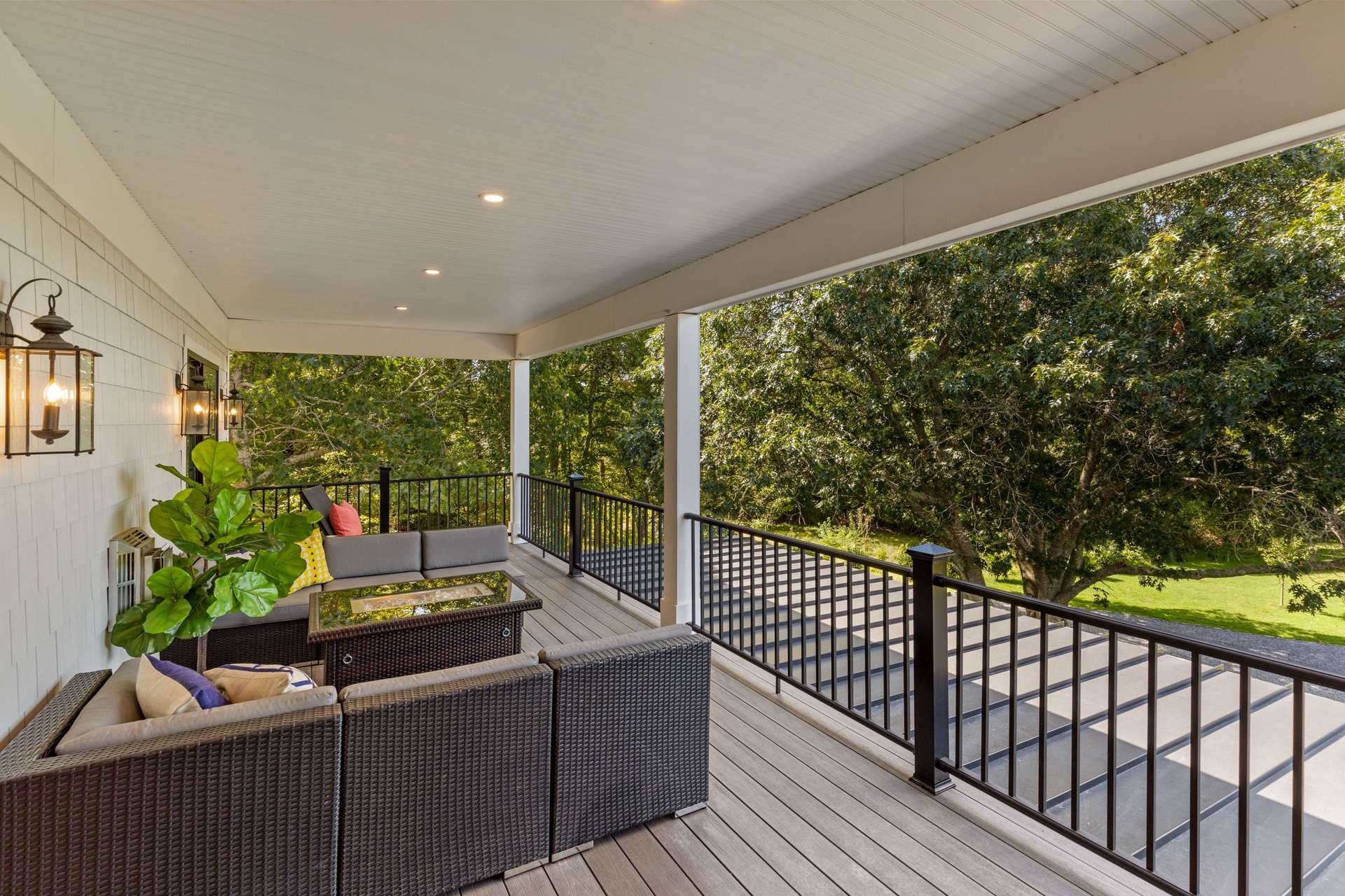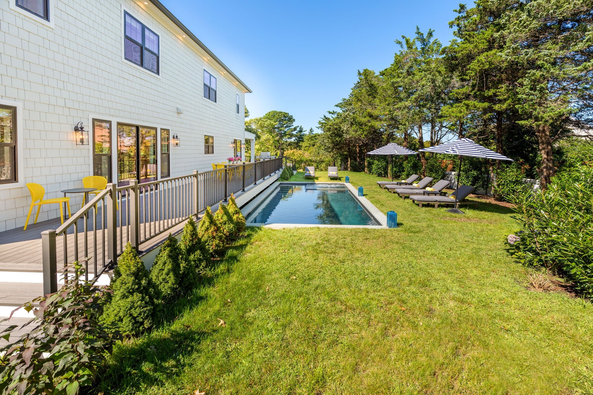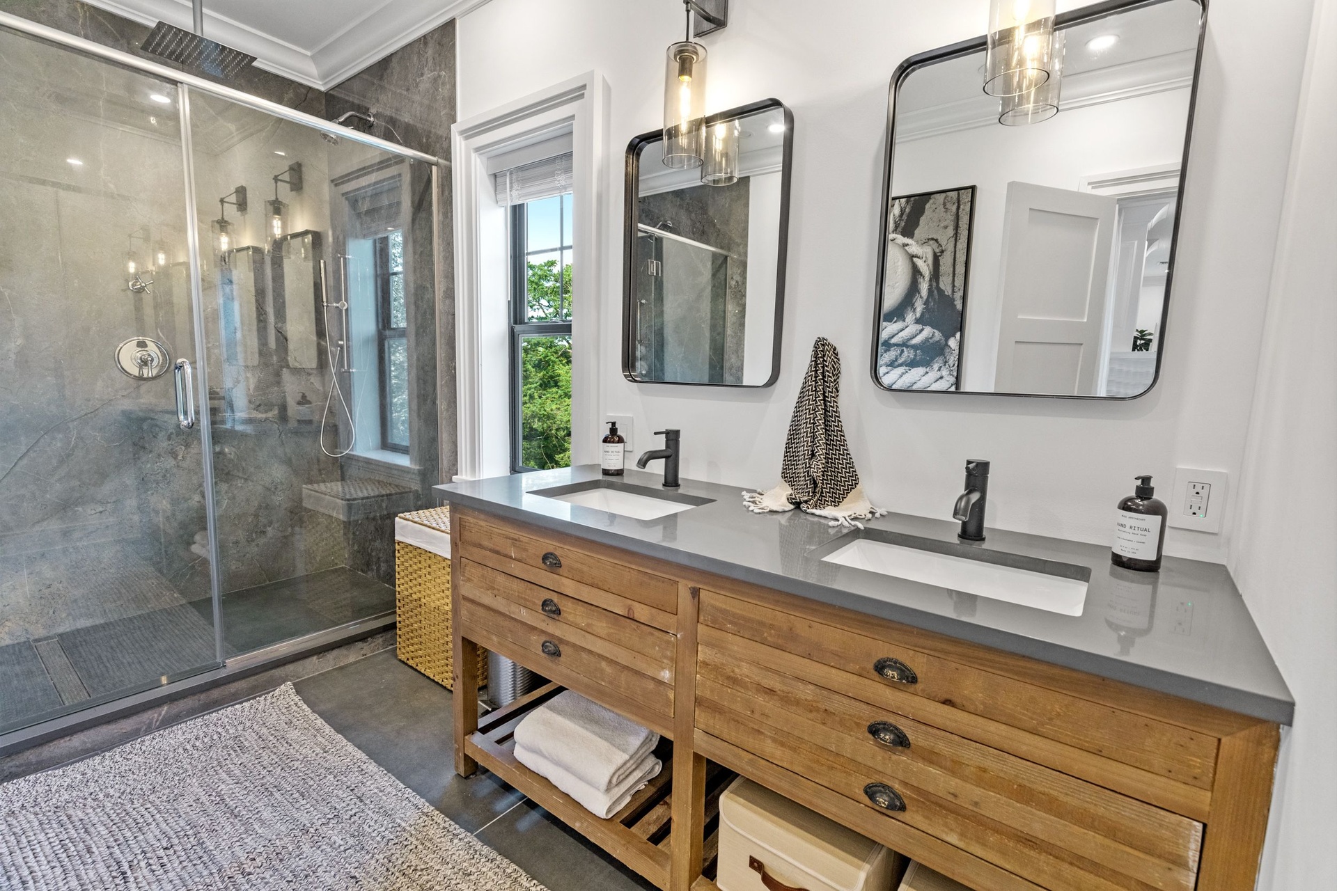 The long driveway takes you through the 1.6 acres of park like grounds, that lead to this enchanting home nicknamed "The Treehouse". Surrounded by nature, this completely renovated, three level home offers everything you will need in a Hamptons getaway. Enter the main level through the steel and glass double doors that open to a soaring double height foyer with custom woodwork throughout the walls and ceiling. The main level was deigned for entertainment so each room effortlessly flows both indoors and outdoors, offering plenty of space to gather. The living room is anchored by a commanding, custom made, gas fireplace which creates a cozy atmosphere in a space that offers plenty of room to spread out and relax. The completely open, custom kitchen comes equipped with all high-end appliances including a 48 inch built-in fridge, two dishwashers, a wine fridge, built-in microwave, two wall ovens, a plumbed Miele coffee maker, and a six burner gas cooktop. This is finished with an over 9 foot quartz waterfall island with cabinet storage on both sides. A separate formal dining, with wet bar, is directly off the kitchen for those special occasions. Finishing the main level is a guest suite, with custom closets, an en-suite bathroom, and a private courtyard. On the second level, you'll find the primary suite, which is the entire left wing of the home. It includes another custom built gas fireplace, two custom closets, an en-suite bathroom featuring a soaking tub, double vanity, and a double walk-in shower. This suite also includes a private deck that overlooks the treetops, with views of Peconic Bay that are perfect for the most beautiful sunsets. The right wing includes two guest bedrooms, a full bathroom with walk-in shower and soaking tub, and a laundry room with two washers and dryers. Down the staircase to the lower level you'll enter the full bar which features another quartz island, bar fridge, wine fridge, and ice maker. Off the bar, you can enter the 4 car garage that also includes a giant storage room. Off the other side of the bar, you'll find the media room and the gym, which includes another full bathroom. The best part of the house waits for you outside where you'll find the gunite salt water pool with built-in spa. Decks wrap around two sides of the house and overlook the grounds, are perfect for outdoor dining or for lounging around in the morning. All of this is surrounded by Cold Spring Pond where you can enjoy swimming, water sports, and shellfishing, steps from your front door. Located just minutes from Southampton Village, restaurants, and award winning beaches.