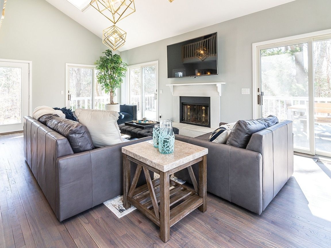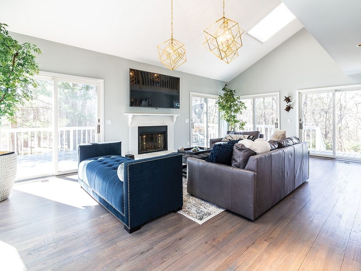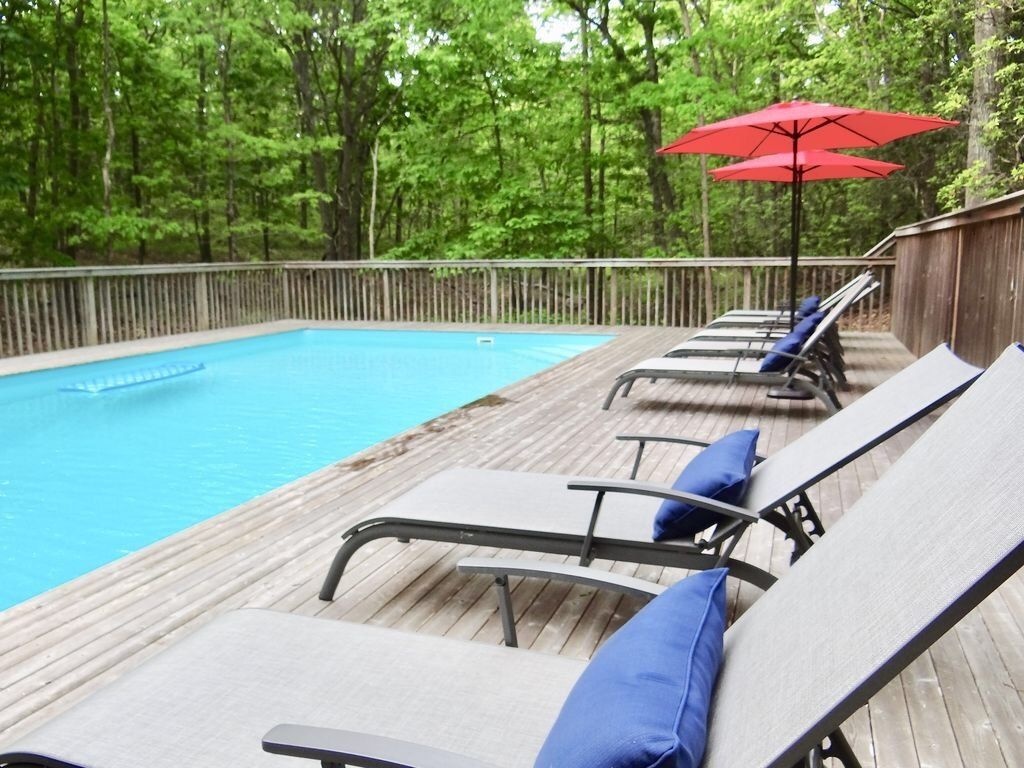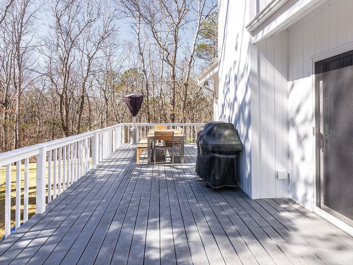 An incredible contemporary home with a heated pool sits on 1.70 acres. Fully furnished and beautifully decorated to make you feel like you are living in luxury. It's central between the villages of East Hampton & Sag Harbor. It has high vaulted ceilings that brings in alot of light throughout the home. It has four bedrooms, three and half bathrooms, fireplace, & wraparound deck. This home is perfect for entertaining and hosting. There is a spacious eat-in kitchen, stainless appliances, marble countertop, formal dining room, a library, two master suites on the first floor, laundry room, and finished basement. The outside is simply beautiful! The yard is well kept, lots of time went into the gardening. The stairs leading down to the pool makes you feel like you're in paradise. Pool heater is less than 2 years old, pool is vinyl. 3 zones AC 1 upstairs, 2 down stairs. Has a soft water system and auto sprinklers.