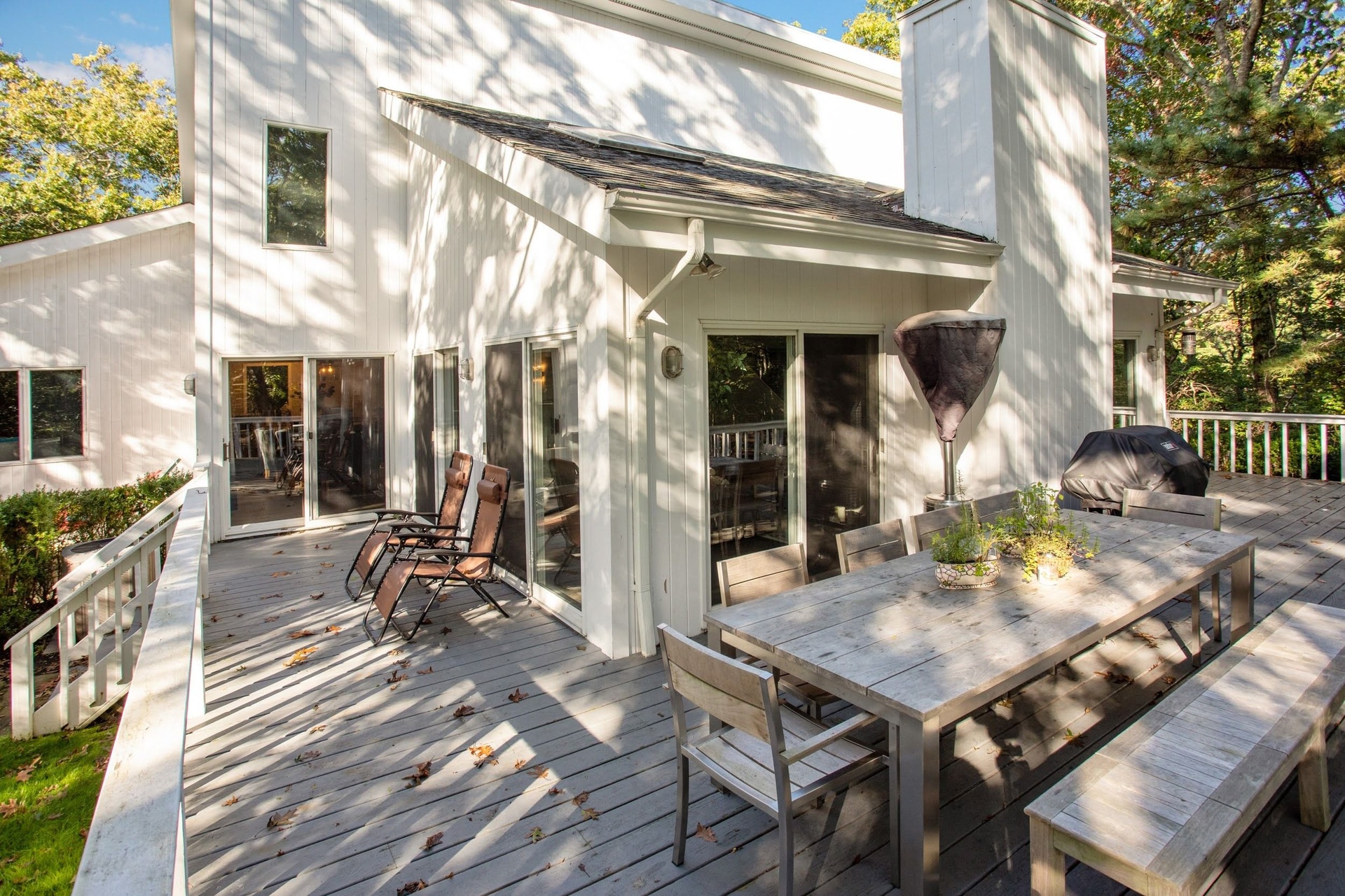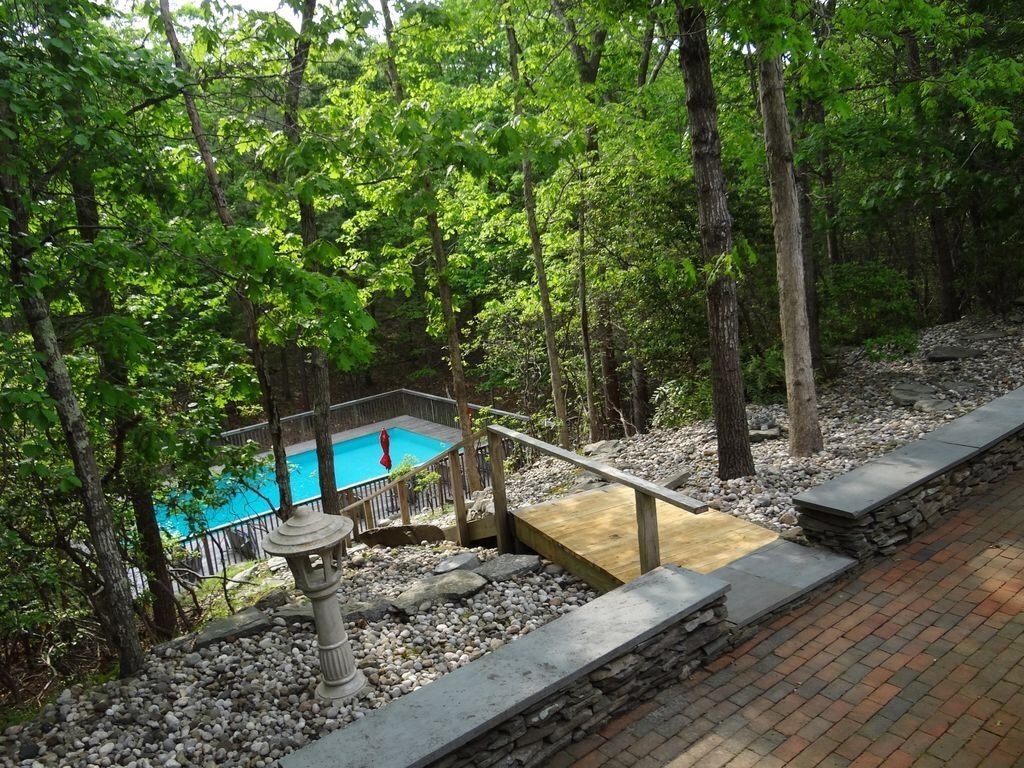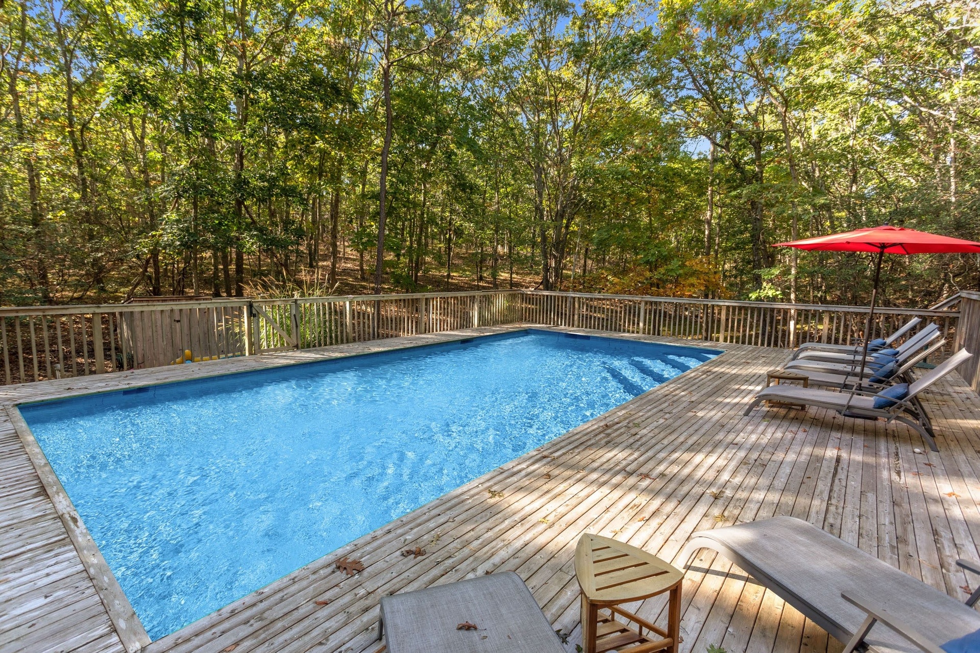 An incredible contemporary home with a heated pool sits on 1.70 acres. Fully furnished and beautifully decorated to make you feel like you are living in luxury. It's central between the villages of East Hampton & Sag Harbor. It has high vaulted ceilings that brings in alot of light throughout the home. It has four bedrooms, three and half bathrooms, fireplace, & wraparound deck. This home is perfect for entertaining and hosting. There is a spacious eat-in kitchen, stainless appliances, marble countertop, formal dining room, a library, two master suites on the first floor, laundry room, and finished basement. The outside is simply beautiful! The yard is well kept, lots of time went into the gardening. The stairs leading down to the pool makes you feel like you're in paradise. Pool heater is less than 2 years old, pool is vinyl. 3 zones AC 1 upstairs, 2 down stairs. Has a soft water system and auto sprinklers.