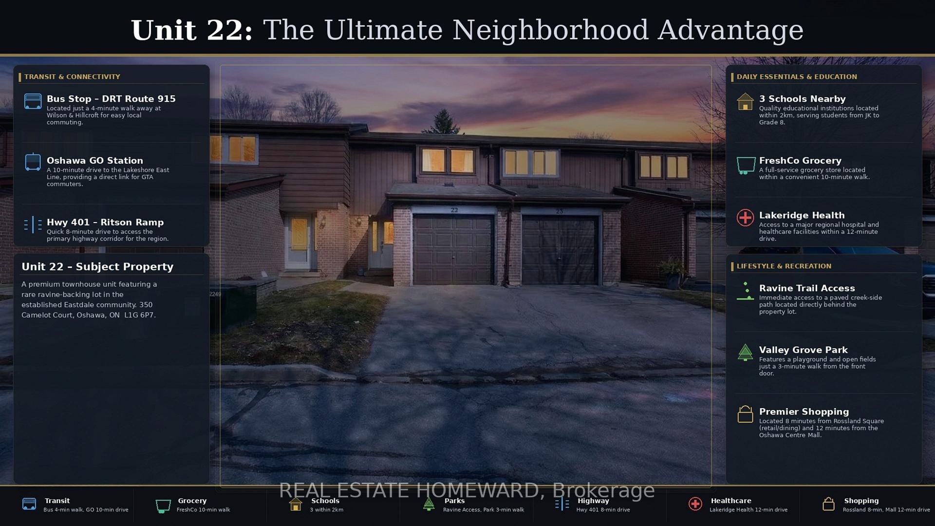 A Unique opportunity to own a spacious, well maintained and laid out Townhouse. Surrounded By Greenspace / Ravine / Walking Trails in the prime neighborhood of Eastdale, Close To Schools / Shopping / Public Transit / Minutes To Hwy 401 & 407, Costco, Shoppers drugmart and nofrills. This Family Oriented House Is in a Quiet complex- Located At The End Of A Cul-De-Sac. This Beautiful Unit Offers 3 Spacious Bedrooms with large windows allowing lots of daytime natural light. All Bedrooms have closets. 2 Bathrooms, Sliding Glass doors, Walk-Out To The Oversized Deck and A Sliding Glass Walk-Out From The Finished Basement leads to the fenced-In Back Yard Overlooking Greenspace - No Neighbors Behind.